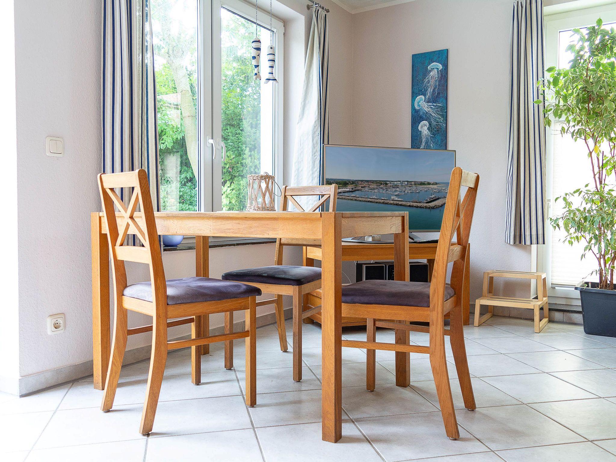 Der integrierte Essbereich bietet Ihnen reichlich Platz für gemeinsame Mahlzeiten und grenzt an die offene Küchenzeile. Die voll eingerichtete Küchenzeile hält für Sie alle wichtigen Küchengeräte und -utensilien bereit, die Sie für Ihr perfektes Dinner benötigen: Ein 4-Zonen-Cerankochfeld, ein Backofen mit Dunstabzug, ein Geschirrspüler, eine Mikrowelle sowie ein Kühlschrank mit Gefrierfach. Eine Kaffeemaschine, ein Wasserkocher und ein Toaster sowie genügend Koch- und Essgeschirr vervollständigen die Kücheneinrichtung.