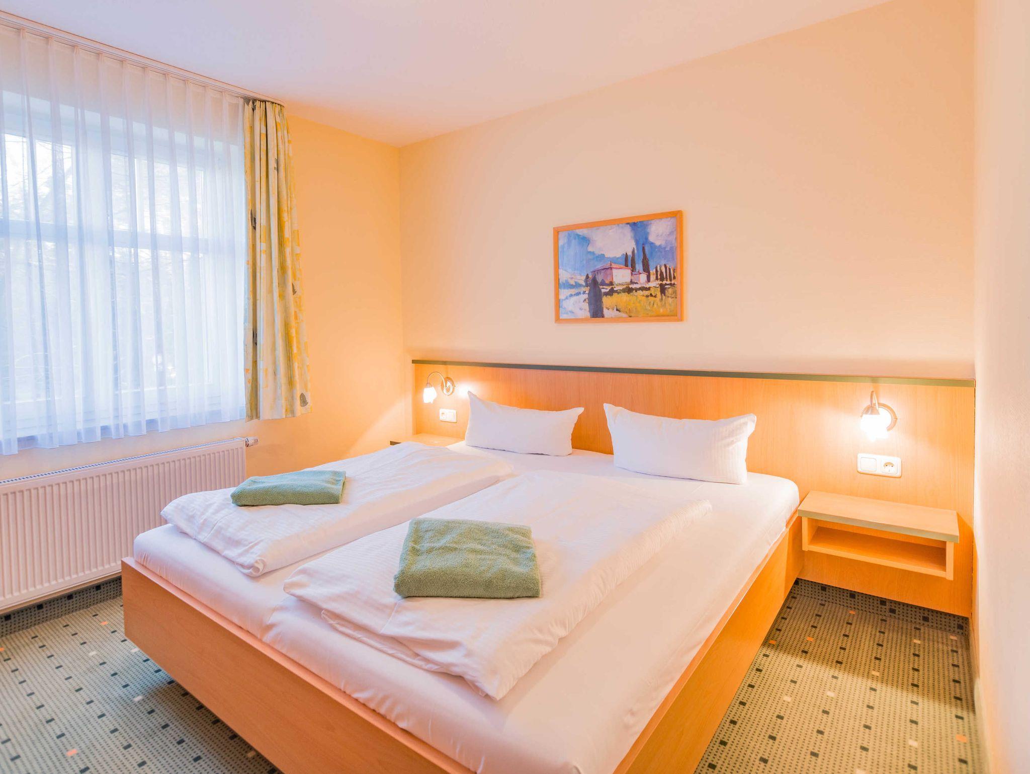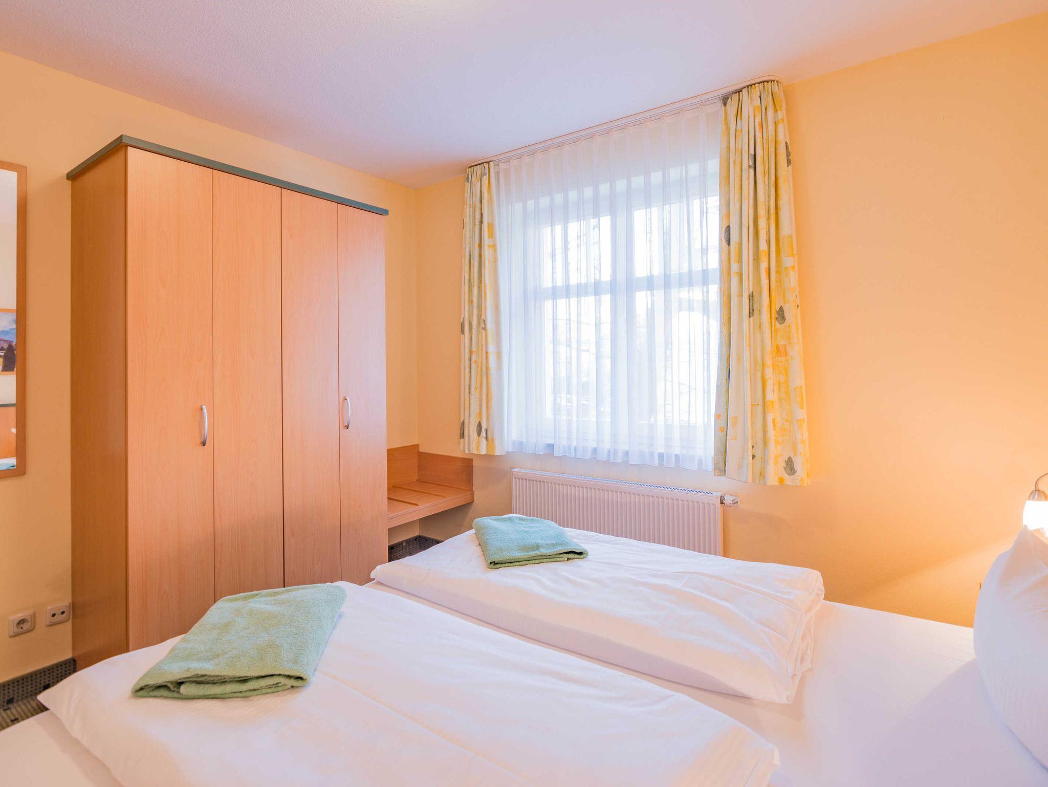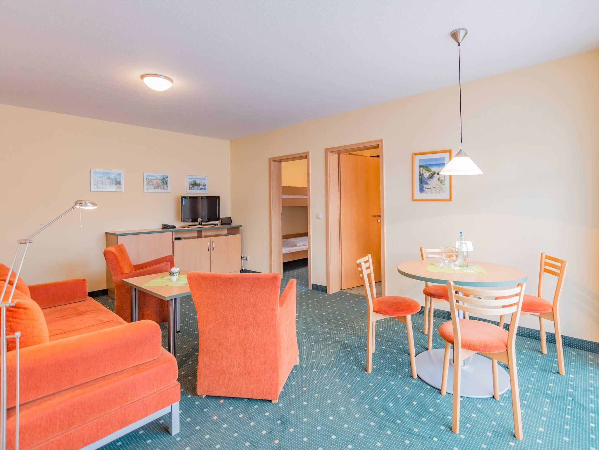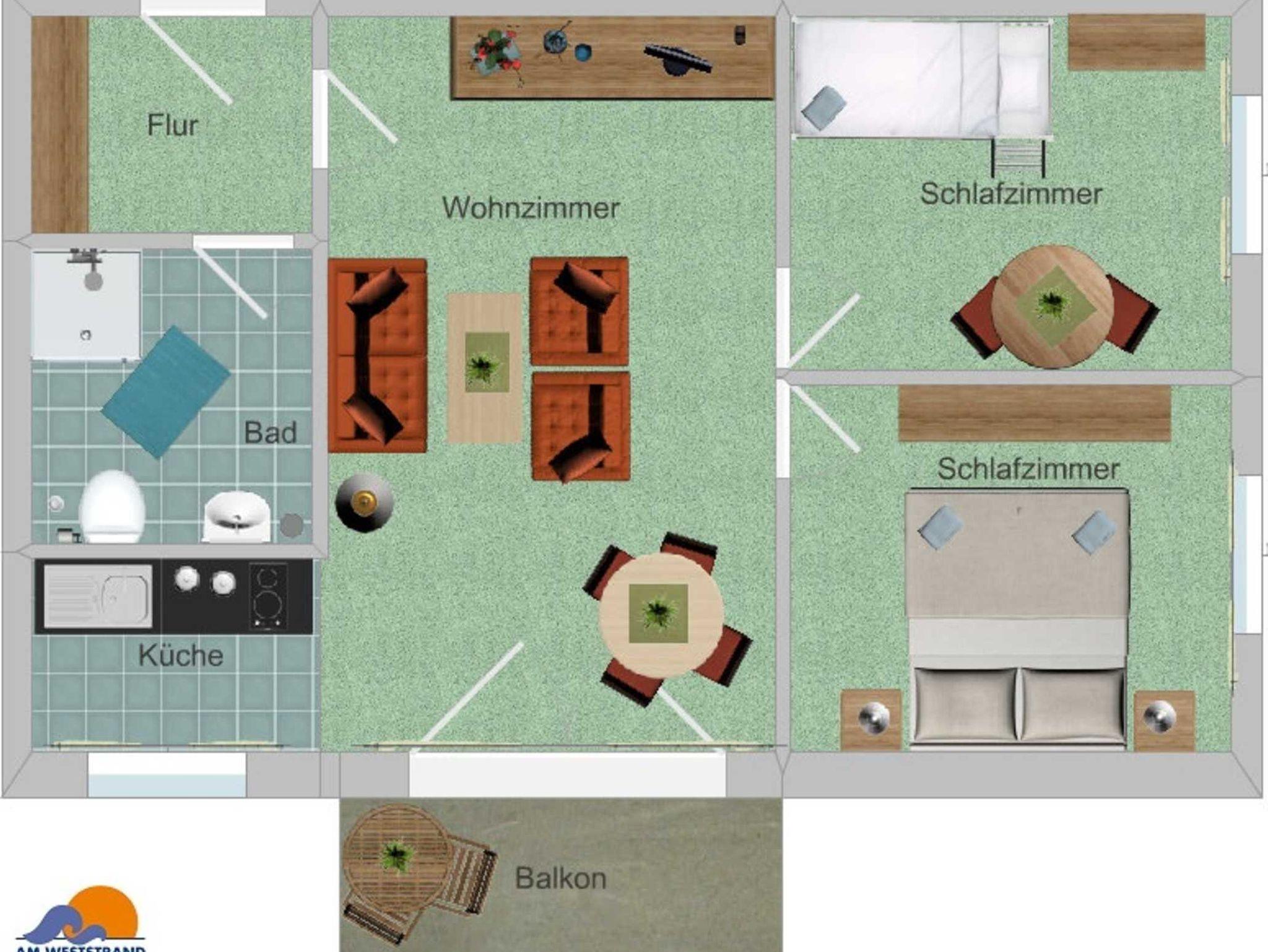 Das 3-Zimmer-Apartment mit Teppichboden befindet sich im 1. OG des Am Weststrand Apartmenthaus Bellamare. Mit ca. 55 m² Wohnfläche und einem Balkon zur sonnigen Südseite besteht das Apartment aus einem Wohnzimmer, zwei separaten Schlafzimmern, einer voll ausgestatteten Küchenzeile mit Geschirrspülmaschine, Kühlschrank, Mikrowelle, Zwei-Platten-Cerankochfeld, Kaffeemaschine, Wasserkocher und Toaster. Das eine Schlafzimmer verfügt über ein Doppelbett und das zweite Schlafzimmer ist mit einem Etagenbett ausgestattet. Im Wohnzimmer gibt es eine Sitzecke mit Couch und Sessel sowie einen Esstisch mit 4 Stühlen. Die Couch im Wohnzimmer ist ebenfalls ausklappbar und mit einer Größe von 1.40 x 2,00 m zum Schlafen für 1 bis 2 Personen geeignet. Weiterhin gibt es ein Bad mit Dusche, WC und Waschbecken sowie einen Flur. Das Apartment ist für maximal 3 Erwachsene und insgesamt 5 Personen geeignet. Haustiere sind in diesem Apartment nicht gestattet.