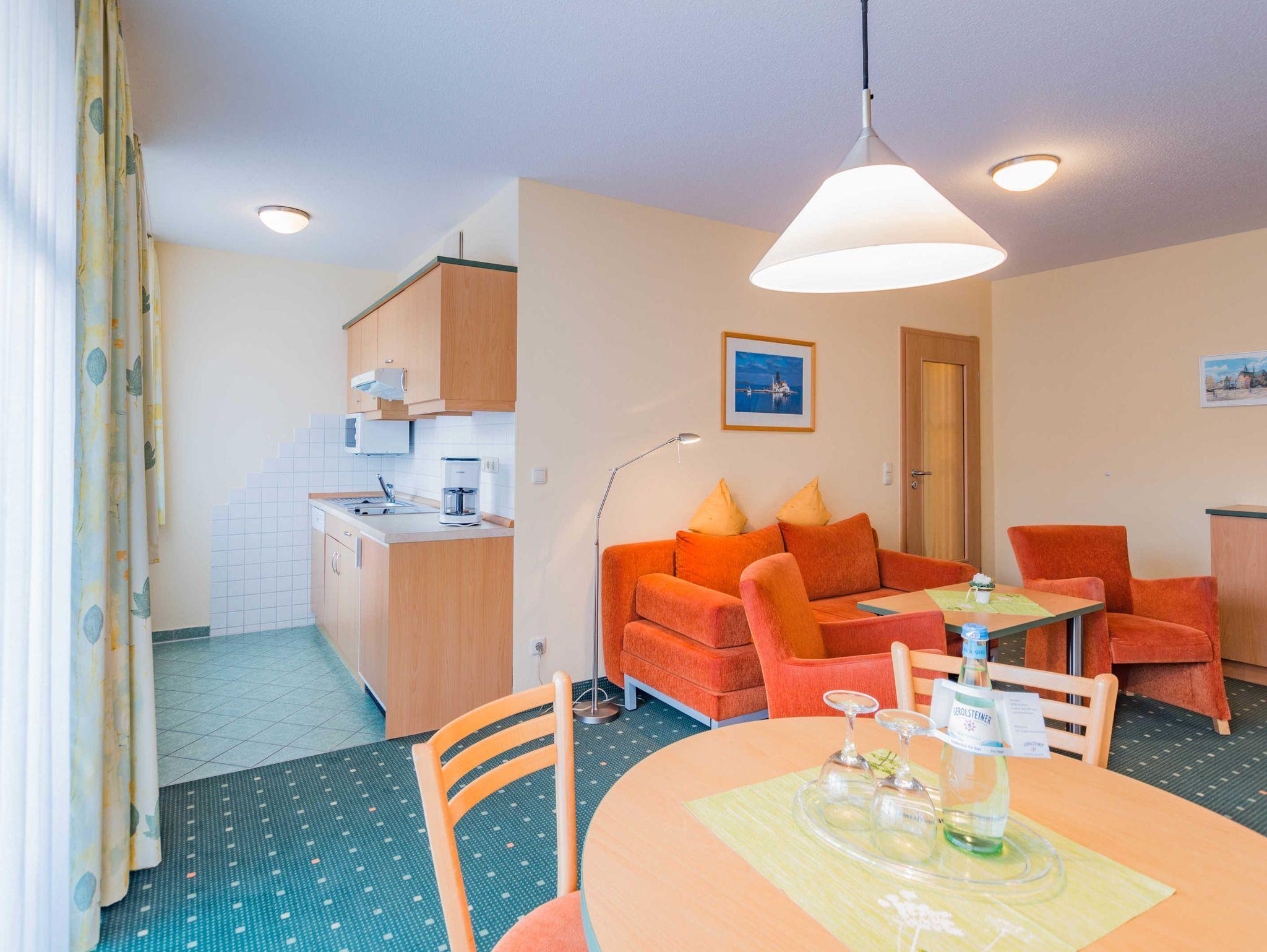 Wer sich lieber verwöhnen lässt, bucht einfach das reichhaltige Frühstücksbüffet und das Abendmenü im Wintergarten des Am Weststrand Aparthotel Kühlungsborn mit. Auch ernährungsbewusste Gäste kommen bei frischen Salaten, leichten Speisen und ständig wechselnden Tagesgerichten auf ihre Kosten.