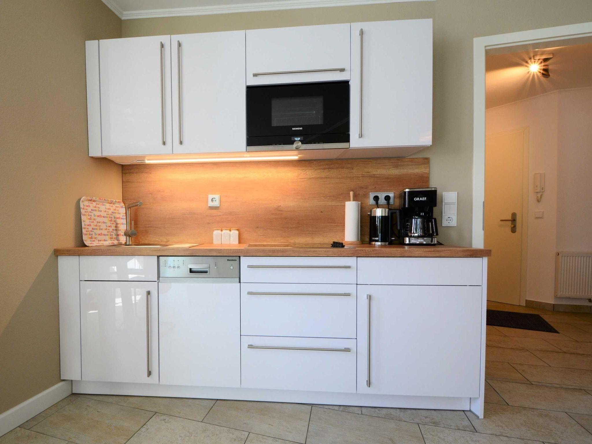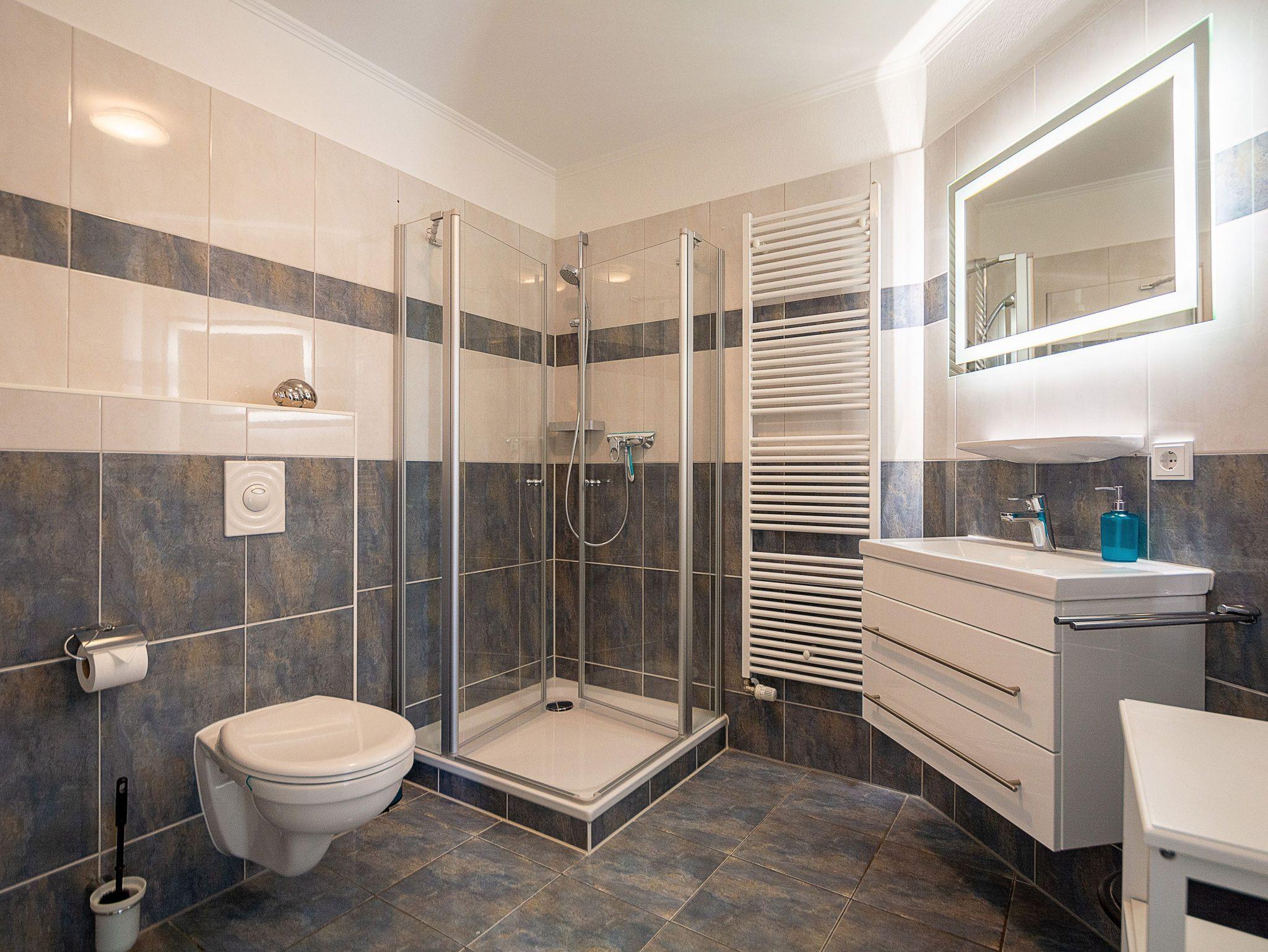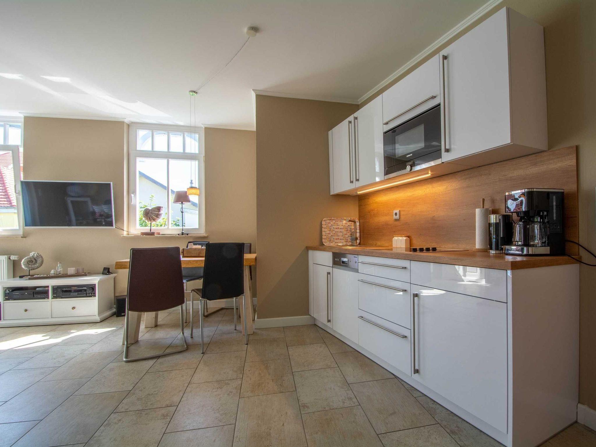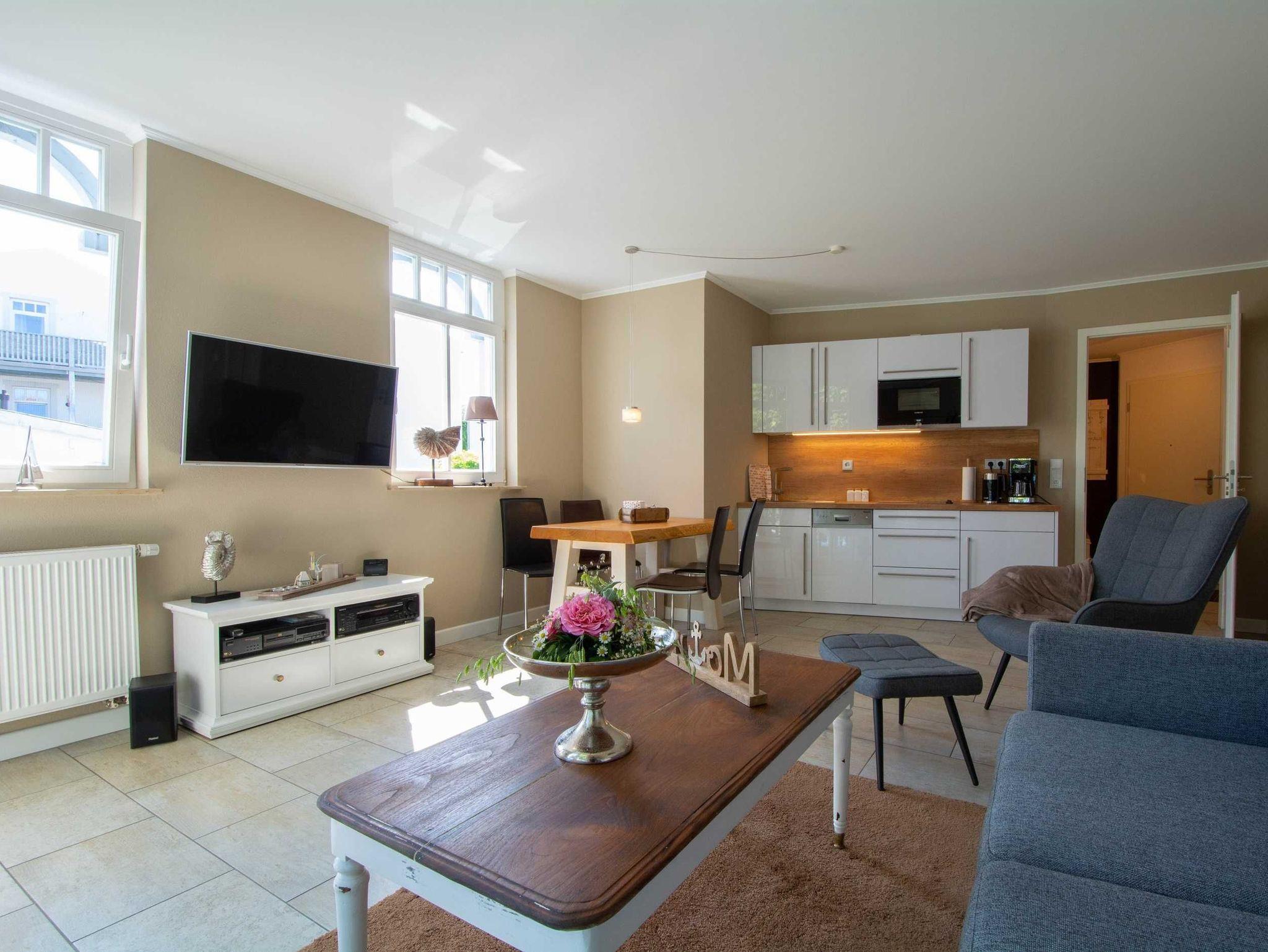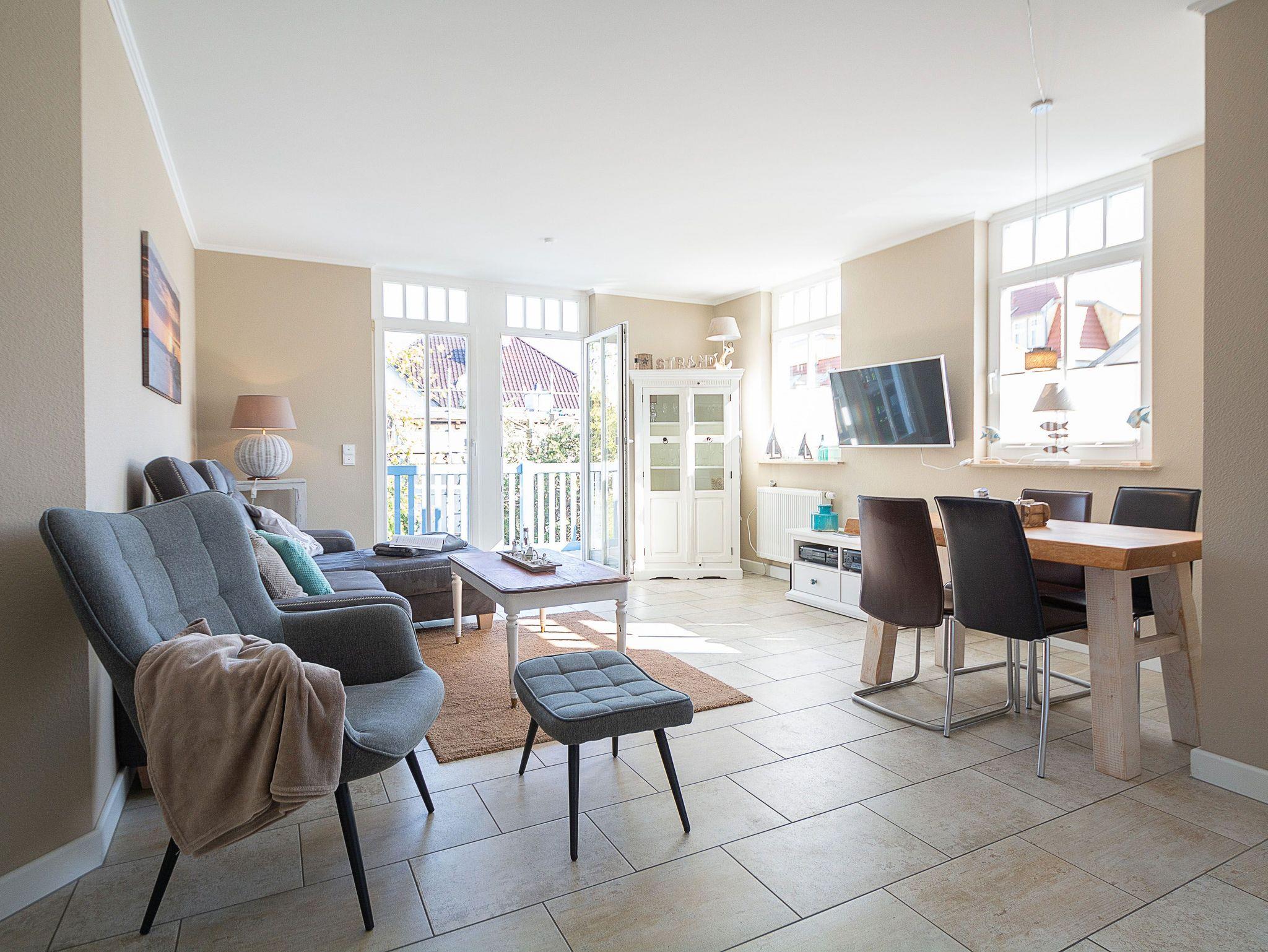 Sie wohnen in einer mit sehr viel Liebe zum Detail eingerichteten 3-Raum-Ferienwohnung von ca. 58 qm Größe, die sich im ersten Obergeschoss befindet. Das Wohnzimmer ist ausgestattet mit Küchenzeile (Ceranfeld, Mikrowelle mit Backofen, Kühlschrank mit Gefrierfach, Geschirrspüler, Wasserkocher, Toaster, Kaffeemaschine), bequemer Wohnlandschaft mit Sessel und Hocker, Essecke, Radio und FlatScreen-TV. Vom Wohnraum aus betreten Sie den Balkon in Richtung Norden, der zum Entspannen sowie zum Frühstück und Abendessen im Sonnenschein einlädt. Die Wohnung verfügt über zwei liebevoll eingerichtete Schlafzimmer: Das erste große Schlafzimmer ist ausgestattet mit einem Doppelbett, einem großen Kleiderschrank sowie einem FlatScreen-TV. Der zweite kleine Schlafraum verfügt über ein ausziehbares Tagesbett (1,60m x 2m), über einen Kleiderschrank sowie ein FlatScreen-TV. Das Bad mit Dusche (90cm x 90cm) und WC vervollständigt das Gesamtbild dieser Wohnung.