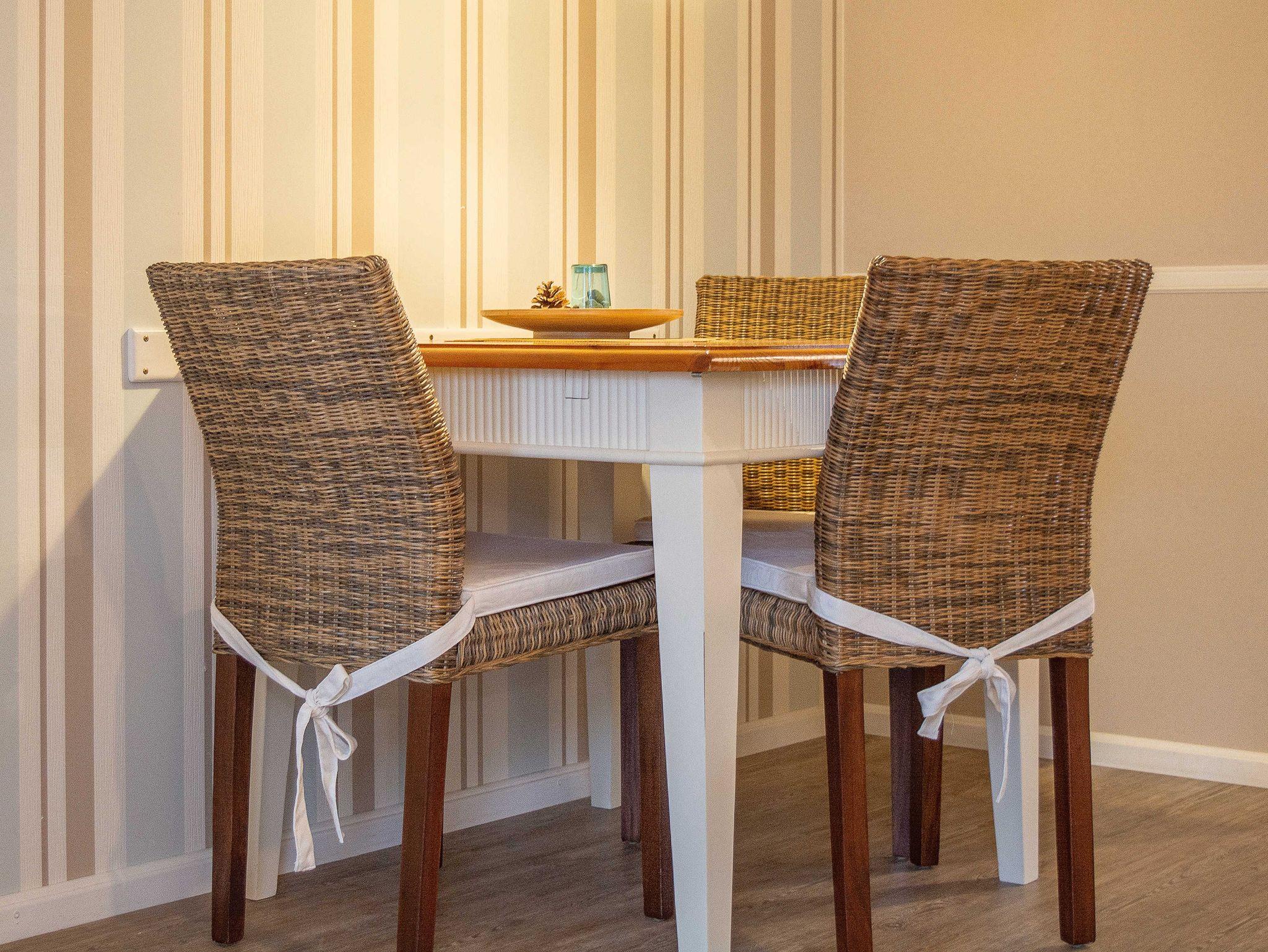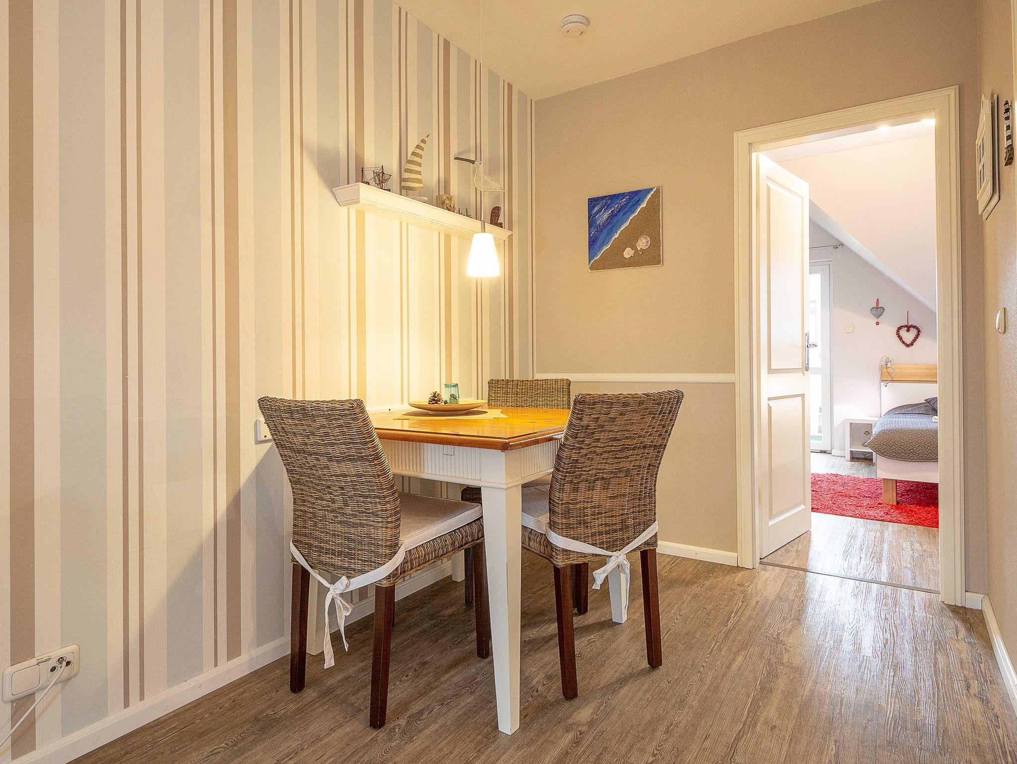 Über eine Außentreppe gelangen Sie zu Ihrer Ferienwohnung und betreten diese über den liebevoll eingerichteten Wohnraum. Der Wohnbereich ist mit einer Schlafcouch (ausgezogen 140cm x 150cm) und einem 31-Zoll Flatscreen-TV eingerichtet. Der angrenzende Essbereich bietet Ihnen reichlich Platz für gemeinsame Mahlzeiten. Die kleine integrierte Küchenzeile hält für Sie ein 2-Zonen-Cerankochfeld mit Dunstabzug, einen Kühlschrank mit Gefrierfach sowie eine Kaffeemaschine, ein Wasserkocher und ein Toaster bereit. Genügend Koch- und Essgeschirr vervollständigen die Kücheneinrichtung.