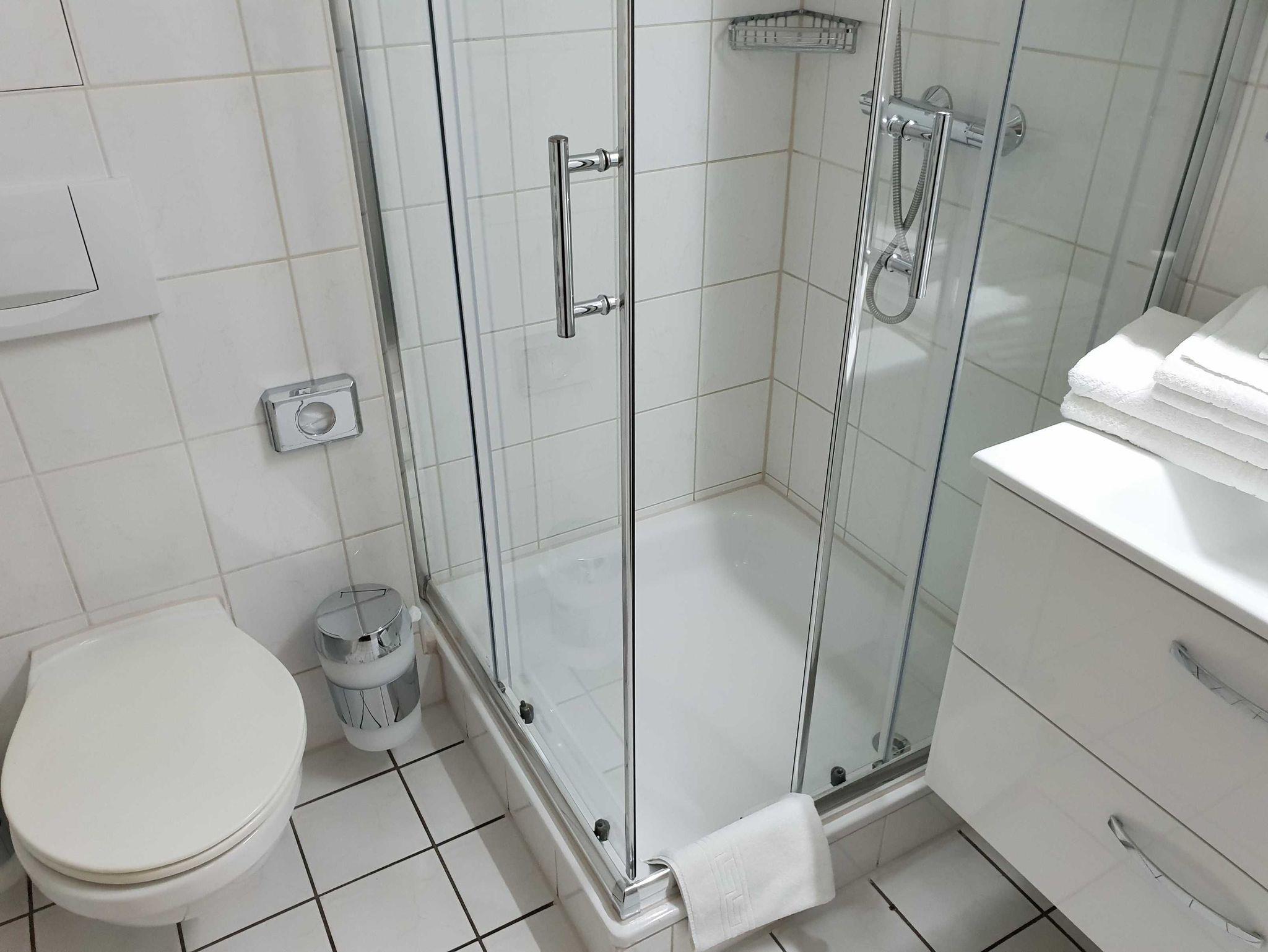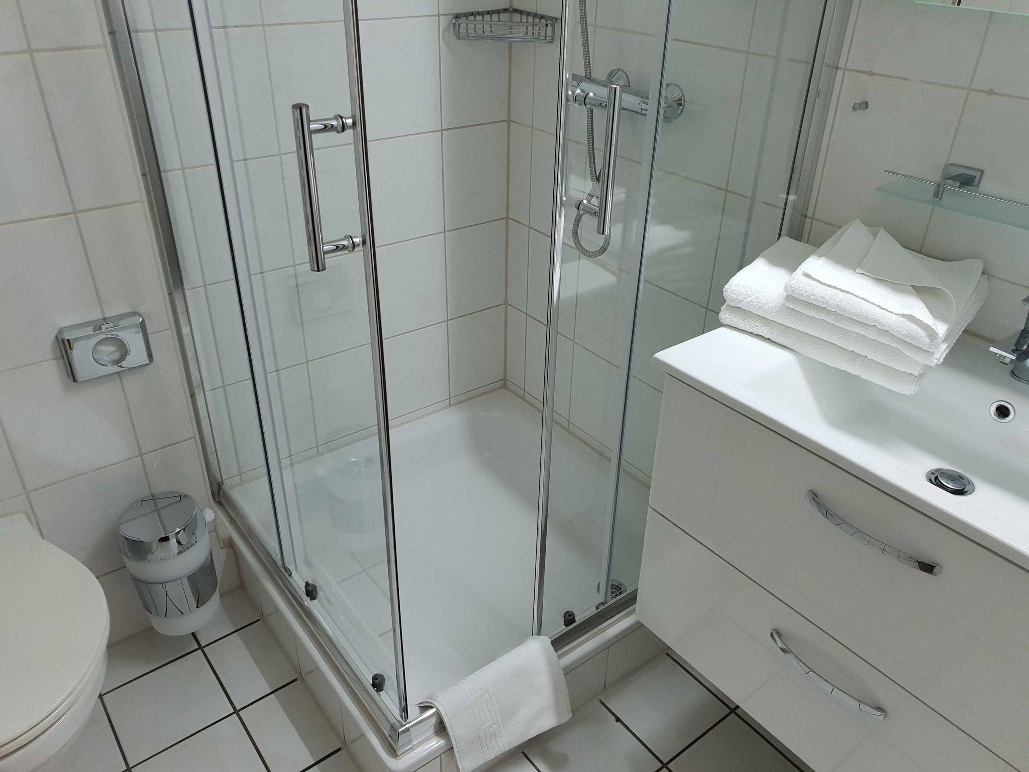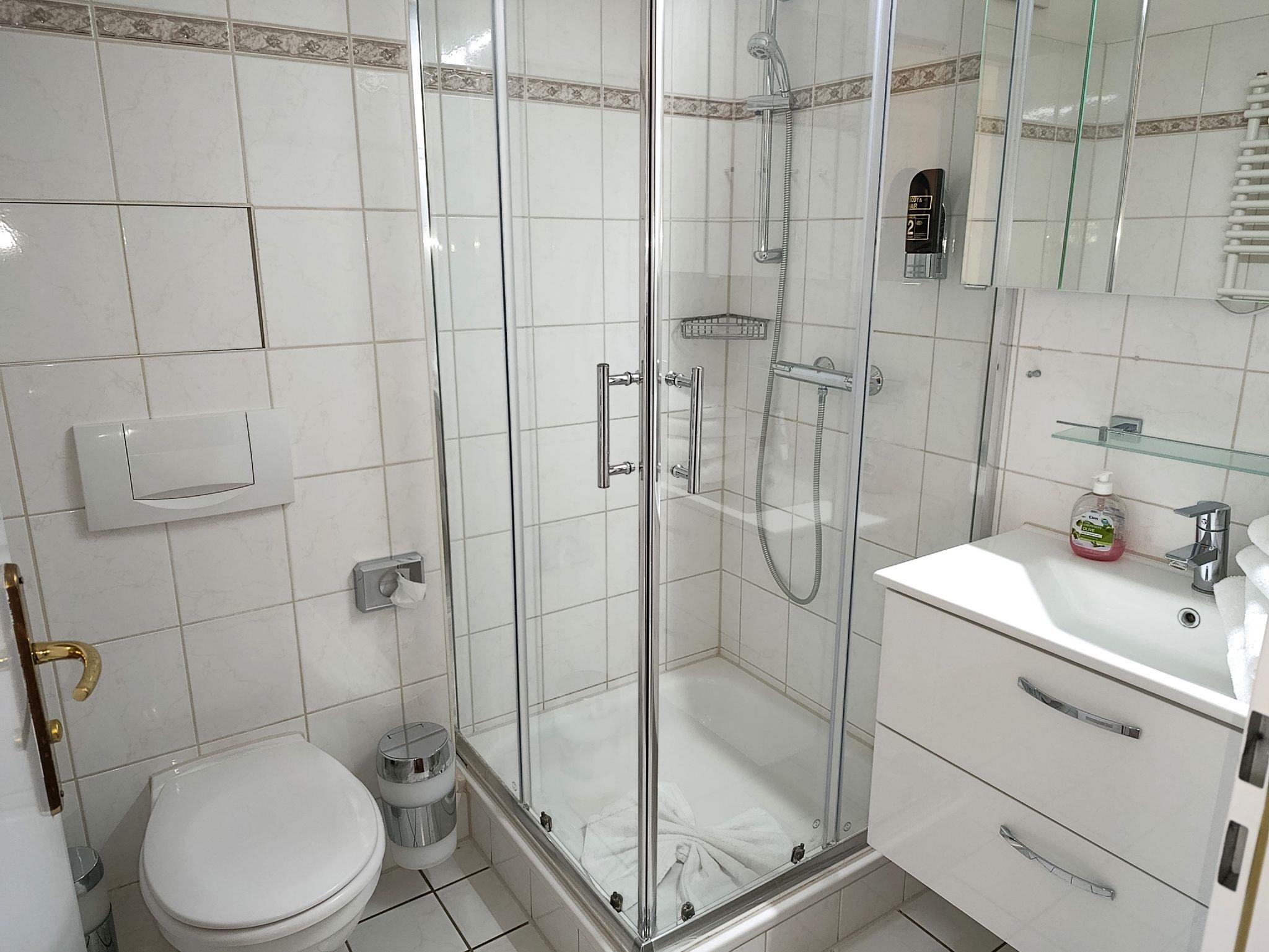 Bad mit Dusche, WC, Waschbecken, Föhn, Spiegel.