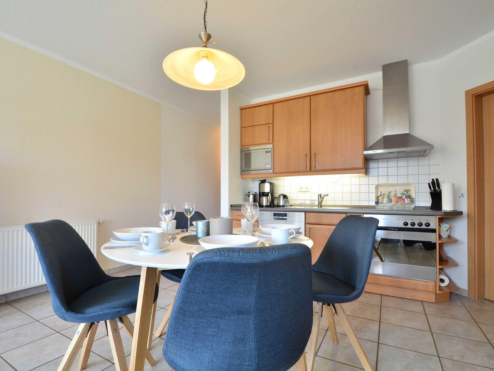 Im großzügigen Wohnraum der Ferienwohnung lädt Sie eine moderne Ledercouchgarnitur zu geselligen Abendstunden ein. Zu Ihrer Unterhaltung stehen Ihnen ein 39-Zoll-Flatscreen-TV, DVD-Player und eine Stereoanlage zur Verfügung. Der Essbereich ist im lichtdurchfluteten Wohnbereich integriert und bietet Ihnen viel Platz für Ihre Mahlzeiten.