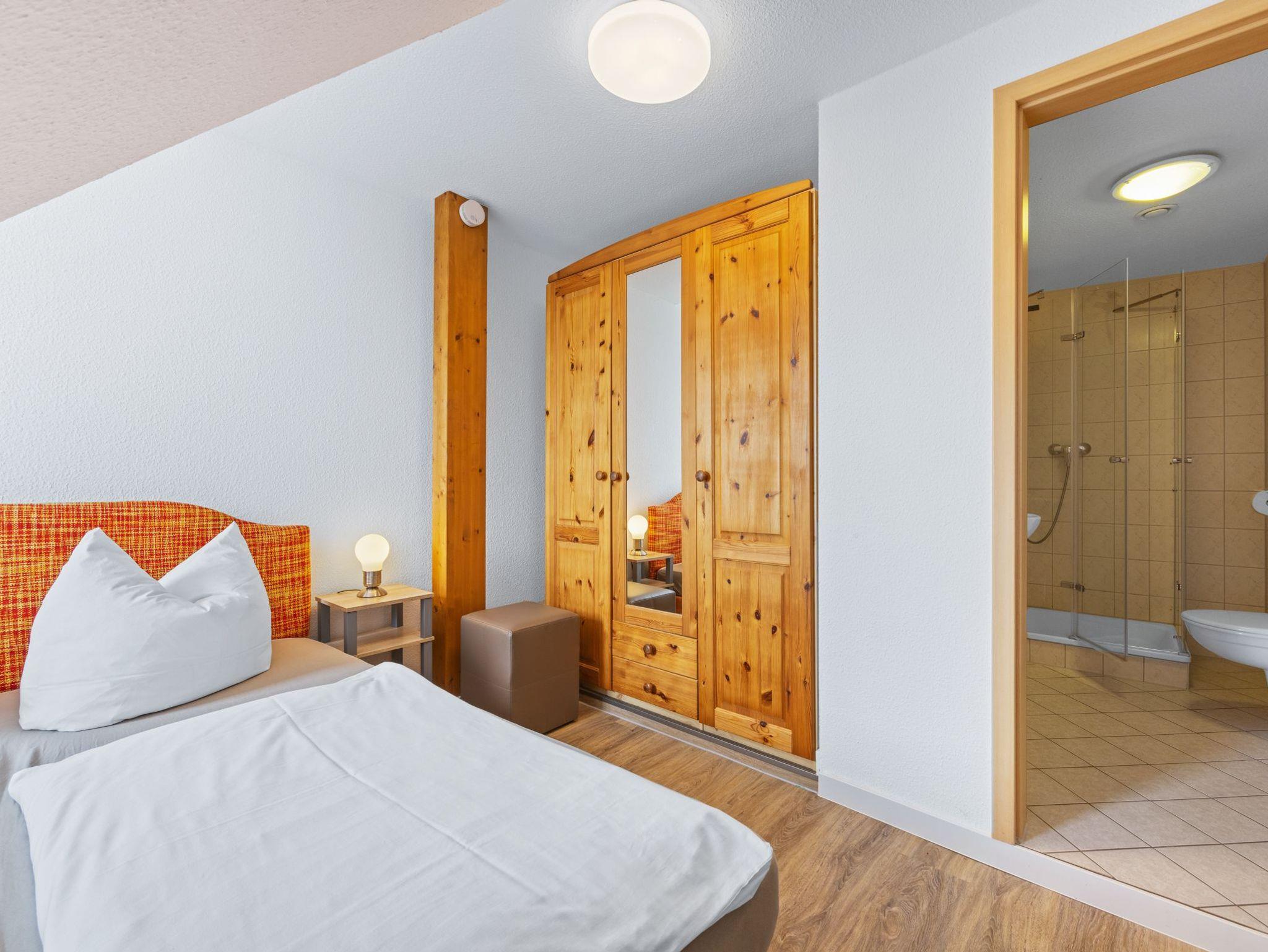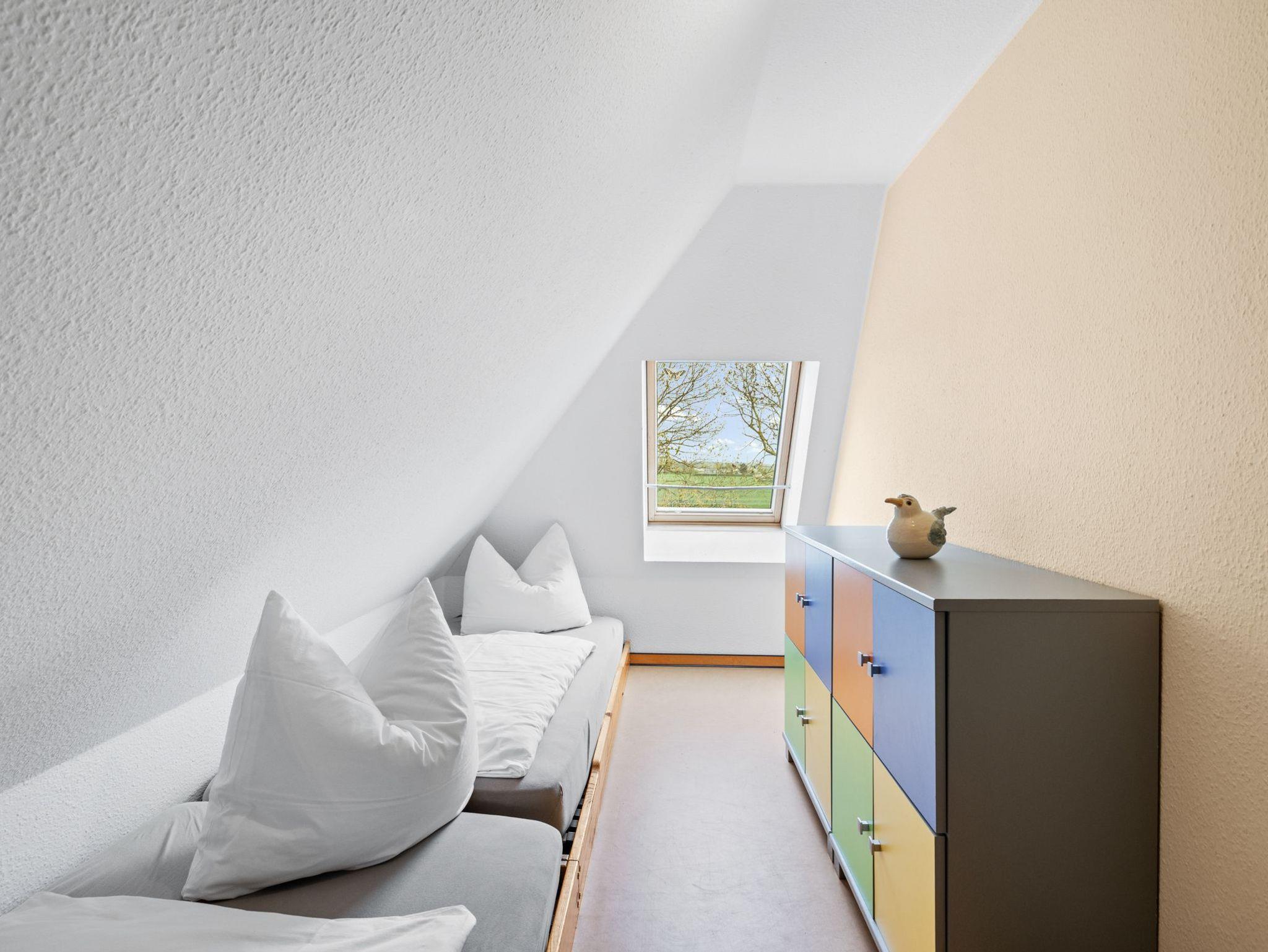 Die Ferienwohnung im Obergeschoss des Landhauses bietet einen herrlichen Panoramablick bis zum Leuchtturm Buk verteilt sich über 2 Etagen. Großzügiger Wohn- Essbereich mit TV, Sitzecke, Esstisch und Pantryküche (2- Plattenherd, Toaster, Kaffeemaschine, Wasserkocher, Kühlschrank, Gefrierfach). Das Schlafzimmer verfügt über ein Doppelbett (1.60m x 2.00m) und Kleiderschrank. Der offene Schlafbereich im Dachgeschoss bietet zwei Einzelbetten sowie eine Kommode und ist über eine Treppenleiter erreichbar. Das Bad mit Dusche und WC ist vom Schlafzimmer aus zu erreichen.