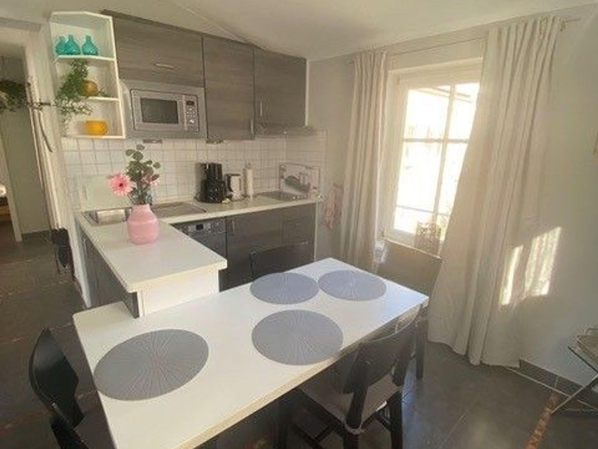 Die moderne Einbauküche ist mit 2-Platten-Herd, Geschirrspüler und Mikrowelle im Wohnbereich integriert. Zusätzlich ist ein Esstisch vorhanden.