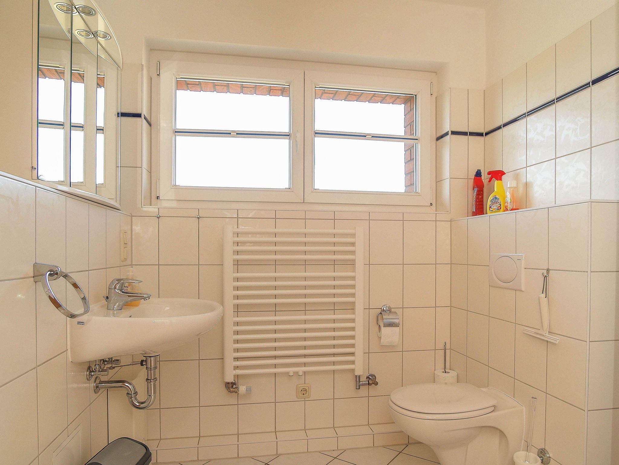 Das geflieste Tageslichtbad ist ausgestattet mit einer Duschkabine, Waschbecken und WC. Ein Handtuchheizkörper sorgt für kuschlig warme Handtücher und komplettiert die Badausstattung.