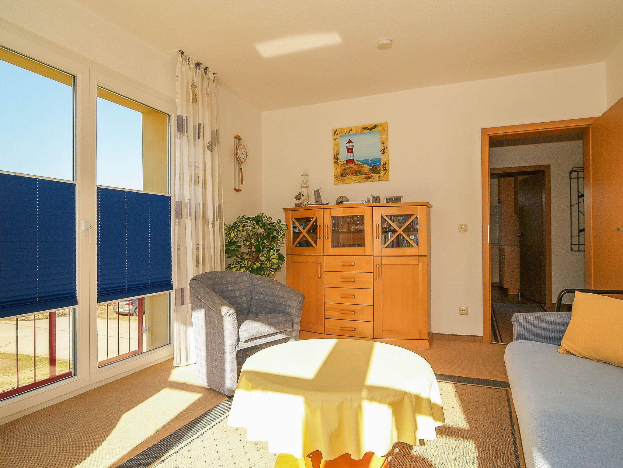 Der lichtdurchflutete Wohnbereich ist mit einer gemütlichen Schlafcouch, 32-Zoll-Flat-TV, DVD-Player und einem Radio eingerichtet. Mit nur wenigen Handgriffen lässt sich die Schlafcouch zu einem bequemen Schlafplatz für 2 Personen (160cm Breite) umbauen. Vom Wohnraum betreten Sie den nach Süden ausgerichteten Balkon. Hier können Sie Sonne tanken, relaxen und den Abend nach einem schönen Tag am Meer ausklingen lassen.