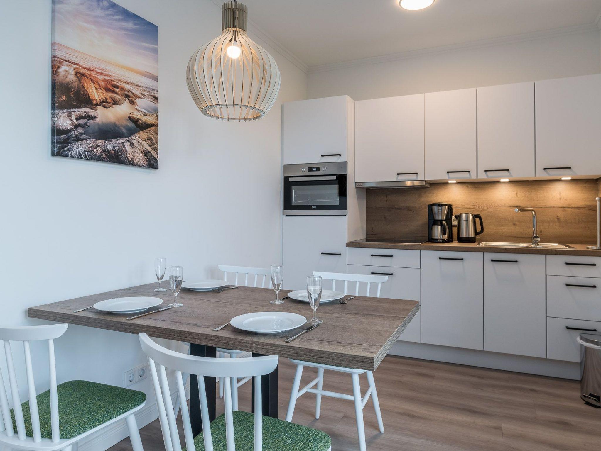 Das Bad verfügt über eine Dusche, einem Haartrockner und einem Handtuchtrockner. Zu Ihrem Apartment gehört ebenfalls ein großer und lichtdurchfluteter Wohn- und Essbereich mit offener Küche.