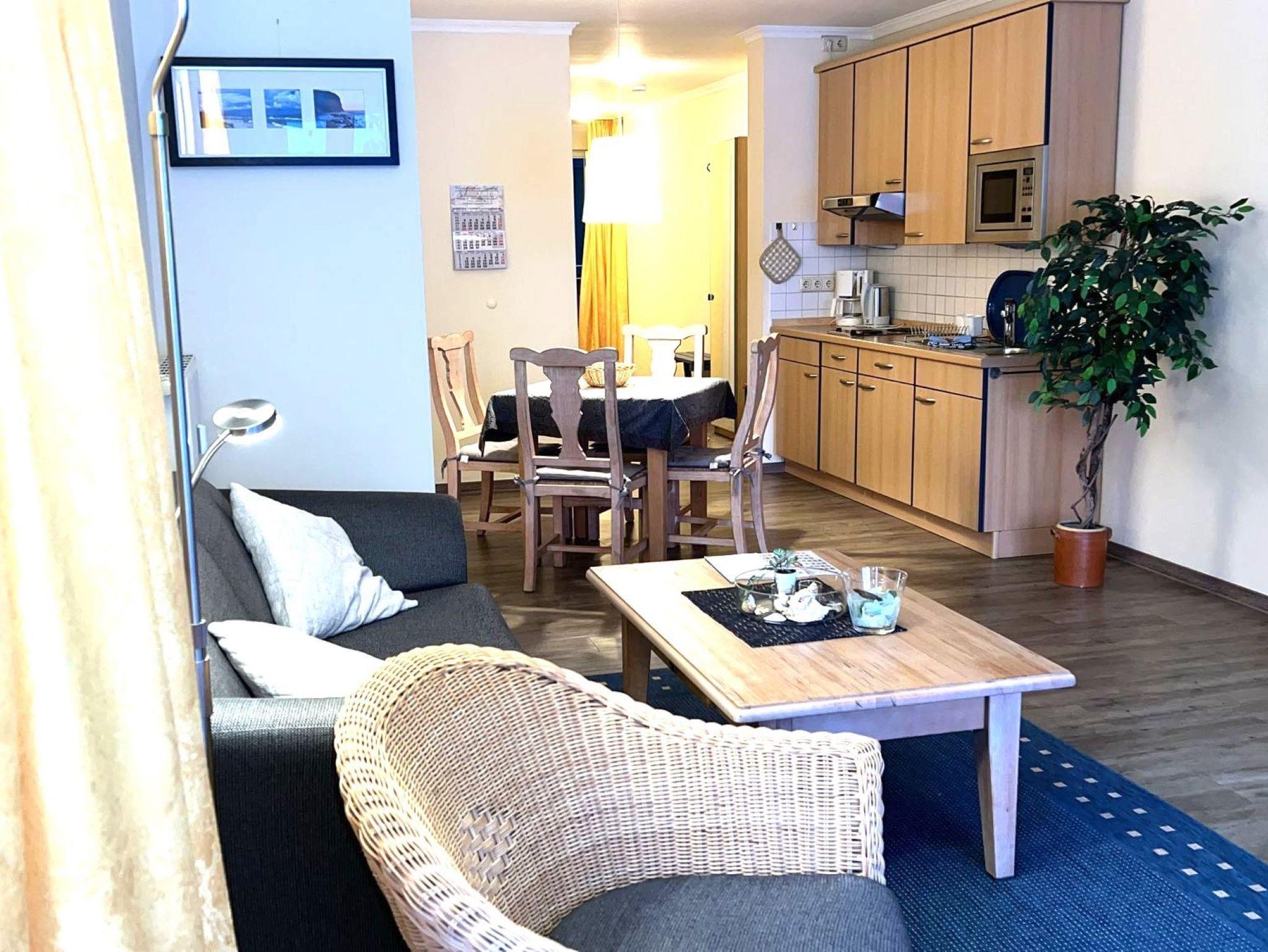 Größe ca. 55 qm - Wohnzimmer mit Schlafcouch, Esstisch, Küchenzeile, Kabel-TV und Radio - Schlafzimmer mit Doppelbett und Kleiderschrank - Küchenzeile mit Mikrowelle, Zweiplattenkochherd, Kühlschrank und Kaffeemaschine - Dusche/WC und Balkon zur Ostseite mit Meeresblick