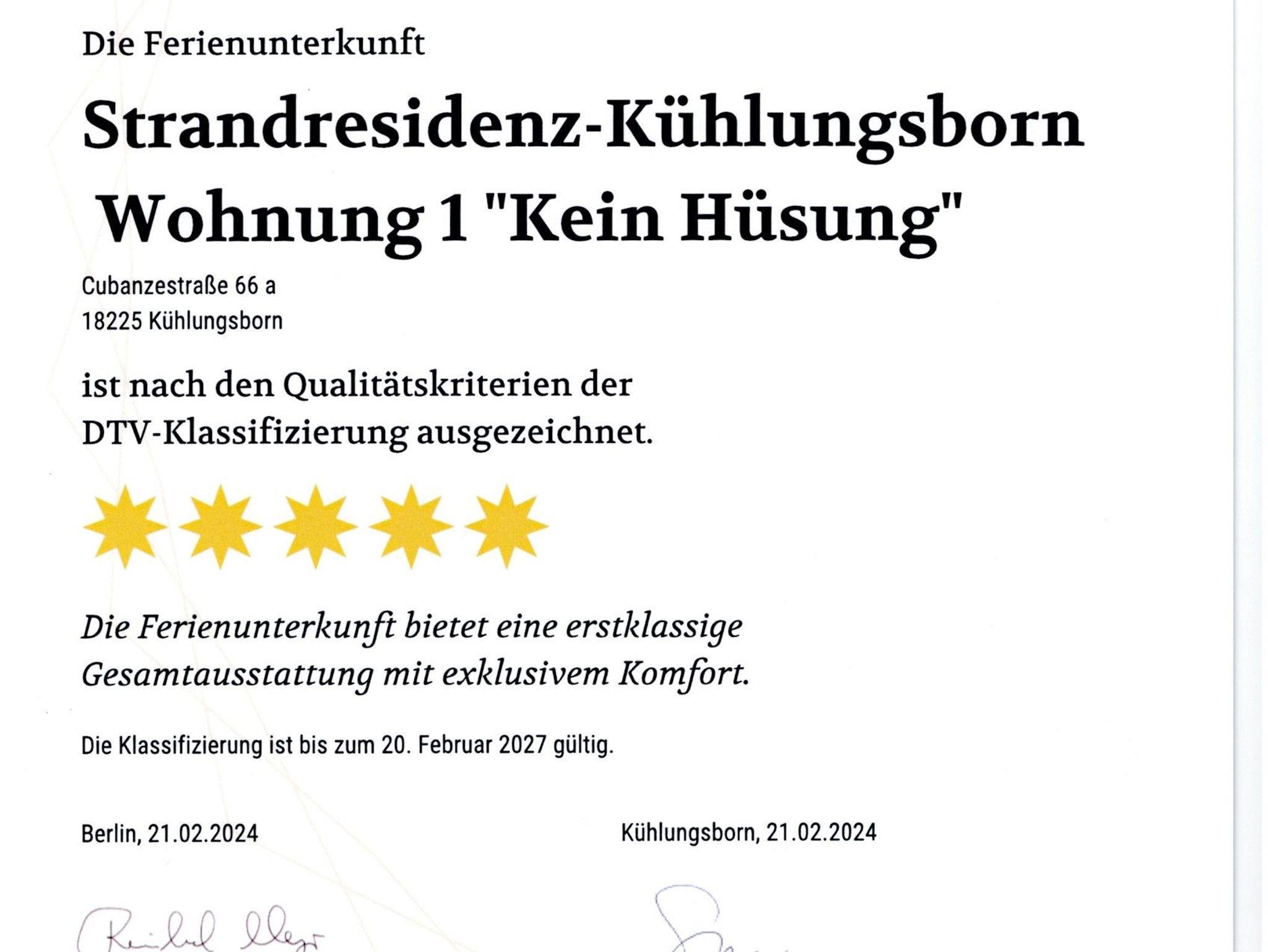 Die 7 Wohnungen gehören zu den Flaggschiffen der vom DTV zertifizierten deutschen Ferienwohnungen mit 1.216 bis zu 1.331 vergebenen Punkten. 5 Sterne gibt es ab 900 Punkte.