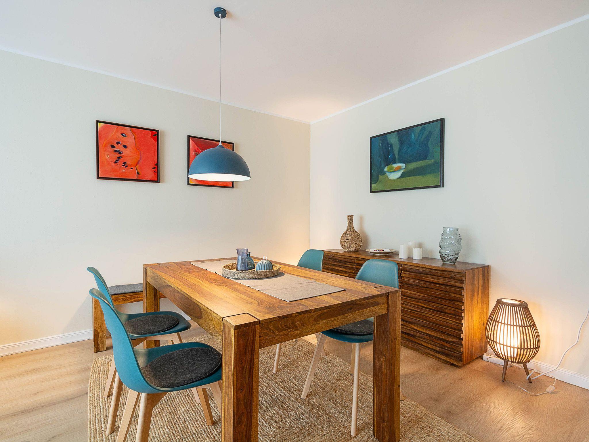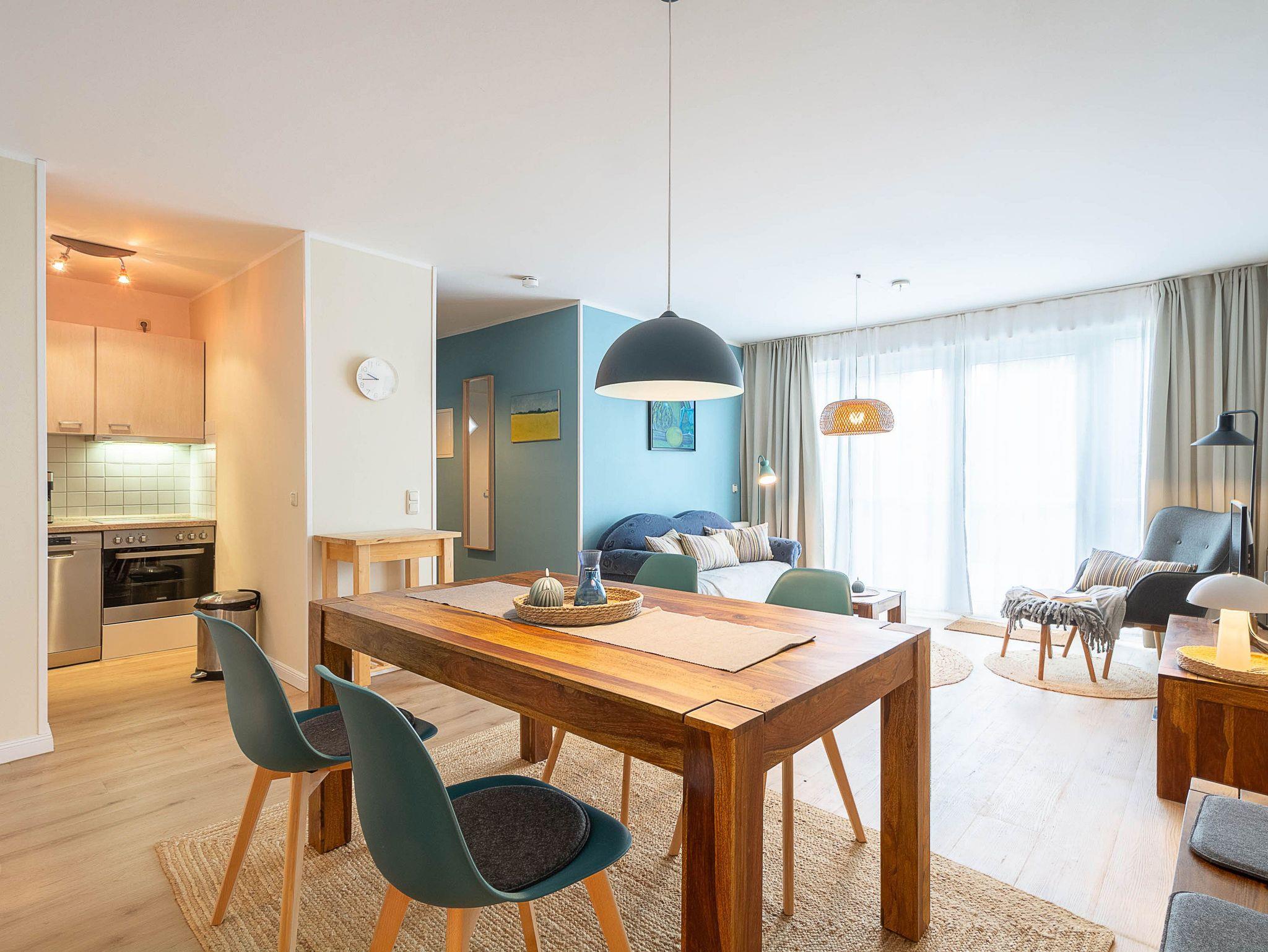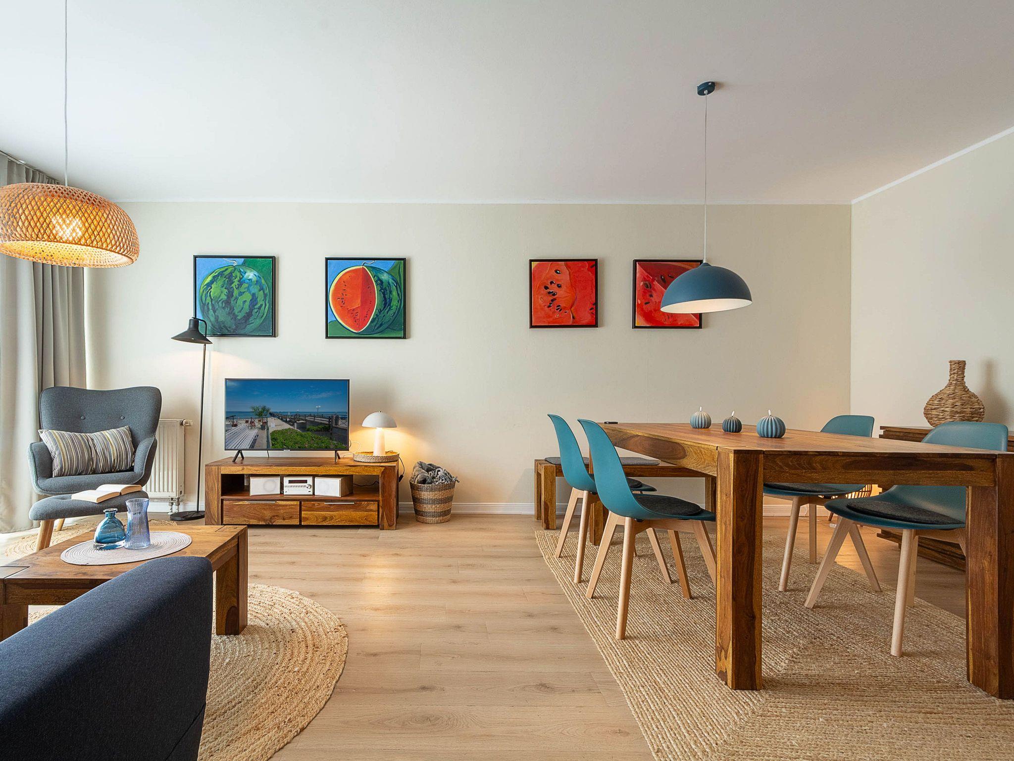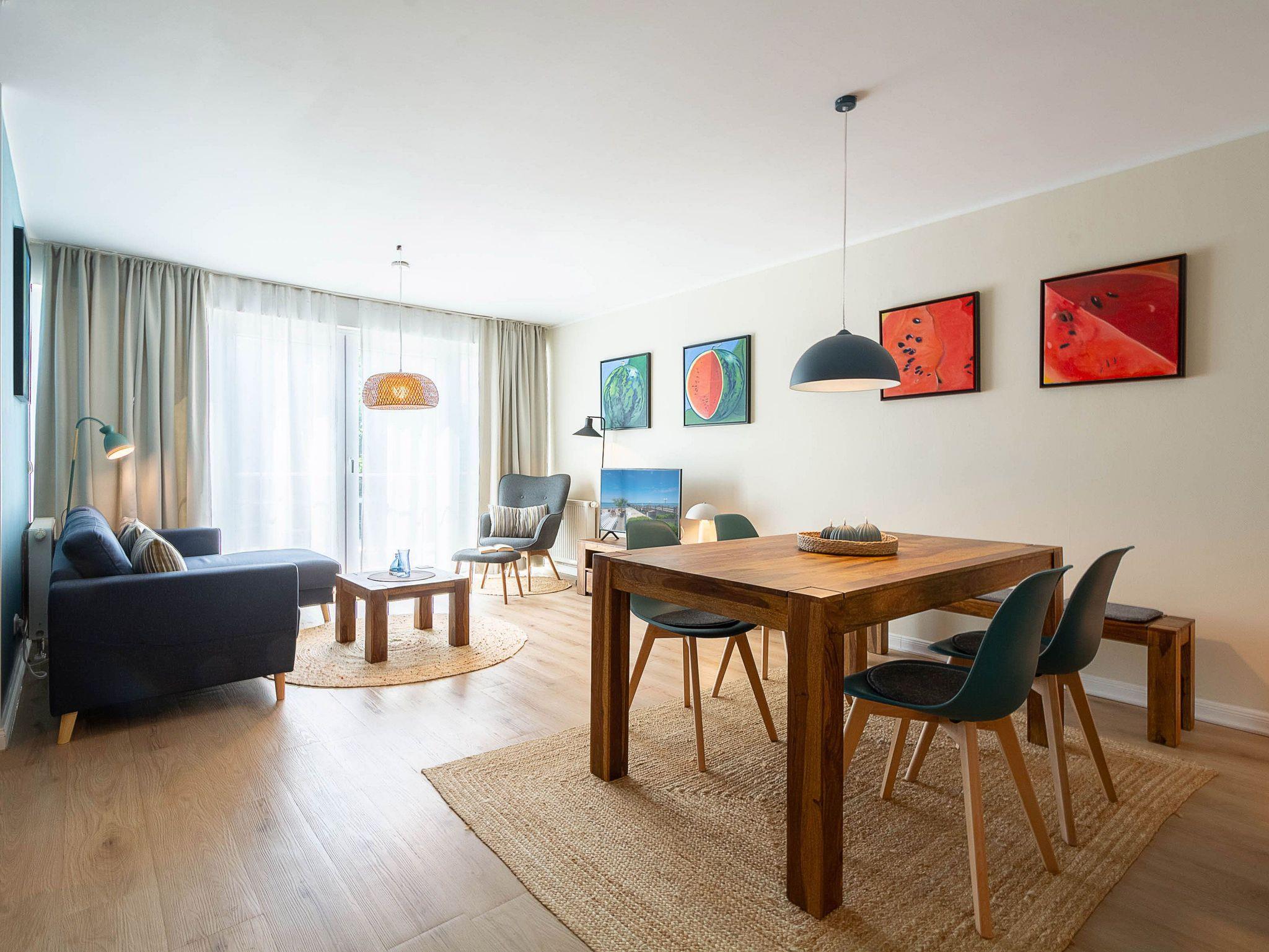Ankommen und Wohlfühlen: Die gemütlich eingerichtete 3-Raum-Ferienwohnung von 62 qm Größe befindet sich im Erdgeschoss und empfängt Sie mit einem hellen offenen Wohnbereich. Hier finden Sie eine bequeme Couchgarnitur vor sowie einen 39-Zoll-Flachbild-TV und eine Musikanlage. Ein großer Esstisch lädt zum langen Frühstück und schönen gemeinschaftlichen Mahlzeiten ein. Von hier können Sie die möblierte Süd-Terrasse betreten, welche im Sommer zum Sonnenbaden und Genießen einlädt.