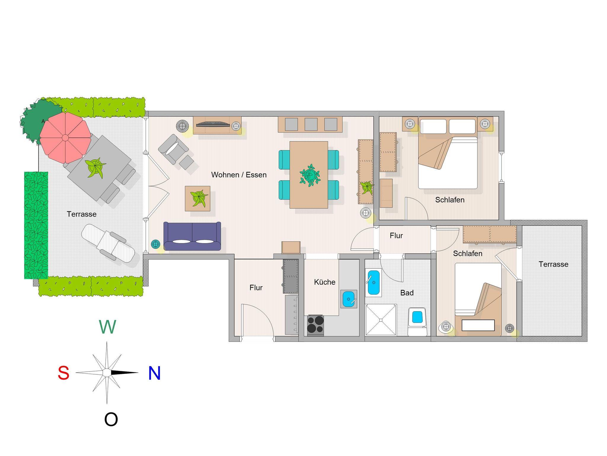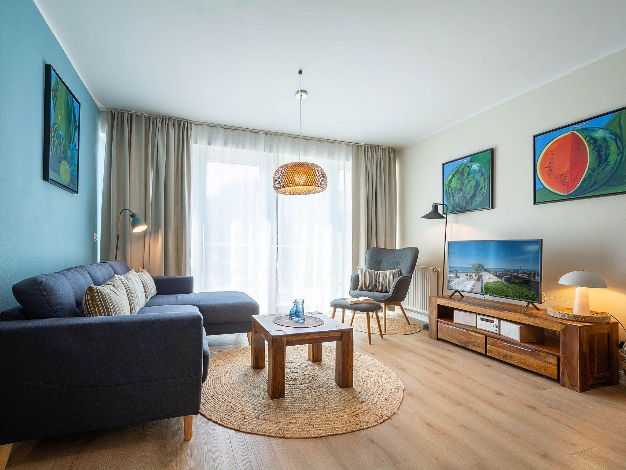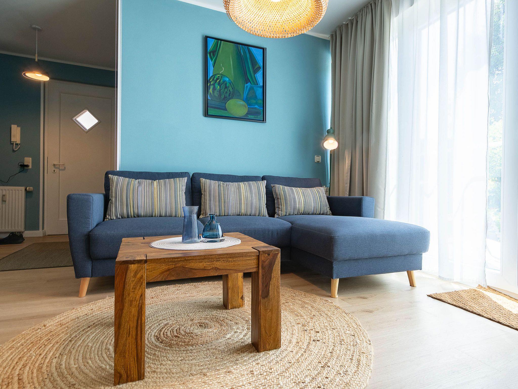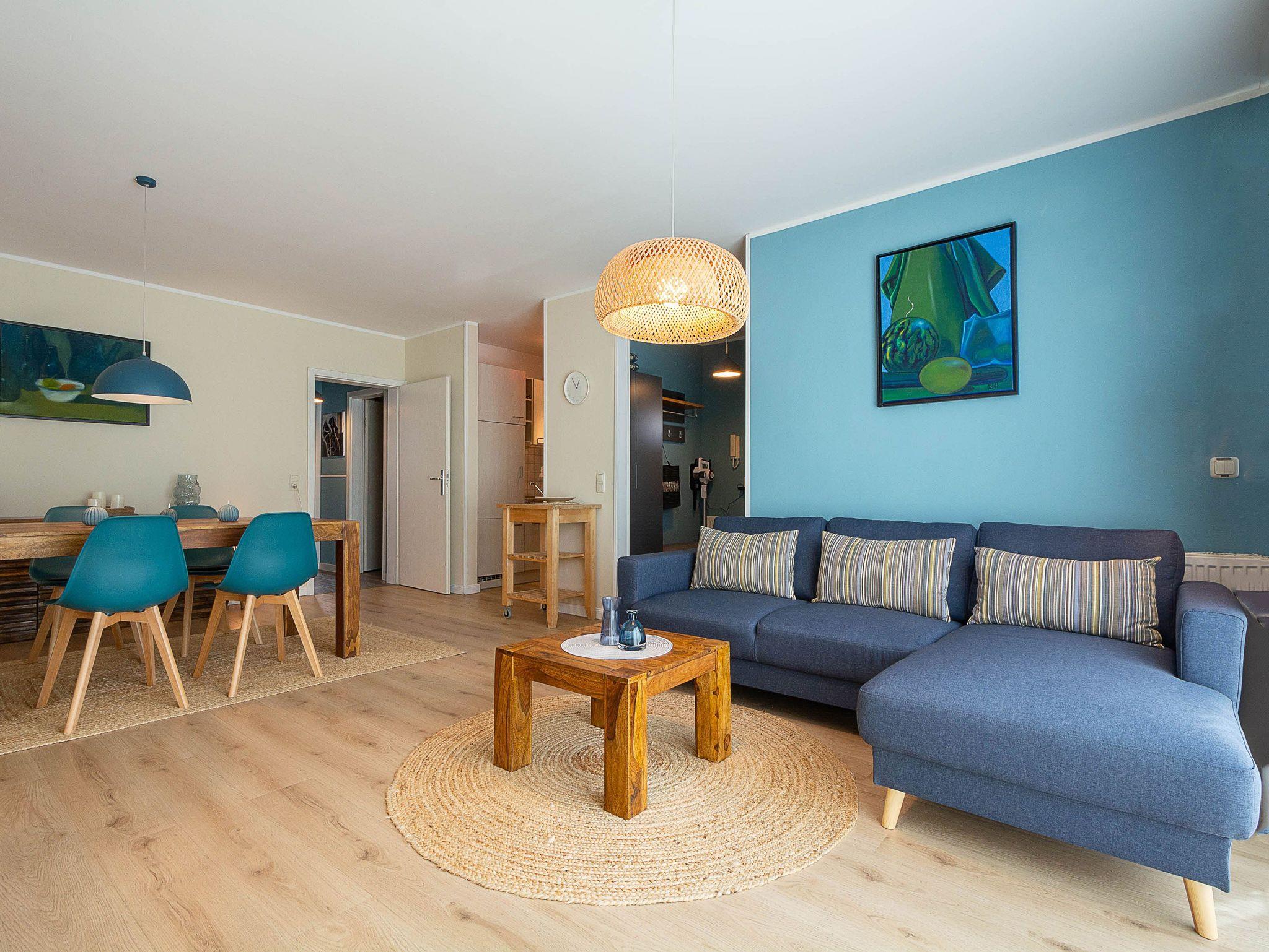Ankommen und Wohlfühlen: Die gemütlich eingerichtete 3-Raum-Ferienwohnung von 62 qm Größe befindet sich im Erdgeschoss und empfängt Sie mit einem hellen offenen Wohnbereich. Hier finden Sie eine bequeme Couchgarnitur vor sowie einen 39-Zoll-Flachbild-TV und eine Musikanlage. Ein großer Esstisch lädt zum langen Frühstück und schönen gemeinschaftlichen Mahlzeiten ein. Von hier können Sie die möblierte Süd-Terrasse betreten, welche im Sommer zum Sonnenbaden und Genießen einlädt.