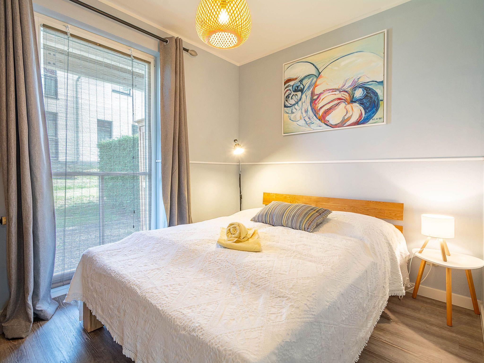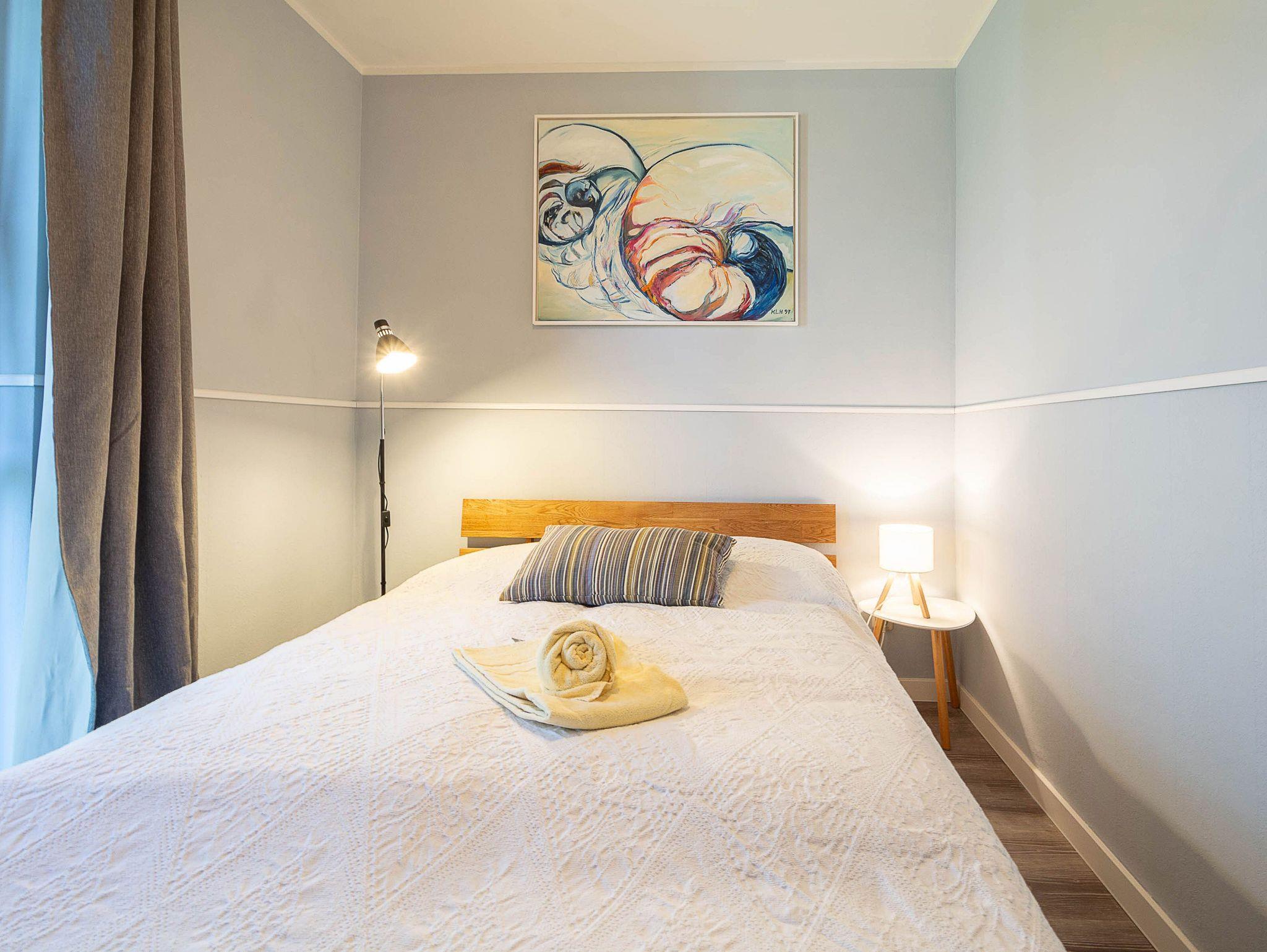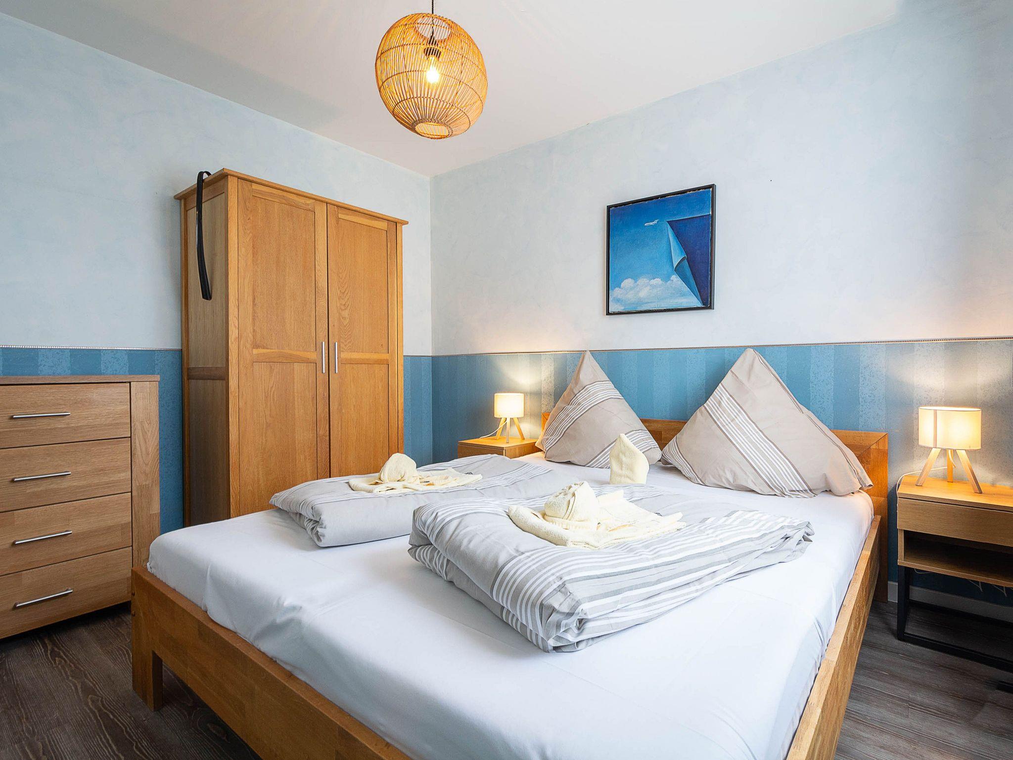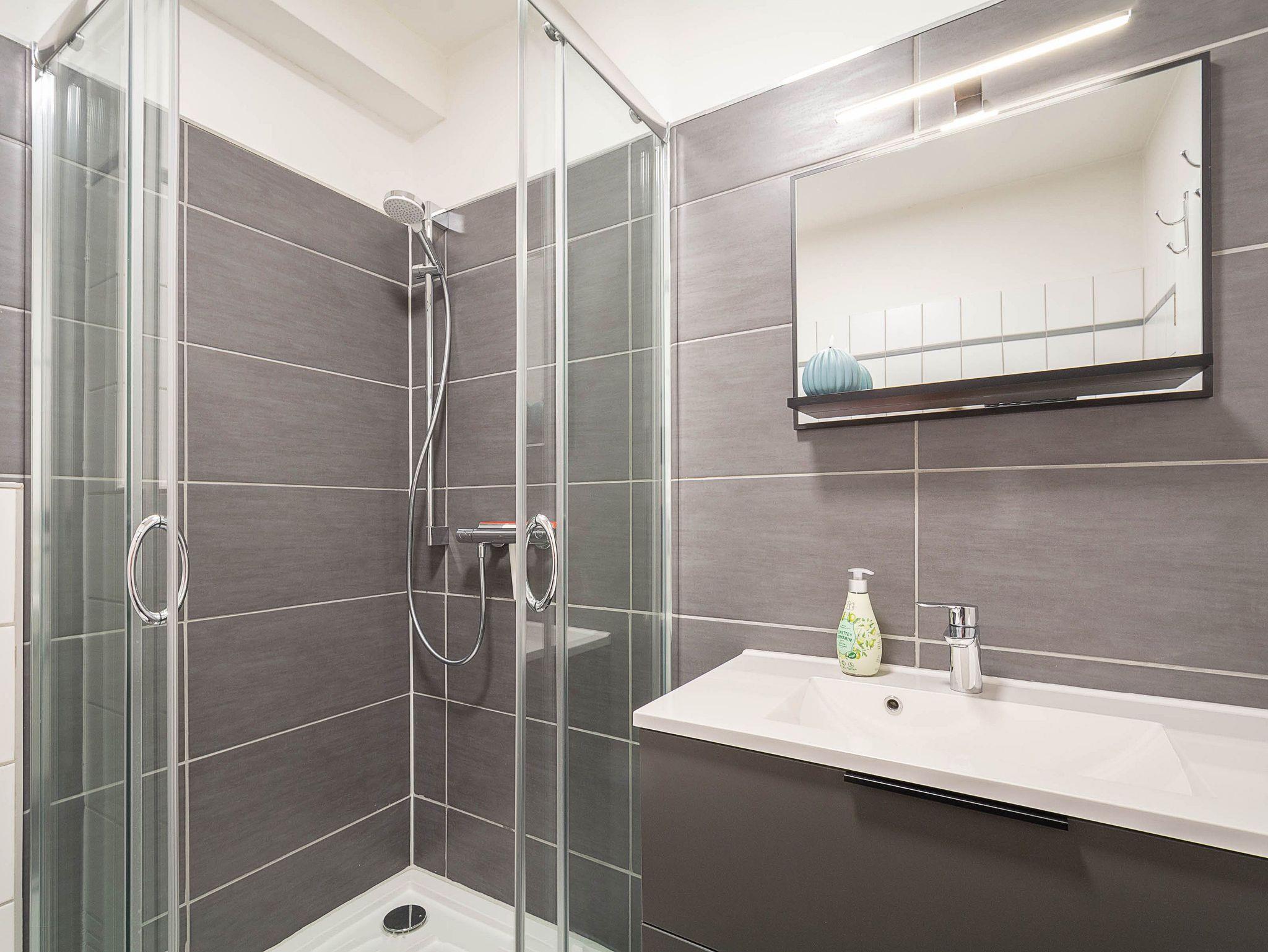 Das große Schlafzimmer mit Doppelbett (2 x 90cm x 200cm) und großem Kleiderschrank bietet Ihnen den Zugang zur möblierten Nord-Terrasse. Im kleinen Schlafzimmer, das ebenfalls einen Zugang zur Nord-Terrasse bietet, befindet sich ein französisches Bett (140x200cm). Das geflieste Bad ist ausgestattet mit einer Dusche und WC.