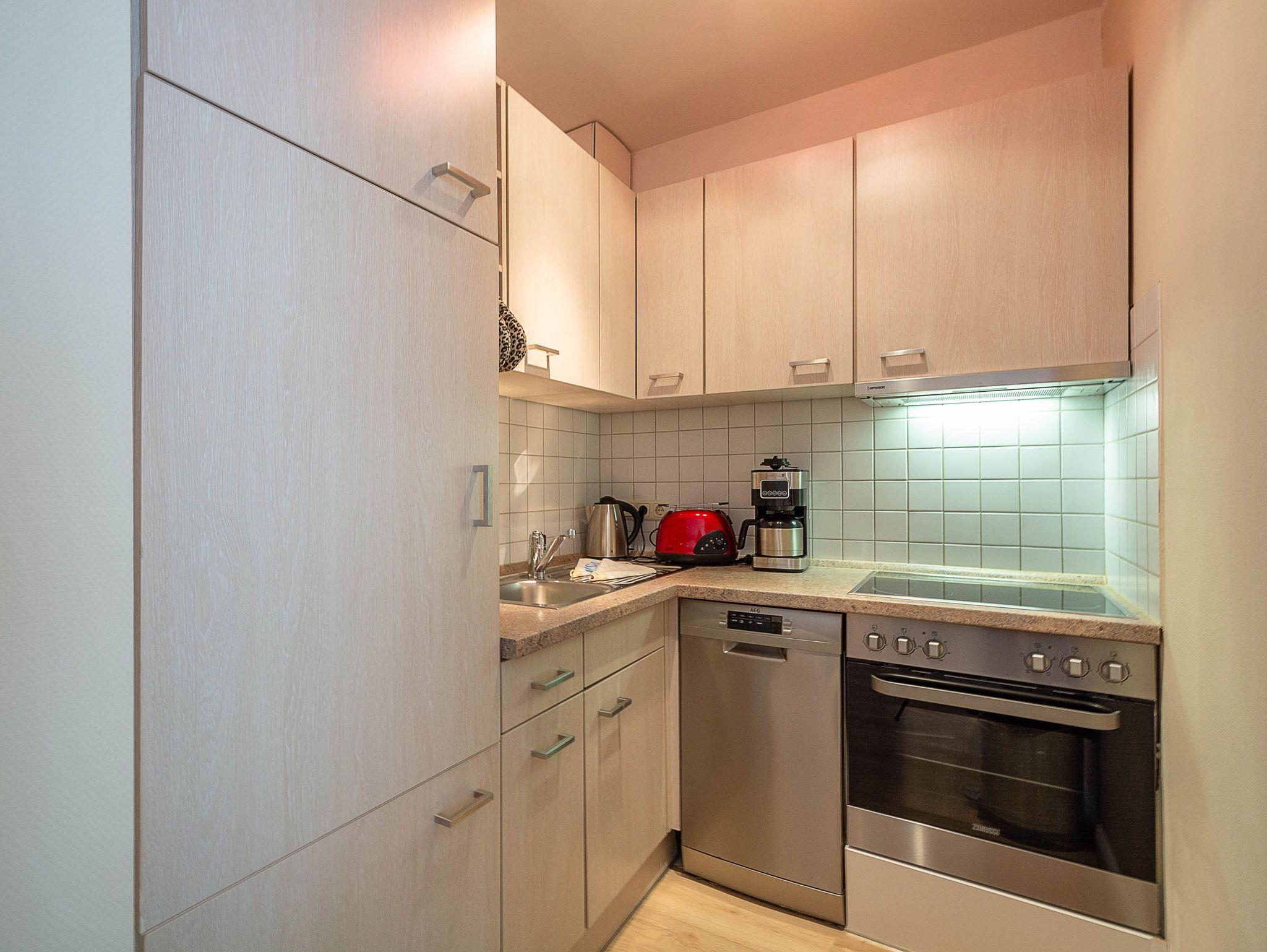 Eine optisch vom Wohnbereich getrennte Küchenzeile schließt sich dem Wohnbereich an und hält für Sie alle wichtigen Küchengeräte und -utensilien bereit, die Sie für Ihr perfektes Dinner benötigen: Ein 4-Zonen-Cerankochfeld mit Backofen, ein Geschirrspüler sowie ein Kühlschrank mit Gefrierfach befinden sich in der Küche. Eine Kaffeemaschine, ein Wasserkocher und ein Toaster sowie genügend Koch- und Essgeschirr vervollständigen die Kücheneinrichtung.