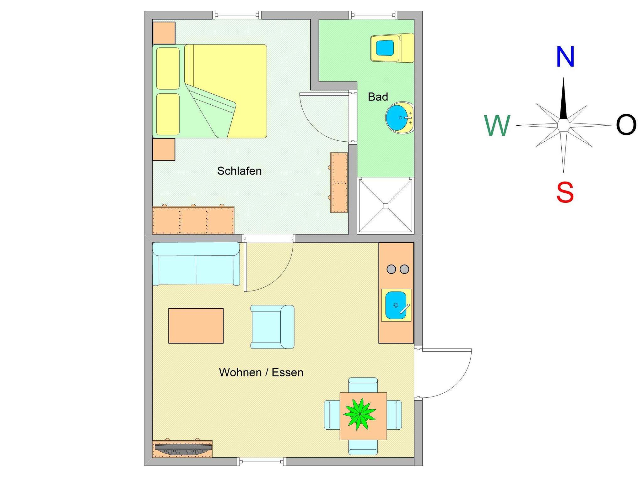 Sie wohnen in einer hellen freundlichen 2-Raum-Ferienwohnung von ca. 40 m² Größe, die sich im zweiten Obergeschoss befindet. Der liebevoll eingerichtete Wohnraum ist ausgestattet mit Schlafcouch, Flachbild-TV, Radio, Essbereich und einer kleinen Küchenzeile (2-Platten-Ceranfeld, Kühlschrank mit Gefrierfach, Kaffeemaschine, Toaster). Von hier betreten Sie den Schlafraum, der mit einem Doppelbett und Kleiderschrank ausgestattet ist. Das geflieste Tageslichtbad mit Dusche und WC bietet genügend Ablagefläche für Ihre Waschutensilien.