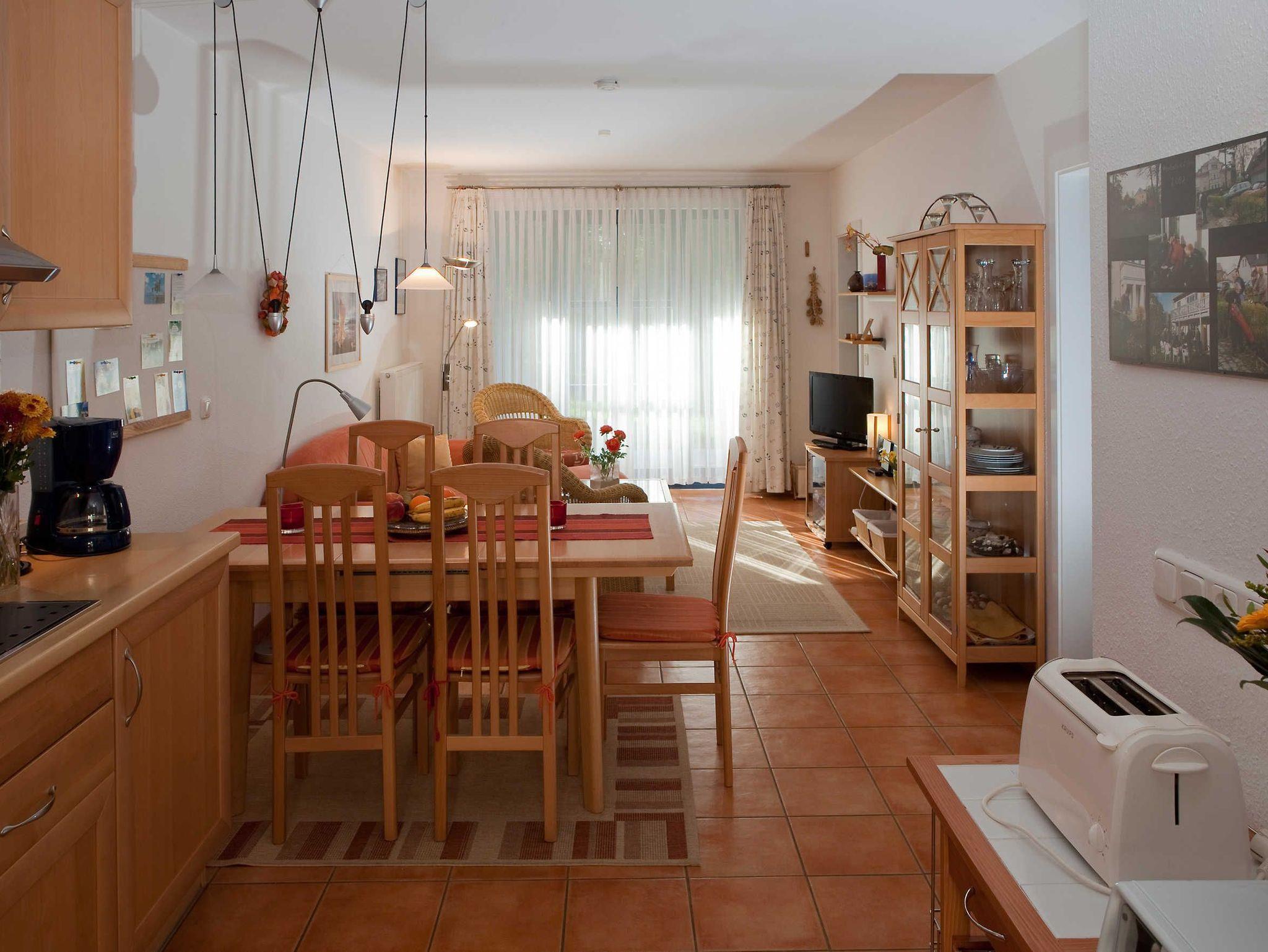 Wohnzimmer mit Sitzecke, Esstisch, Anrichte, Küchenzeile, Kabel-TV und Radio