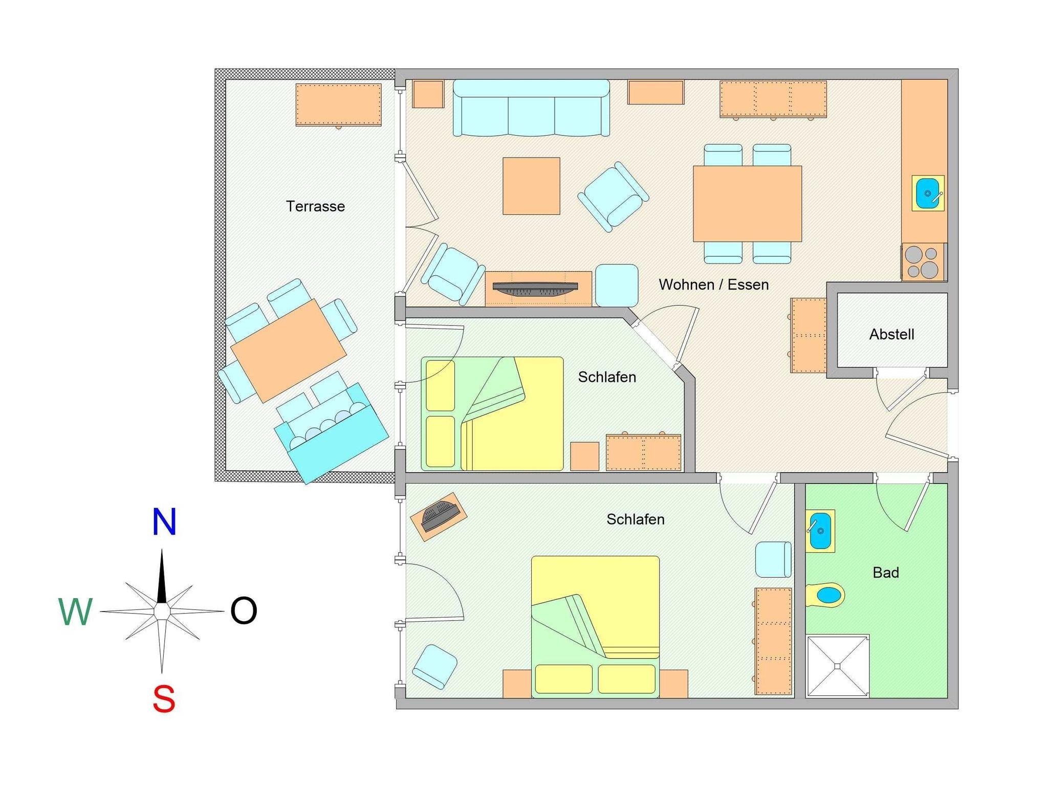 Herzlich willkommen in der Ferienwohnung Nr. 02 in der Residenz Seestern. Die liebevoll und gemütlich eingerichtete 3-Raum-Ferienwohnung befindet sich im Erdgeschoss des Hauses. Auf 65 qm Wohnfläche können hier bis zu 4 Personen erholsame Urlaubstage genießen. Es empfangen Sie ein heller offener Wohn-und Essbereich mit einer Küchenzeile, zwei Schlafzimmer, ein Duschbad sowie ein Balkon mit West-Ausrichtung. Die Wohnung ist mit mediterranen Fliesen ausgestattet.