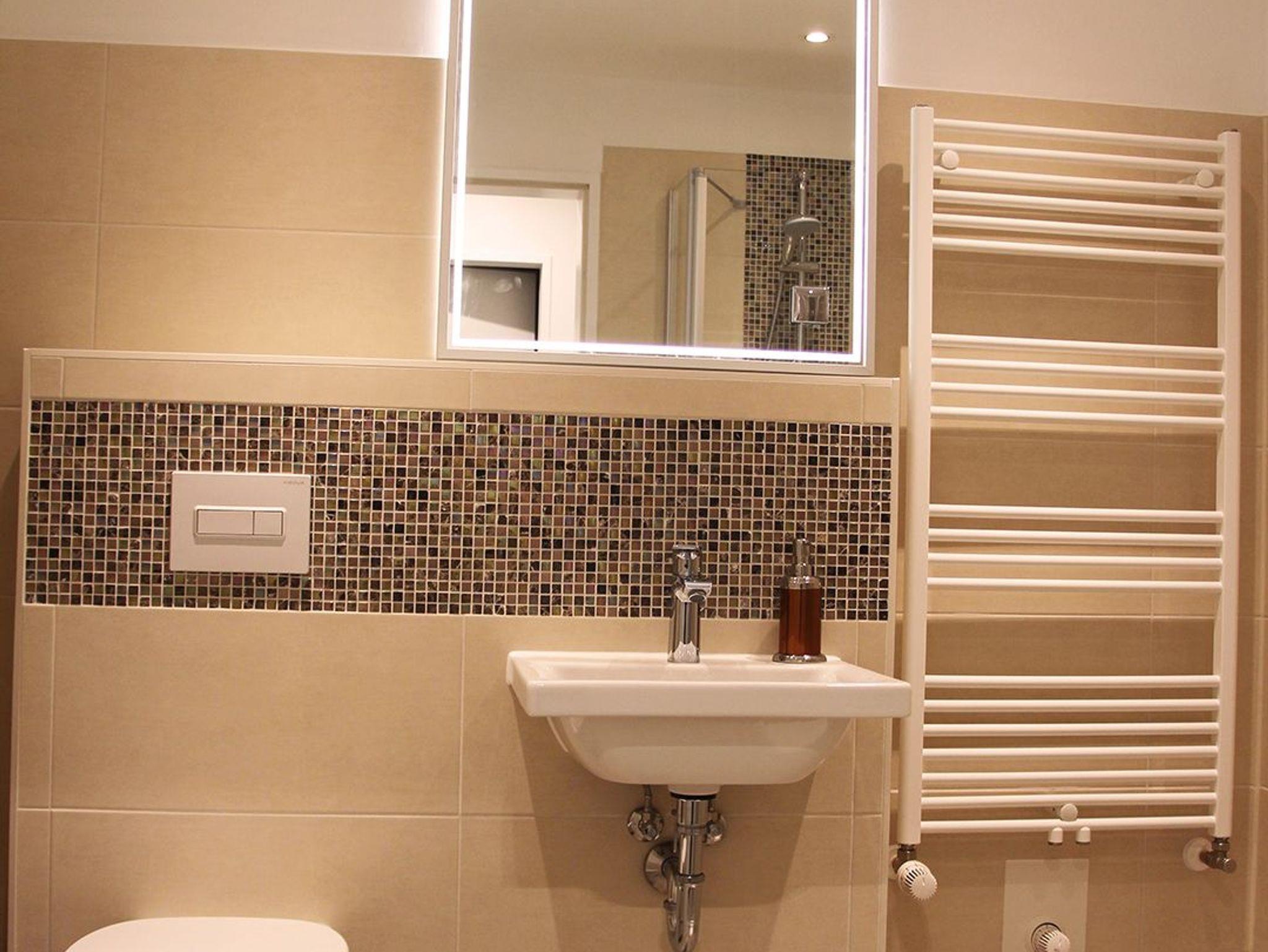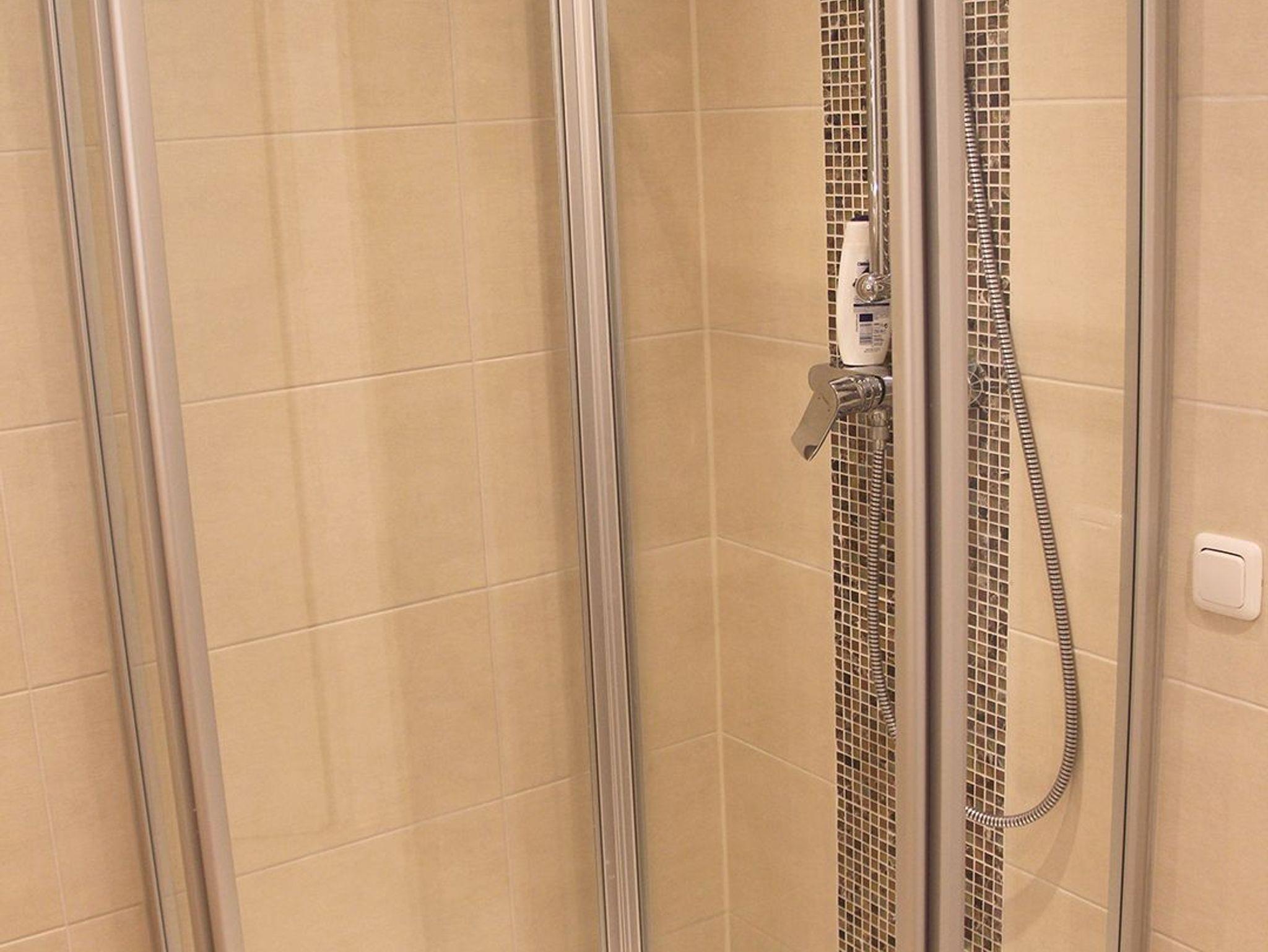 Das Badezimmer mit einer Dusche (sehr flacher Duscheinstieg) verfügt über eine Fußbodenheizung.