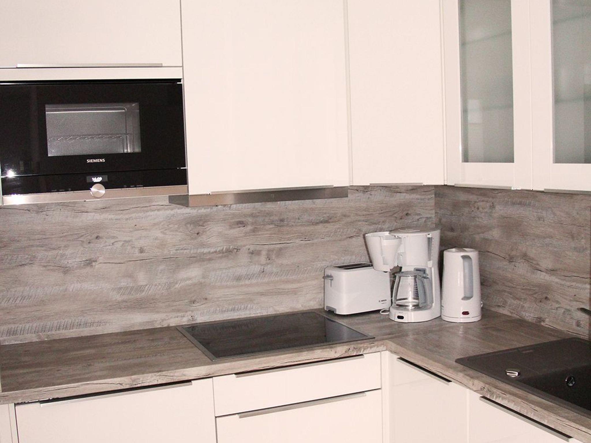 Die moderne Küche ist im Wohnbereich integriert und beinhaltet ein Ceranfeld, eine Mikrowelle sowie einen Esstisch mit Stühlen.
