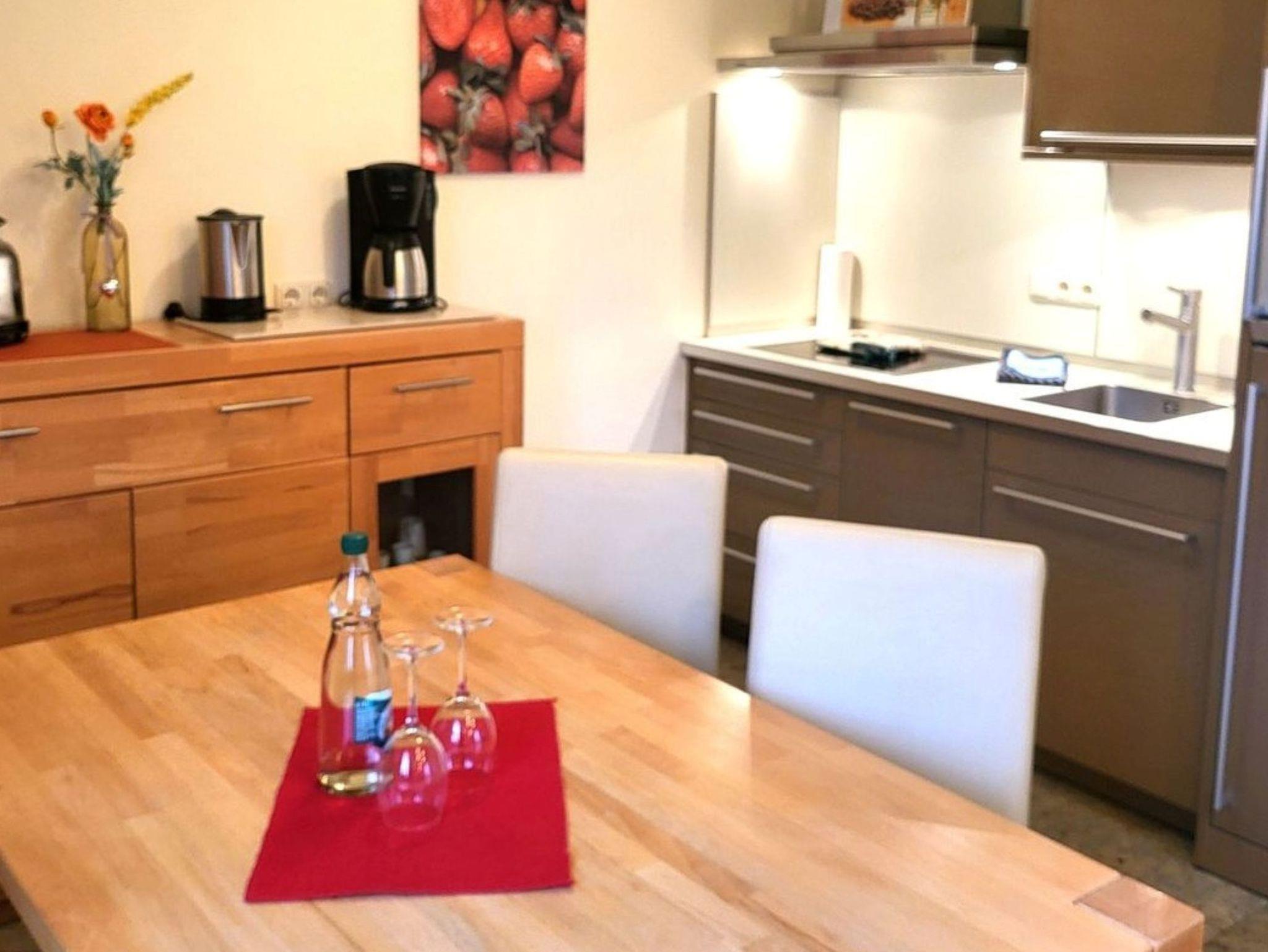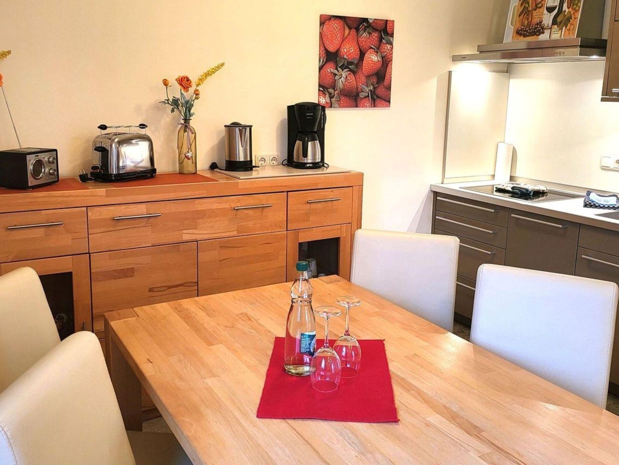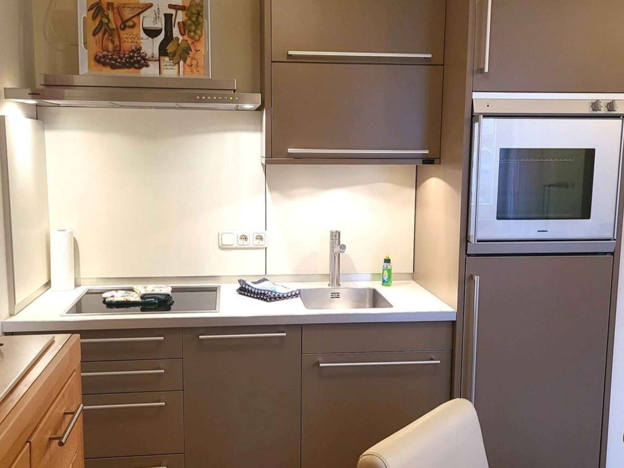 Küche mit Ceranfeld, Kühlschrank mit Gefrierfach, Kaffeemaschine, Toaster, Wasserkocher und Geschirrspüler