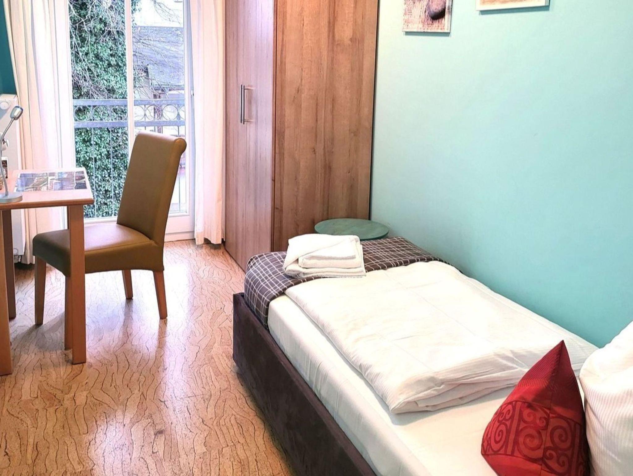Gästezimmer mit Einzelbett, Kleiderschrank und Schreibtisch