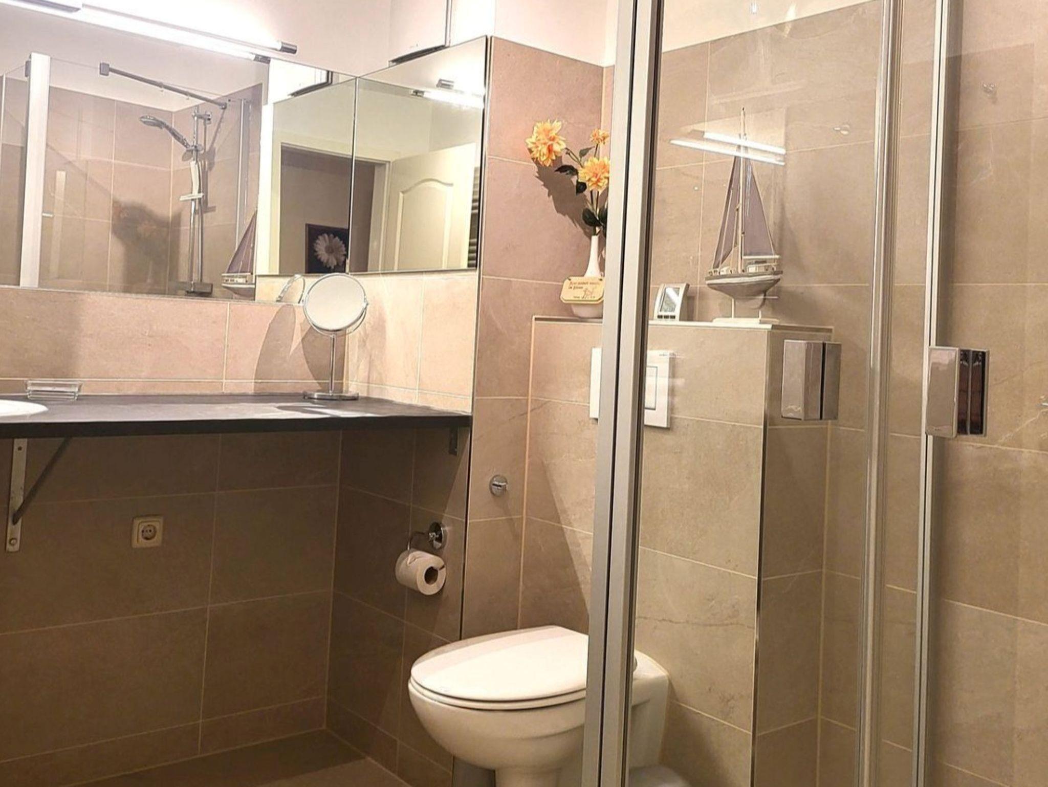 Bad mit ebenerdiger Dusche/WC und großzügige Ablageflächen