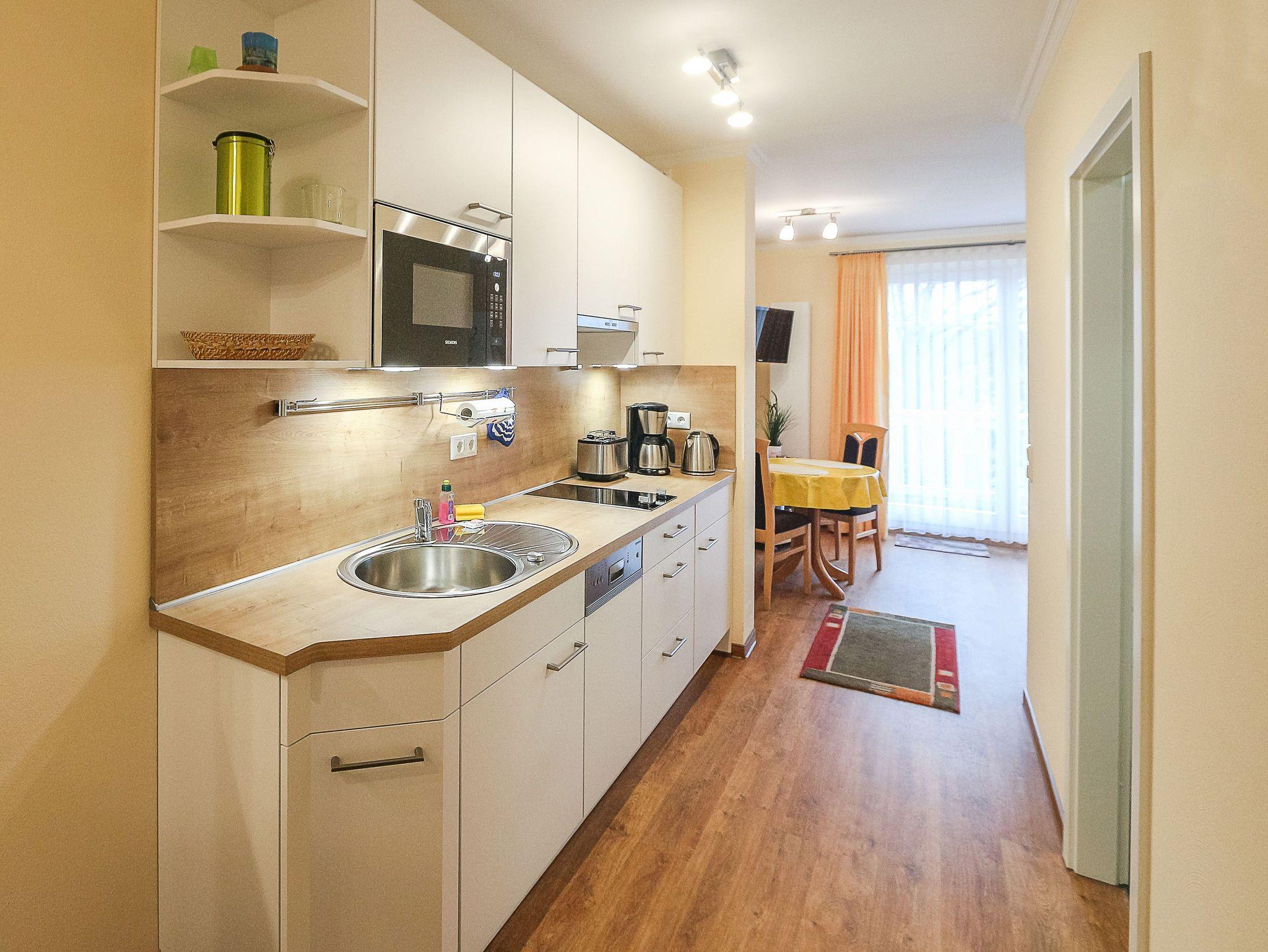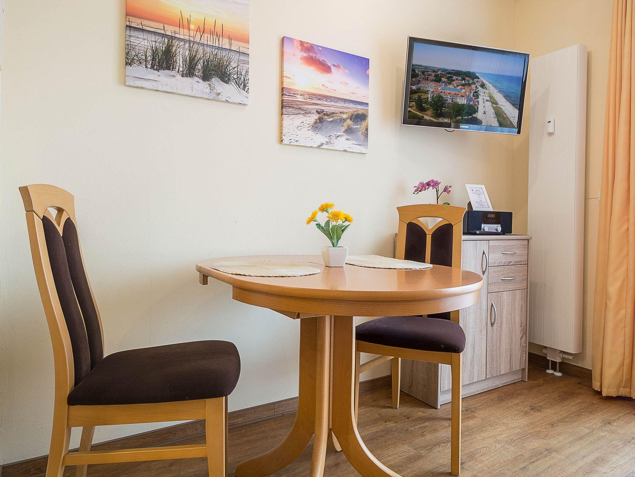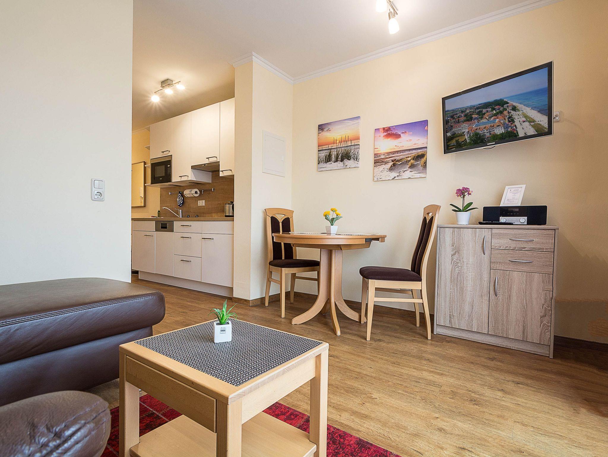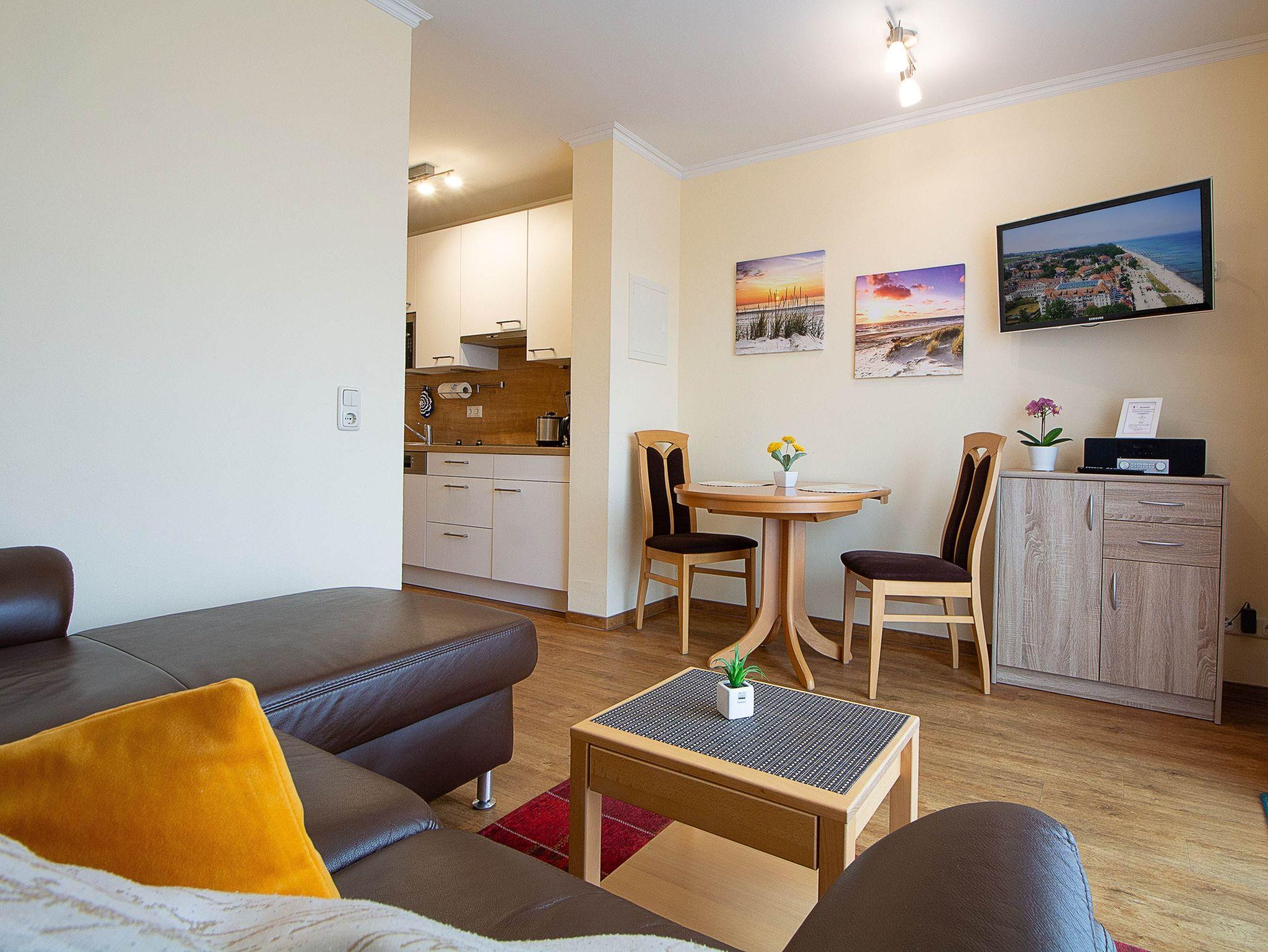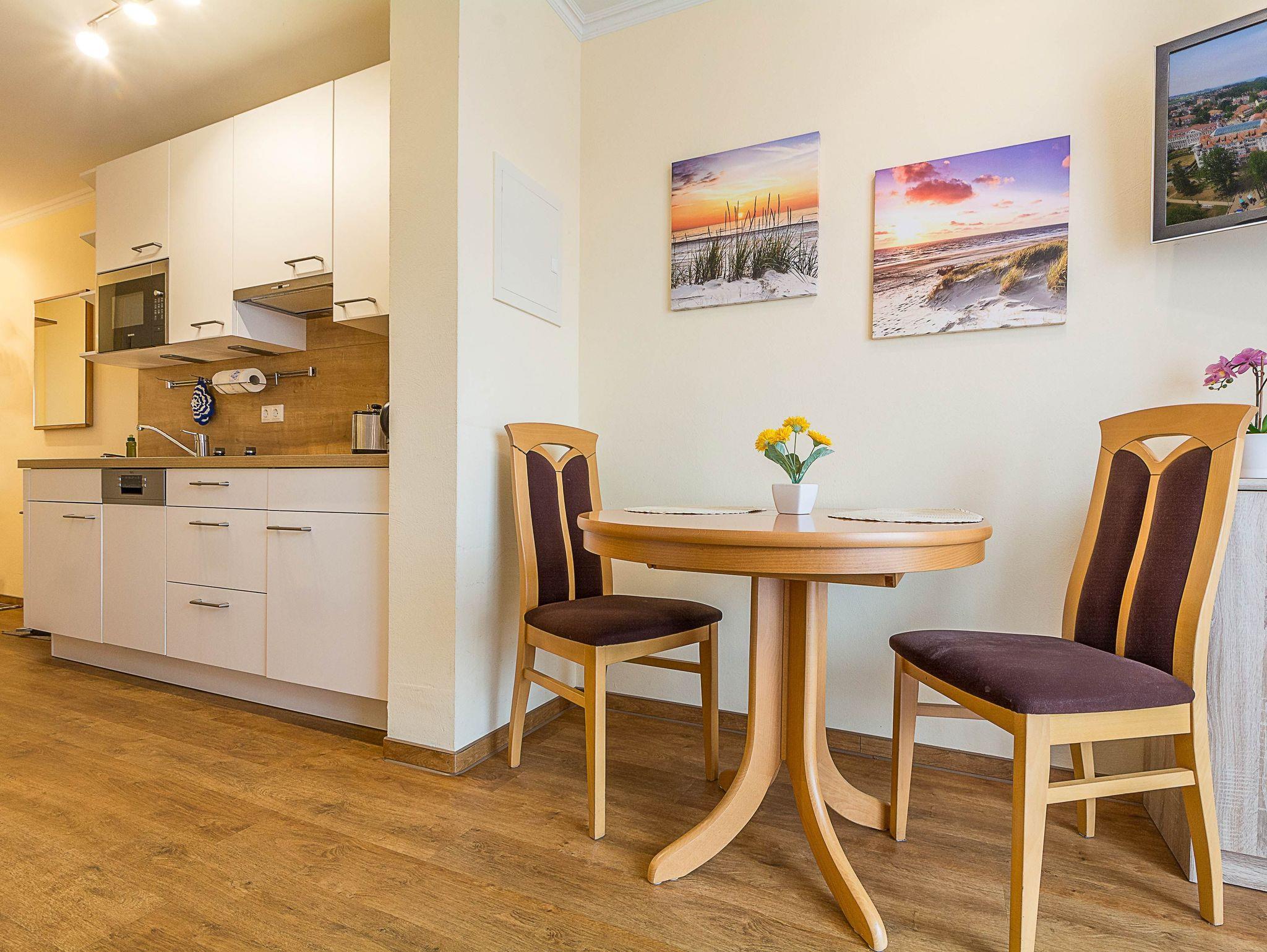 Herzlich Willkommen in unserer liebevoll eingerichteten Ferienwohnung Nr. 4.03 im Haus Meeresblick. Die gemütliche 2-Raum-Ferienwohnung von etwa 40qm Größe befindet sich auf der Ost-Seite des Hauses Meeresblick im vierten Obergeschoss und ist hervorragend für 2 Personen geeignet. Die Wohnung bietet all jenen Komfort, den der anspruchsvolle Gast für seinen erholsamen Urlaub erwartet. Es begrüßt Sie ein freundlicher offener Wohn- und Essbereich mit Lederecksofa mit Canapé sowie 32 Zoll-LED-Fernseher mit Kabelempfang und Kabel-Radio. Die offene Küchenzeile ist mit allen wichtigen Küchengeräten ausgestattet, die Sie für Ihr „perfektes Dinner“ benötigen: Geschirrspüler, Kühlschrank mit Eisfach, 2 Platten-Kochfeld, Mikrowelle, Kaffeemaschine, Toaster, Wasserkocher sowie reichlich Geschirr, Gläser, Besteck und Kochutensilien sind vorhanden. Vom Wohnbereich betreten Sie den möblierten Ost-Balkon mit herrlichem seitlichem Ausblick über die Strandpromenade auf die Ostsee. Von hier können Sie Ihr Frühstück in der Morgensonne genießen. Im Schlafzimmer befinden sich ein Doppelbett in massiver Kernbuche sowie mit Komforthöhe, 180 x 200 cm Liegefläche und Kaltschaummatrazen sowie ein Kleiderschrank. Das moderne Duschbad ist funktionell eingerichtet u.a. mit flacher Duschwanne, Waschbecken, großem Spiegel sowie einem Fön.