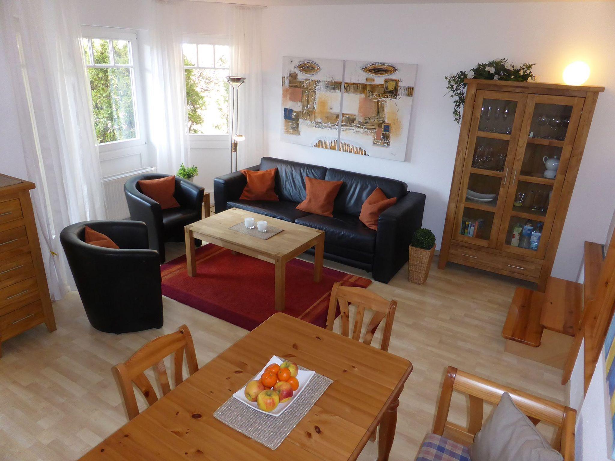 Der Wohnbereich ist über drei Treppenstufen erreichbar und ist mit einer Ledersitzgruppe inklusive Doppelschlafsofa (170 x 200 cm Liegefläche) und einem Esstisch ausgestattet. Zur technischen Ausstattung gehören ein 49 LED-Fernseher und eine Hifi-Anlage mit CD-Player.