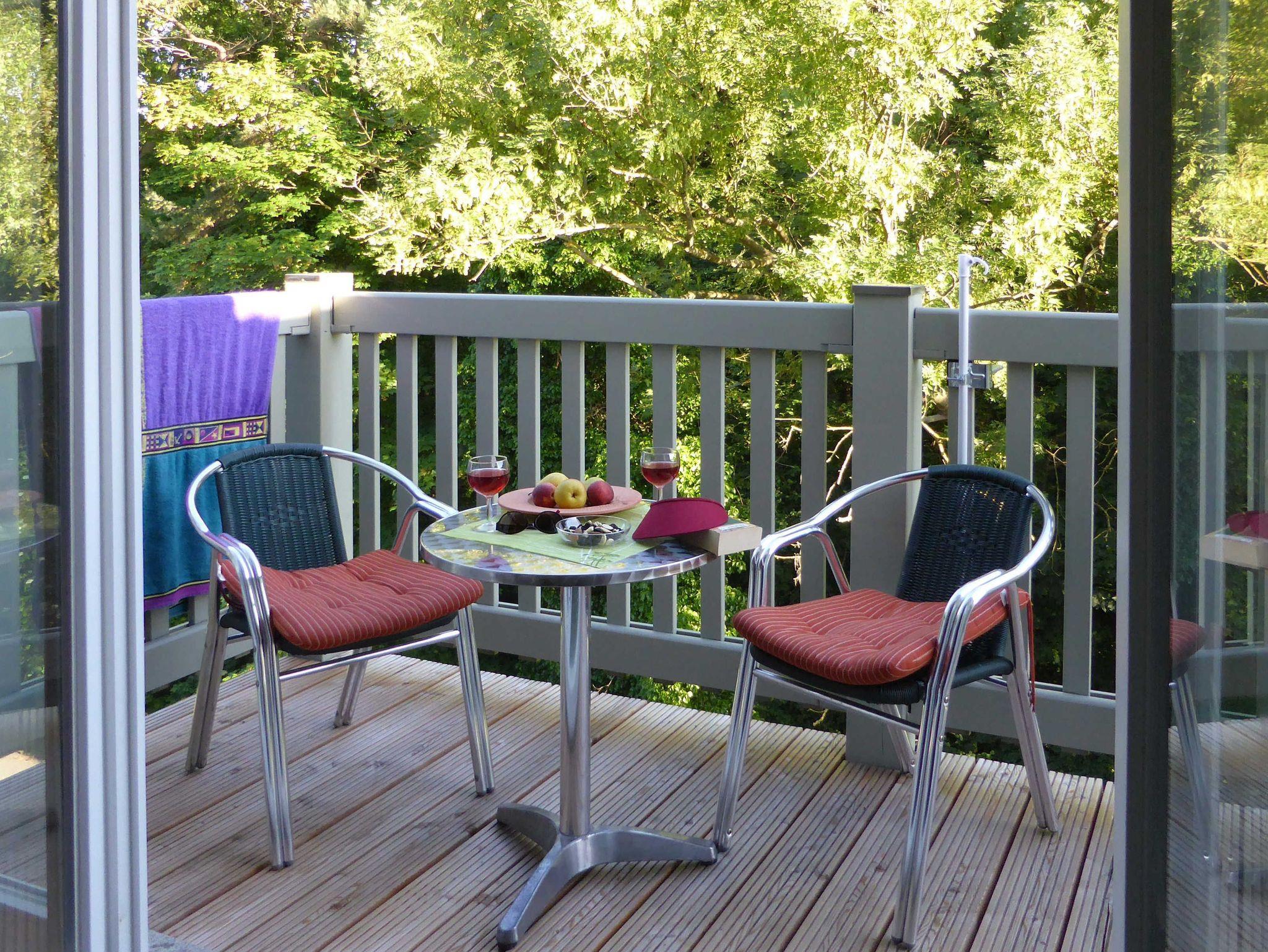 Südbalkon mit Tisch und Stühlen.