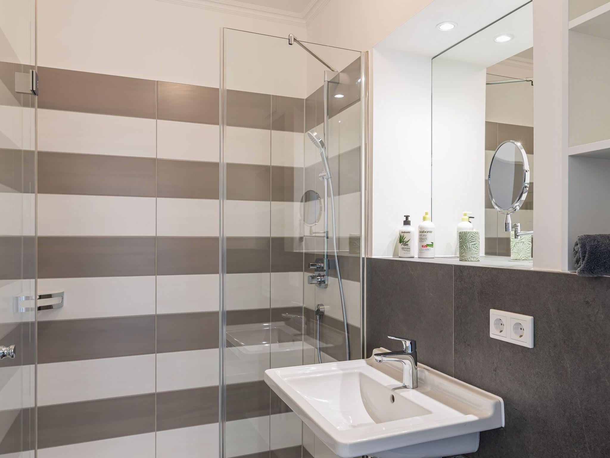 Das Bad verfügt über eine Dusche, einem Haartrockner und einem Handtuchtrockner. Zu Ihrem Apartment gehört ebenfalls ein großer und lichtdurchfluteter Wohn- und Essbereich mit offener Küche.