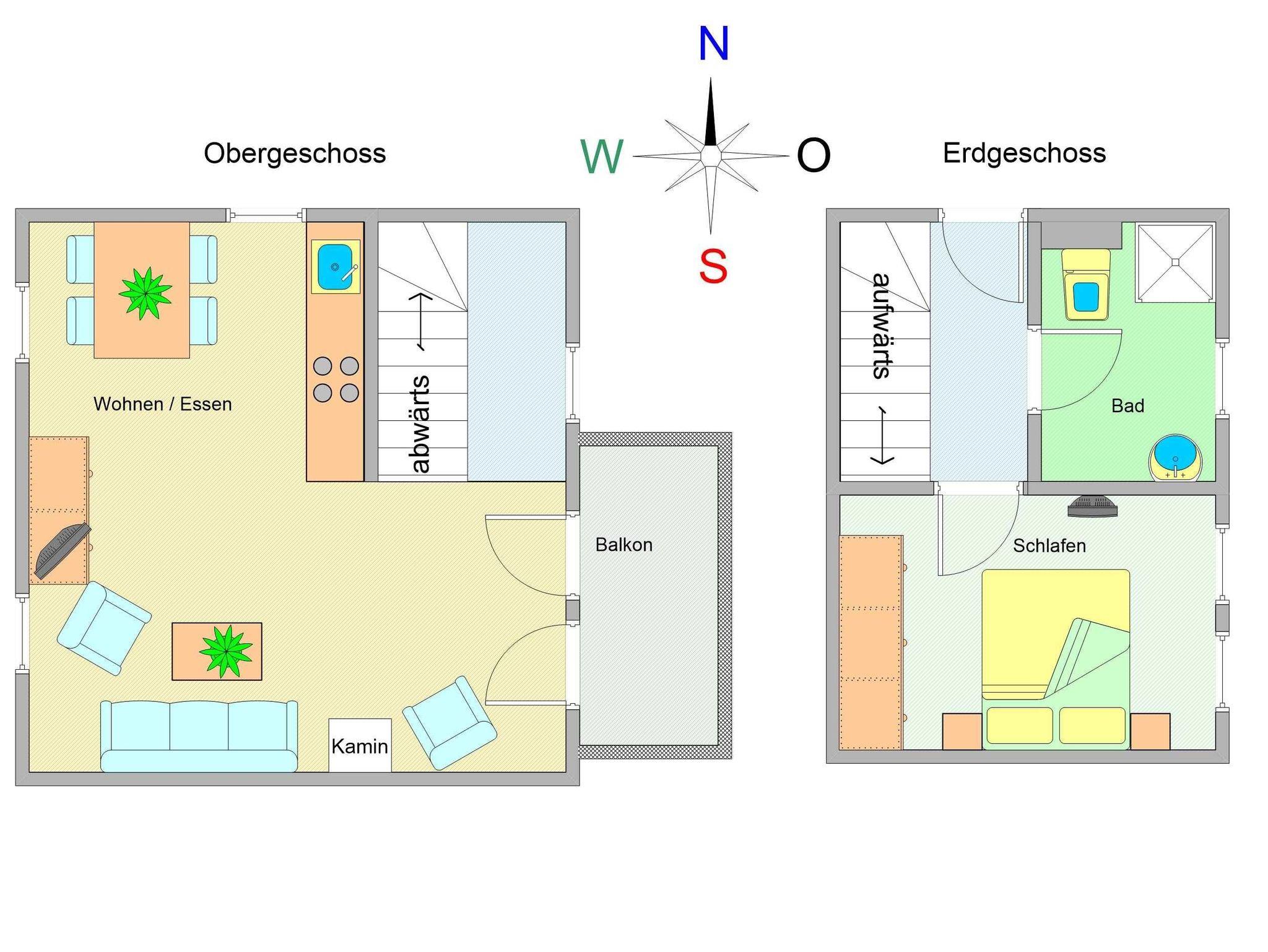 Die für den Aufenthalt von 2 Personen zugeschnittene 2-Raum-Ferienwohnung ist rund 55 Quadratmeter groß und verläuft über 2 Etagen. Das Schlafzimmer mit gemütlichem Doppelbett (2 x 90cm x 200cm) und einem modernen Bad mit WC und Dusche liegen im Erdgeschoss.