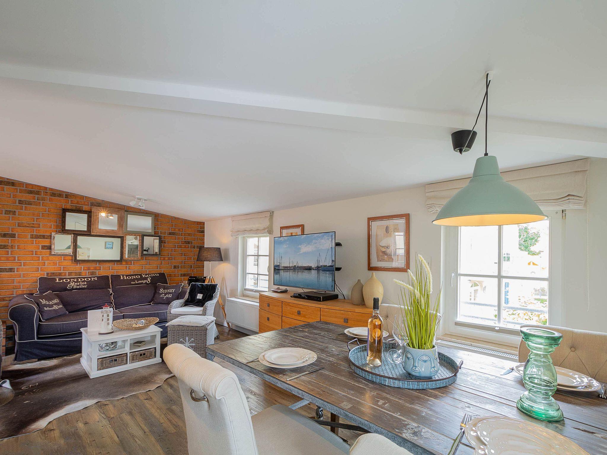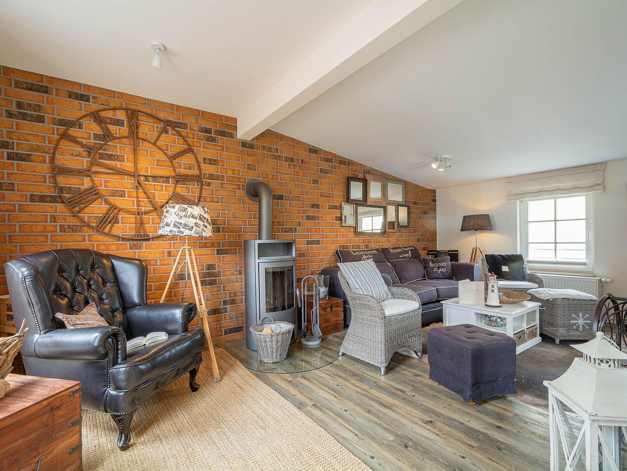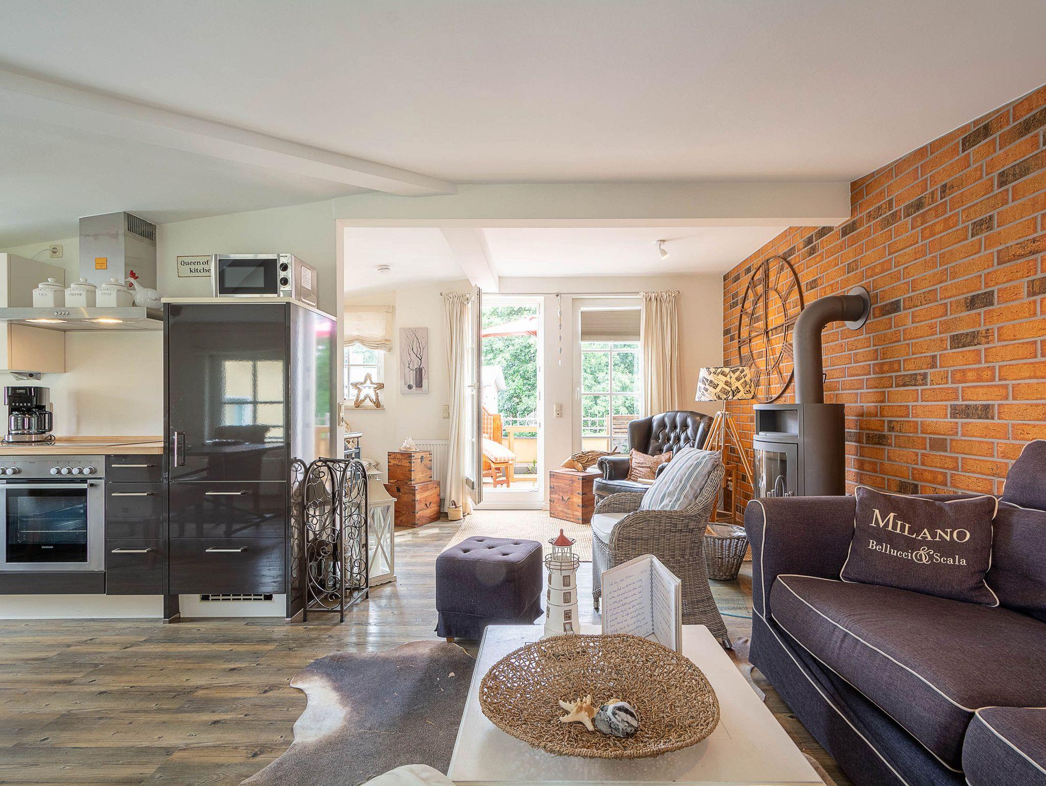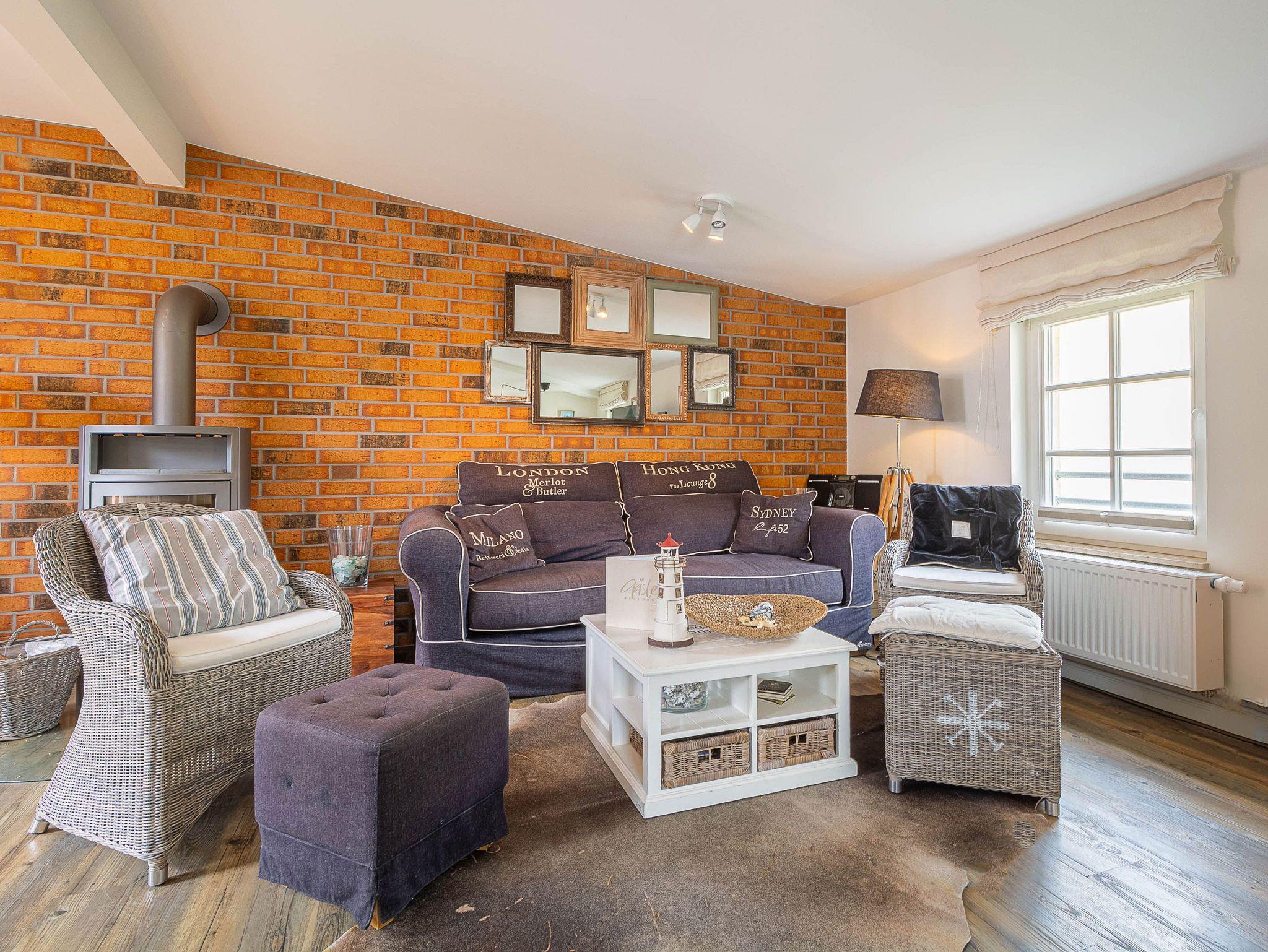 Der stilvoll und gleichzeitig funktional eingerichtete Wohnraum im 1. Obergeschoss wird mit seinem Kamin und einer Schlafcouch zu einem gemütlichen Treffpunkt nach einem erlebnisreichen Tag am Strand. In diesen lichtdurchfluteten Raum ist eine Küchenzeile mit Komplettausstattung für die Selbstversorgung integriert. Die Küchenzeile ist ausgestattet mit Kühl/Gefrierkombination, Herd, Geschirrspüler, Kaffeemaschine, Wasserkocher, Toaster usw. Erholung pur erwartet den Urlauber dieses Feriendomizils auf dem Balkon mit Ostausrichtung. Gästen dieser Ferienwohnung steht kostenloses WLAN zur Verfügung (ohne Rechtsanspruch).