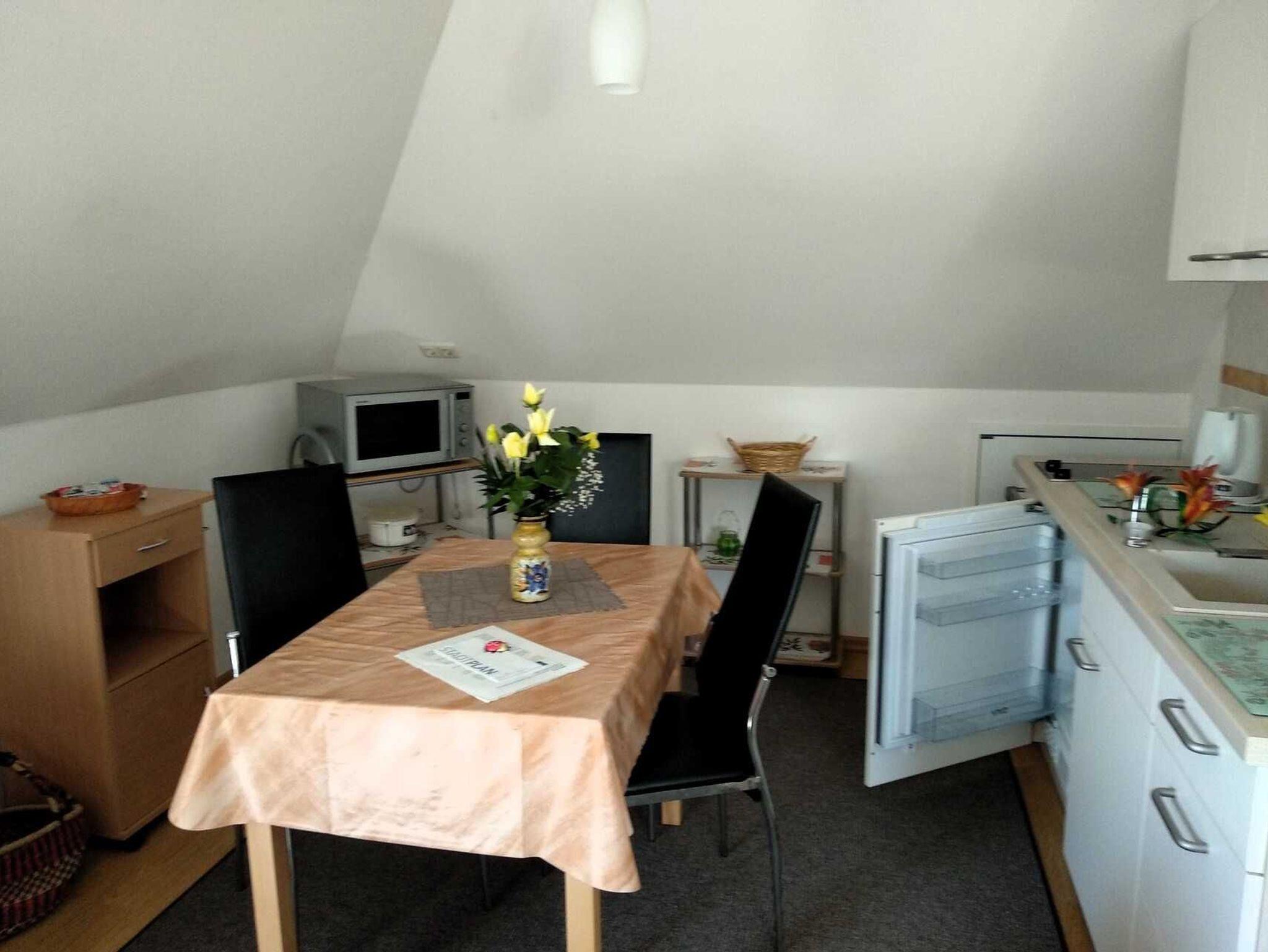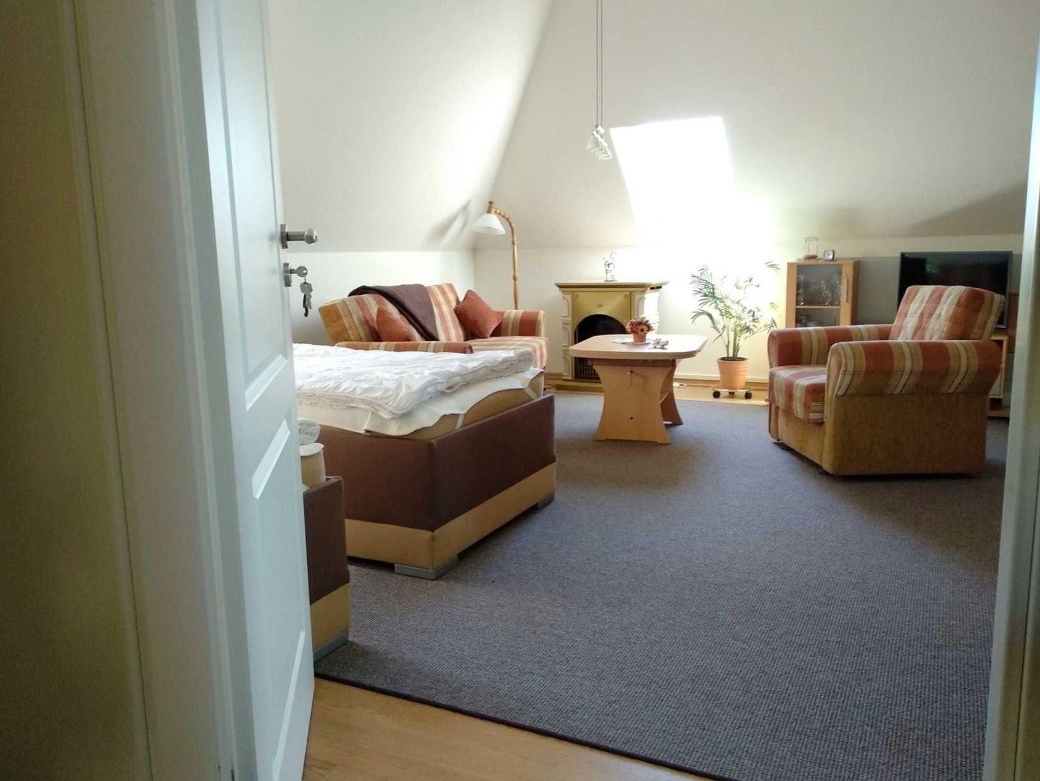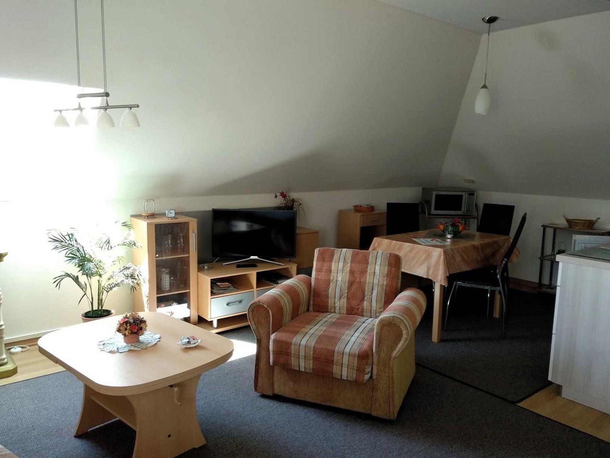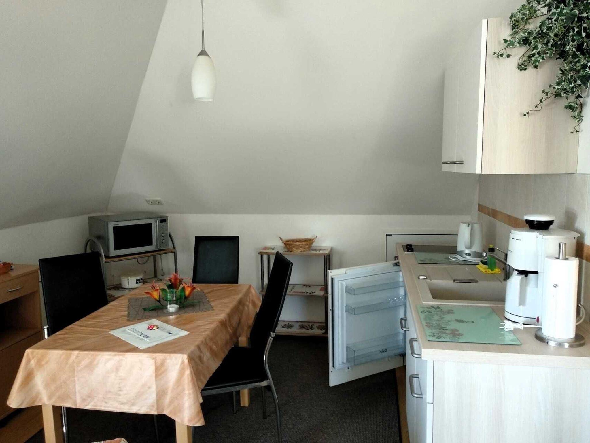 Die Ferienwohnung Abendsonne befindet sich im Dachgeschoss des Hauses und besteht aus einem kombinierten Wohn- Schlafzimmer mit Couch, Polsterliegen und Sat-TV, einer Küchenzeile mit Kochfeld, Eier- und Wasserkocher, Mikrowelle sowie Bad mit WC / Dusche.