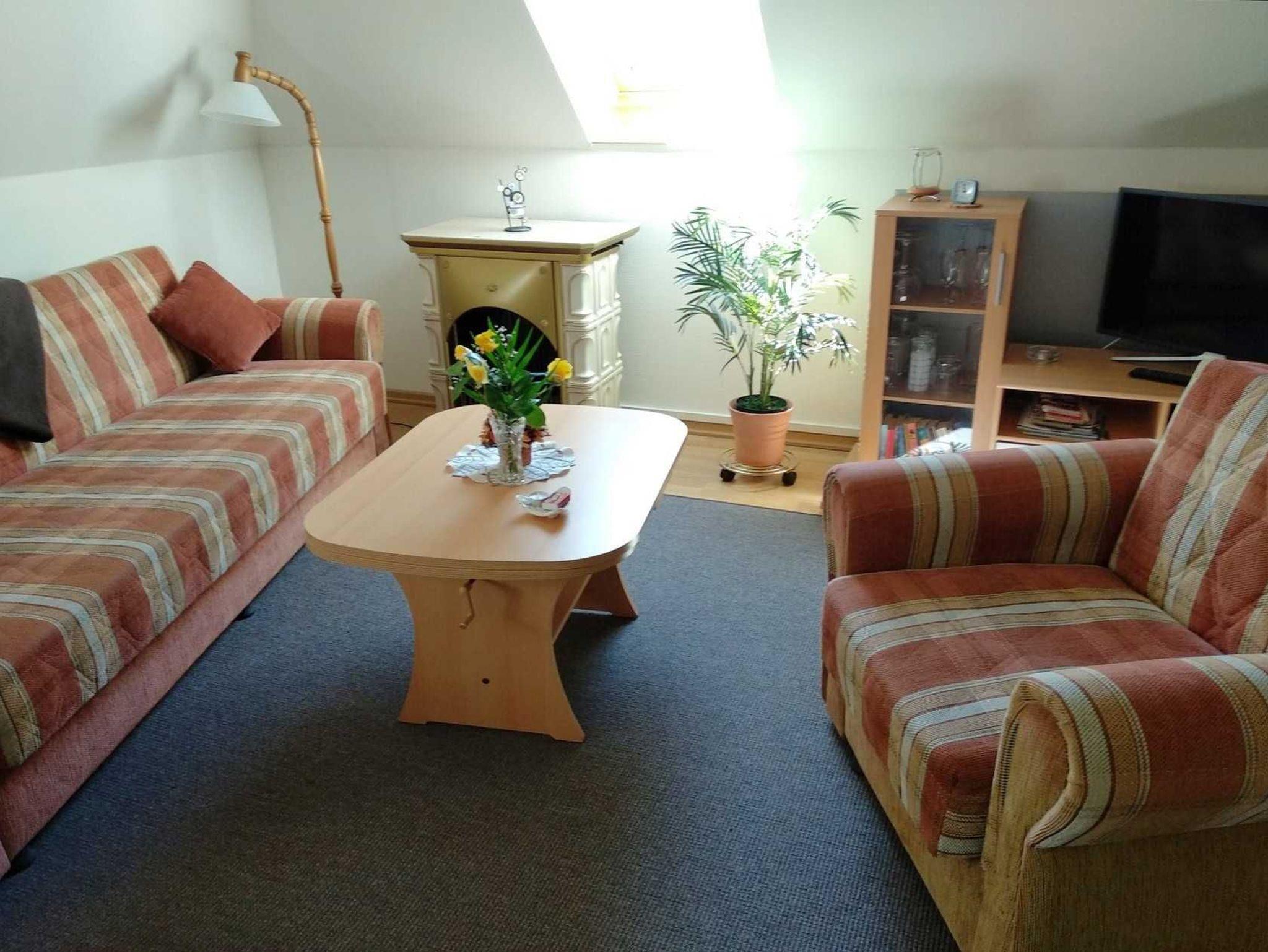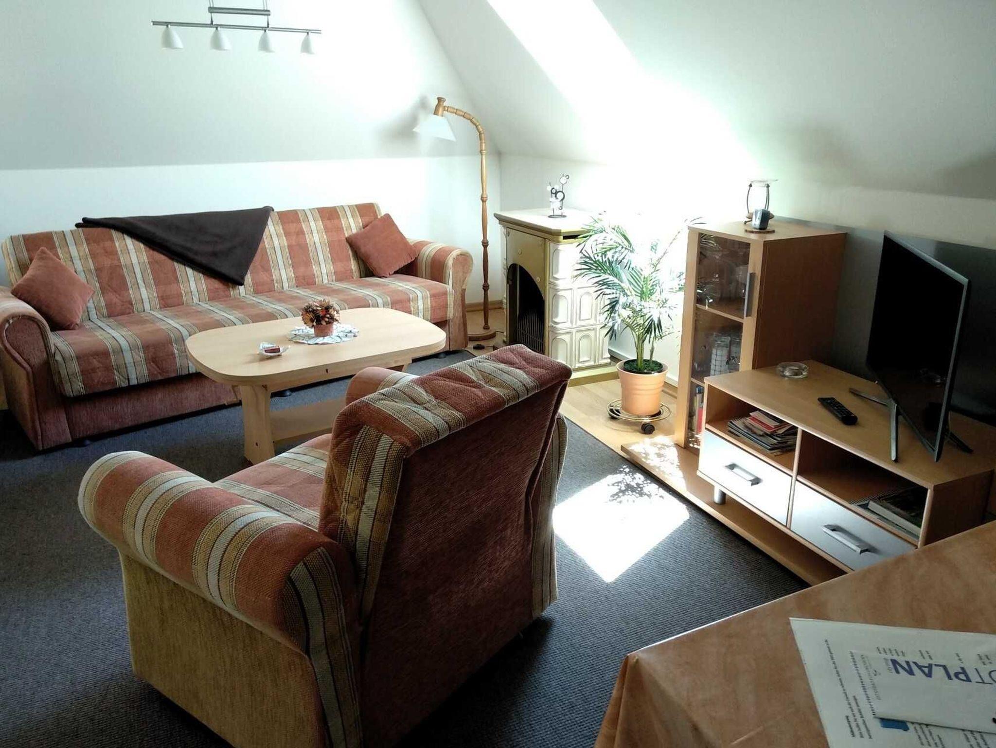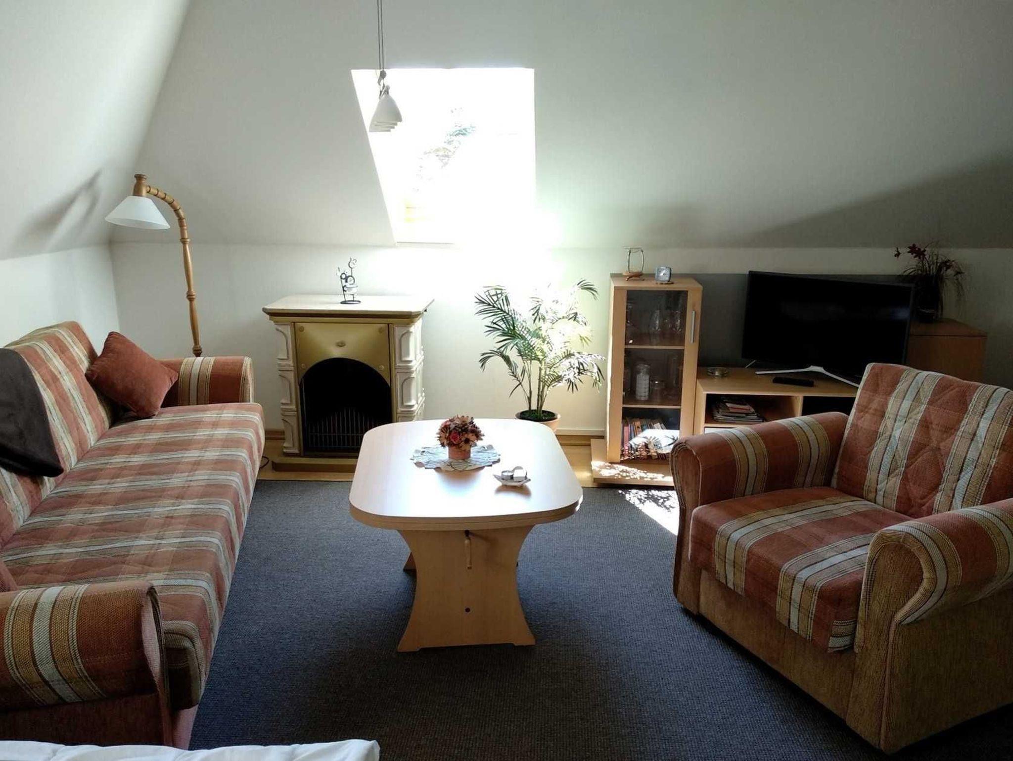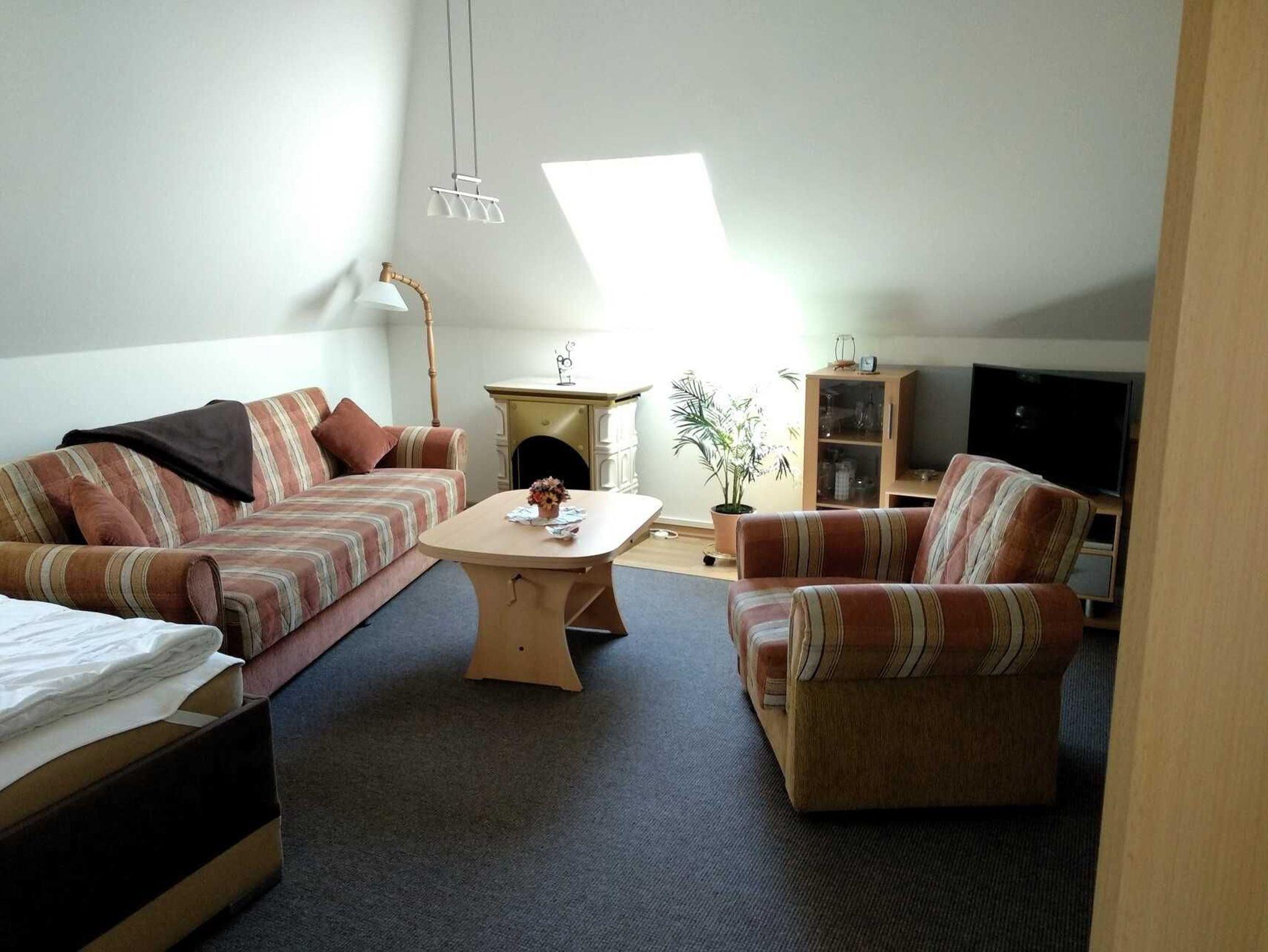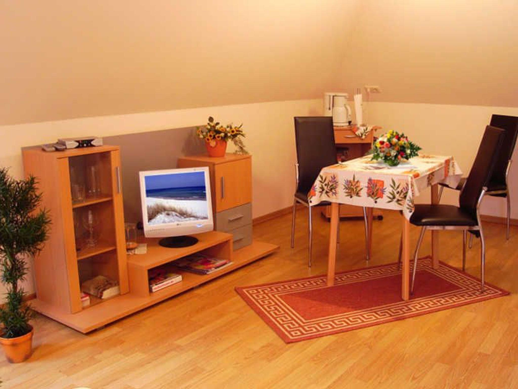 Die Ferienwohnung Abendsonne befindet sich im Dachgeschoss des Hauses und besteht aus einem kombinierten Wohn- Schlafzimmer mit Couch, Polsterliegen und Sat-TV, einer Küchenzeile mit Kochfeld, Eier- und Wasserkocher, Mikrowelle sowie Bad mit WC / Dusche.