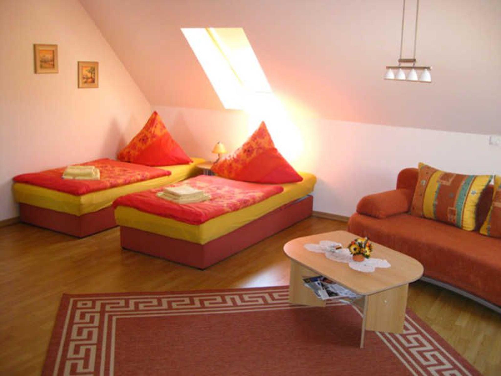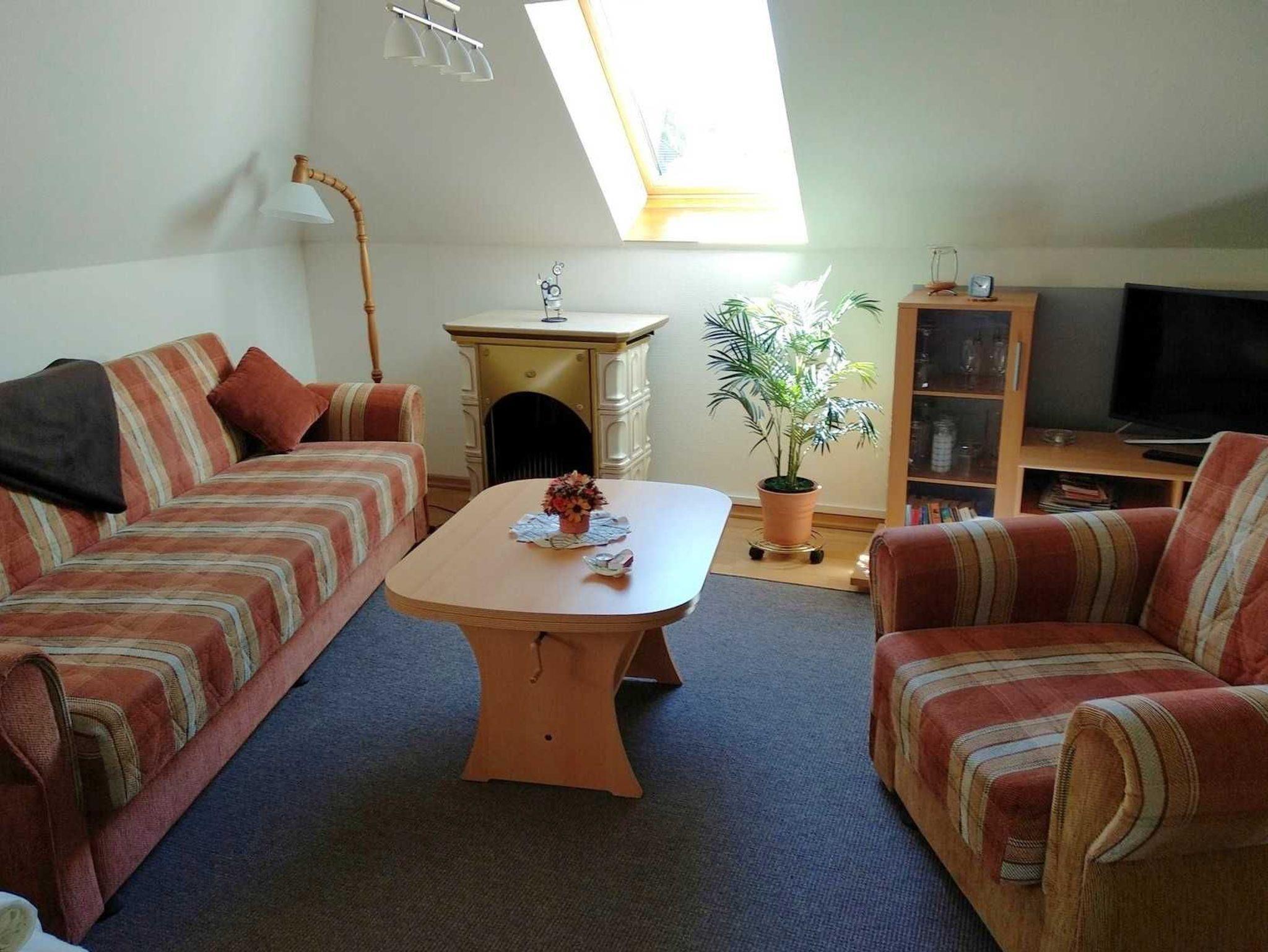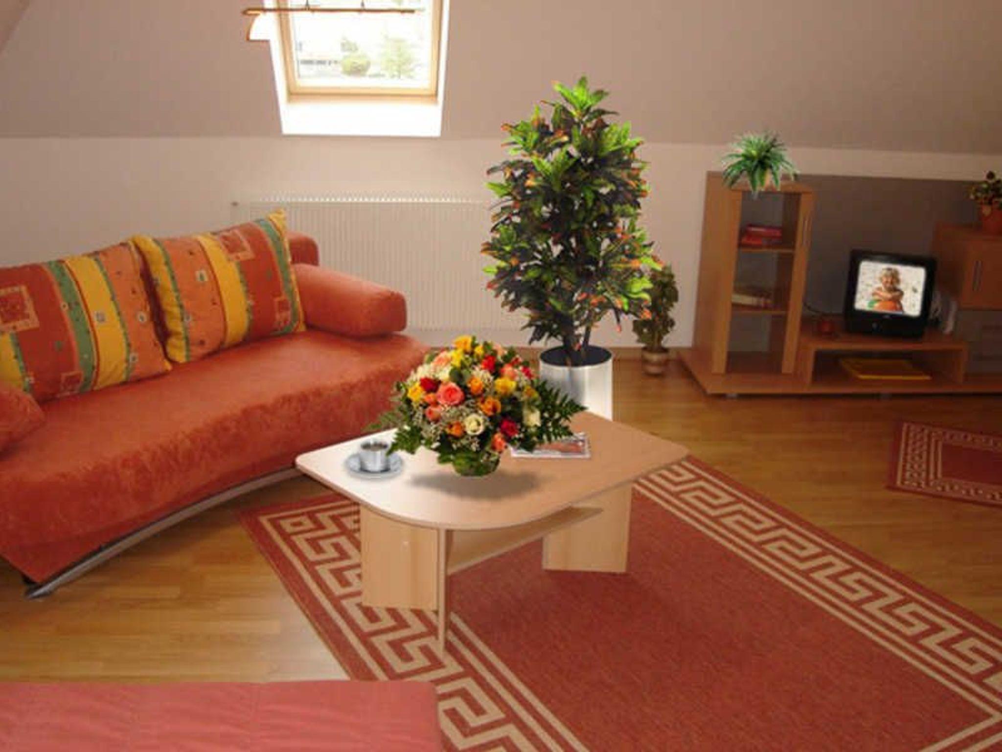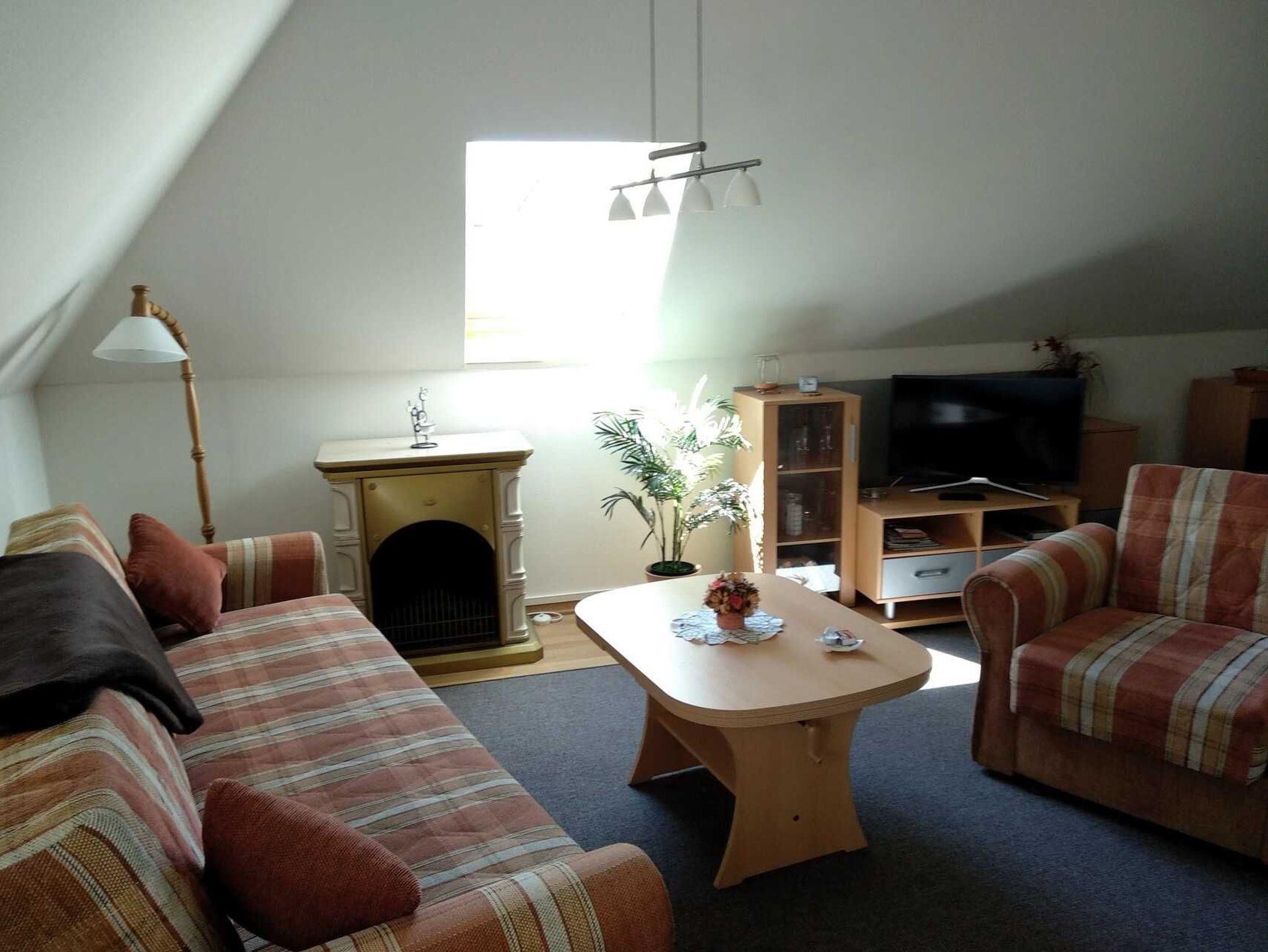 Die Ferienwohnung Abendsonne befindet sich im Dachgeschoss des Hauses und besteht aus einem kombinierten Wohn- Schlafzimmer mit Couch, Polsterliegen und Sat-TV, einer Küchenzeile mit Kochfeld, Eier- und Wasserkocher, Mikrowelle sowie Bad mit WC / Dusche.