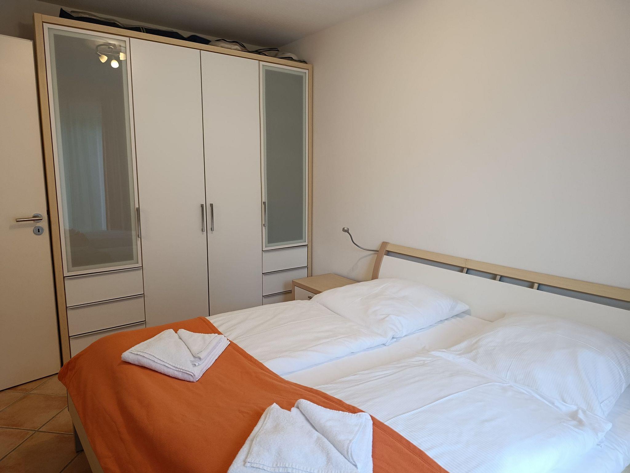 Schlafzimmer mit Doppelbett und Kleiderschrank