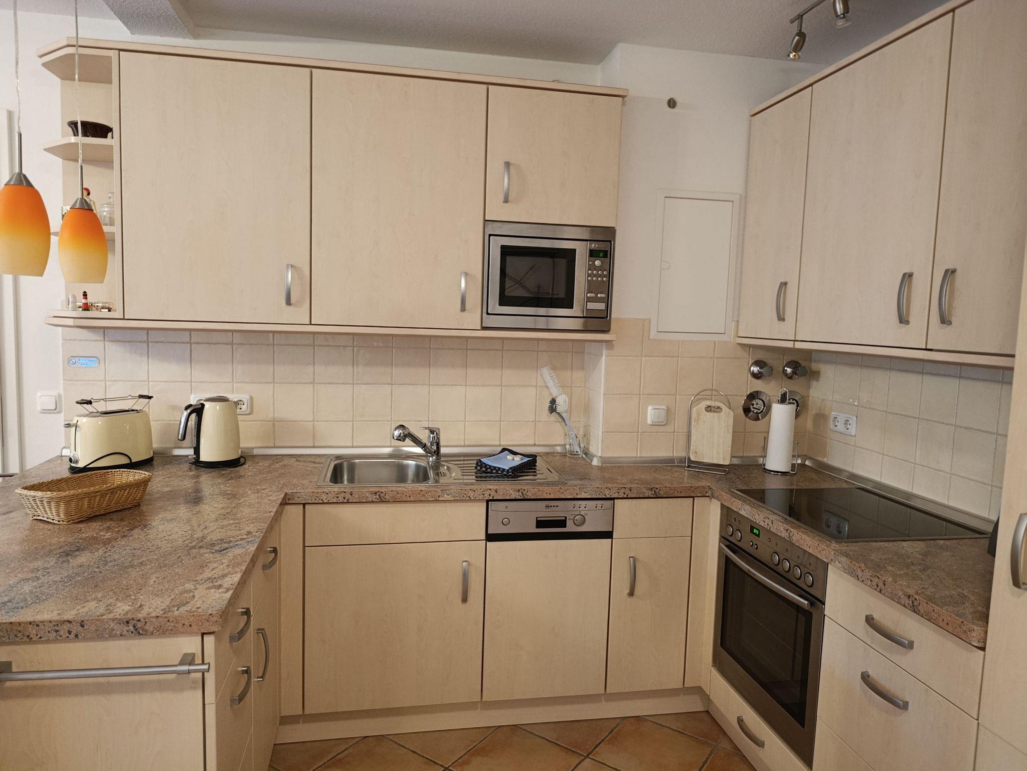 Küchenzeile mit Mikrowelle, Kühlschrank mit Gefrierfach, 4-Platten-Ceranfeld, Backofen, Geschirrspüler, Toaster,