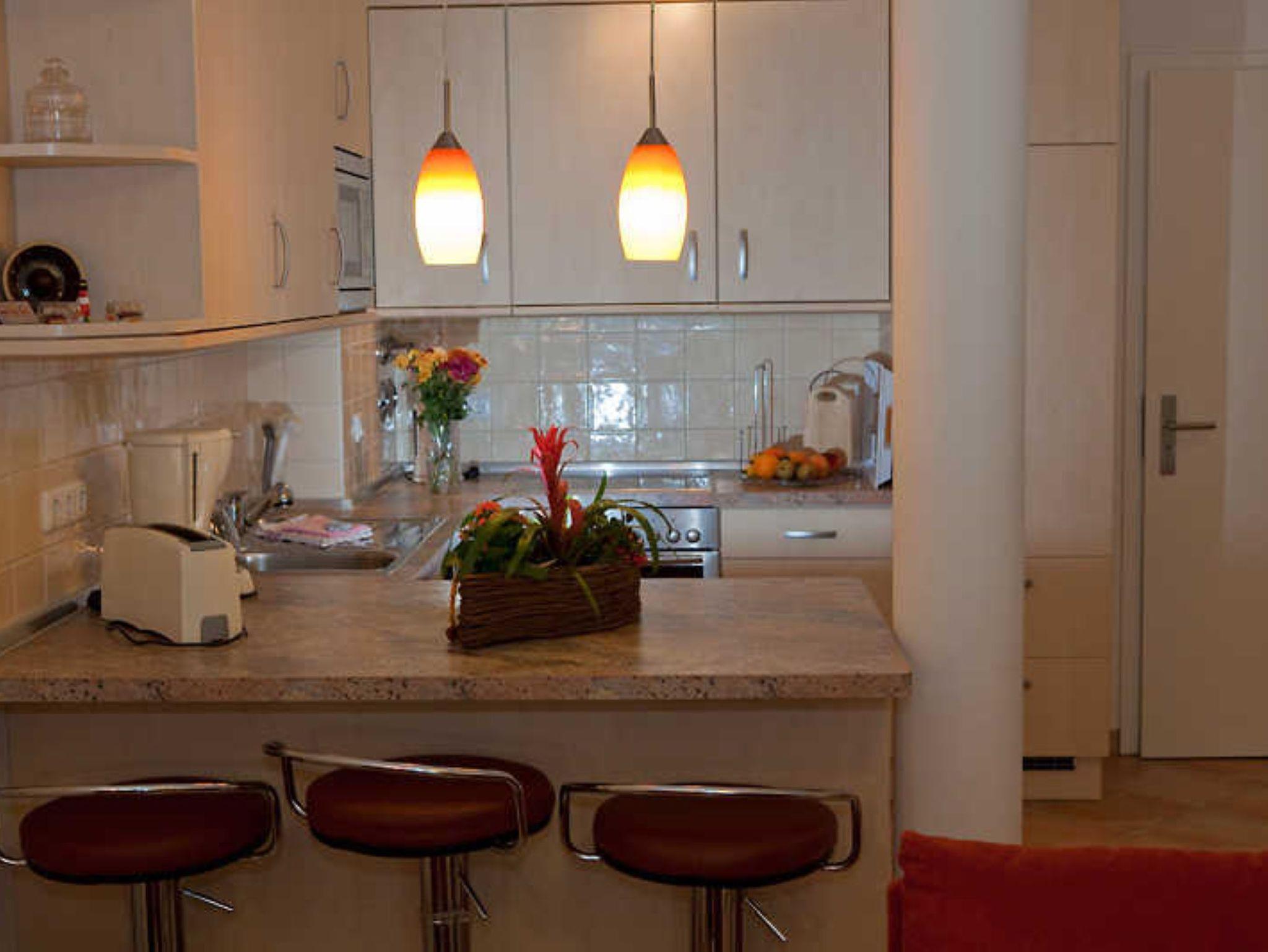 Wohnzimmer mit Schlafcouch, Anrichte, Kabel-TV und Radio, Küchenzeile mit Tresen und 3 Hocker