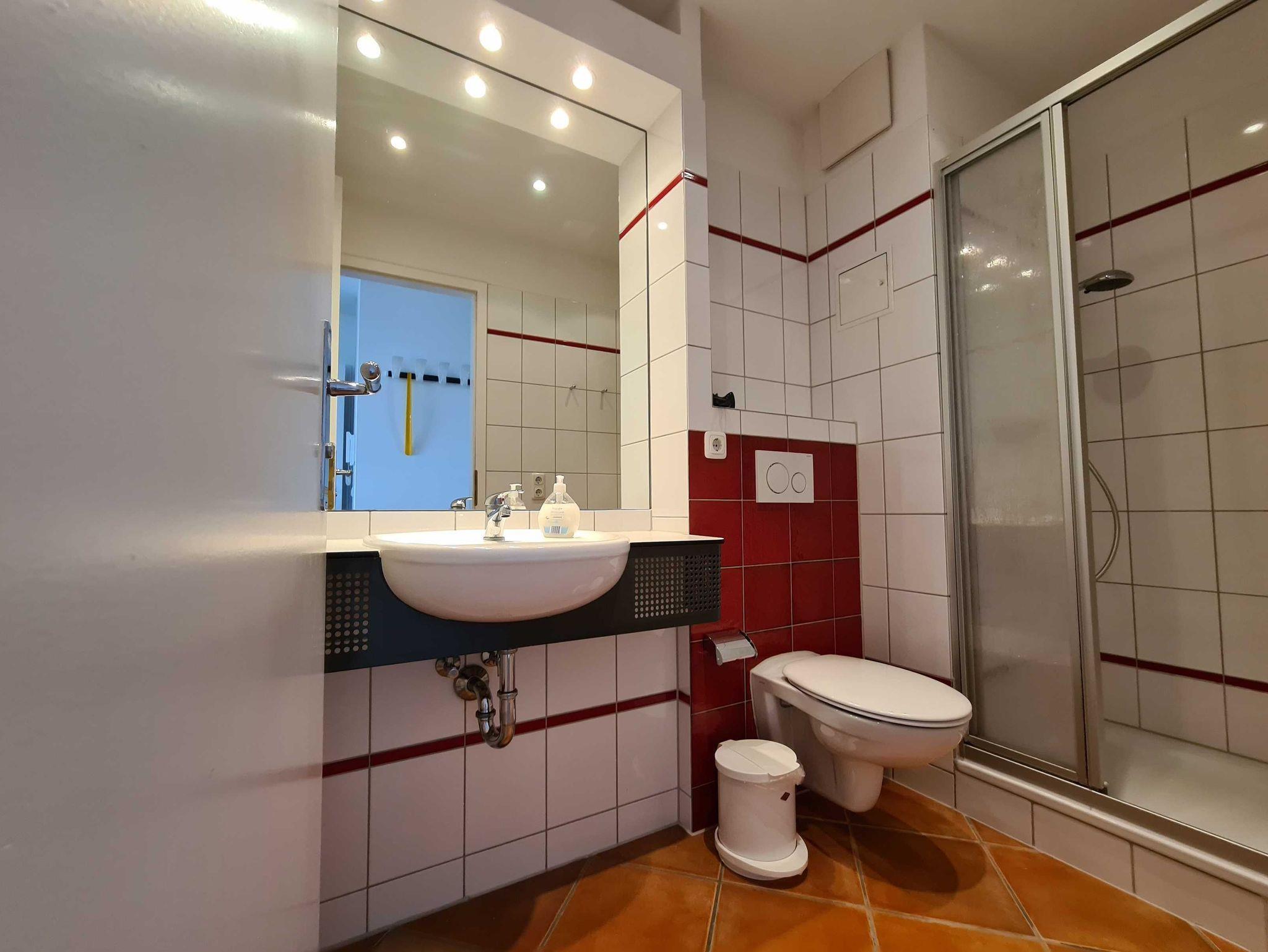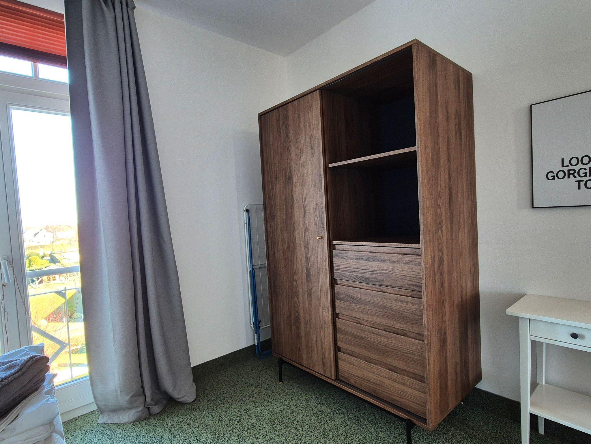 Die Ferienwohnung befindet sich im 2. Obergeschoss und bietet eine Wohnfläche von etwa 45qm. Der offene Wohn-Essbereich verfügt über eine gut ausgestattete Küche. Vom Wohnbereich aus gelangt man auf den Balkon, der einen herrlichen Weitblick über die Dächer von Kühlungsborn bietet. Das Schlafzimmer ist mit einem Schubladenbett für zusätzlichen Stauraum sowie einem Kleiderschrank und einer Kommode ausgestattet. Ein kleines Duschbad ergänzt die Ferienwohnung. Kostenfreies WLAN steht zur Verfügung. Im Außenbereich gibt es einen Fahrradschuppen sowie einen Stellplatz im Carport. Im Keller des Hauses gibt es eine Waschmaschine und einen Trockner mit Münzautomat. Auf Wunsch können ein Kinderreisebett (ohne Auflagen) und ein Hochstuhl gemietet werden. Haustiere können gegen Gebühr gerne mitgebracht werden.