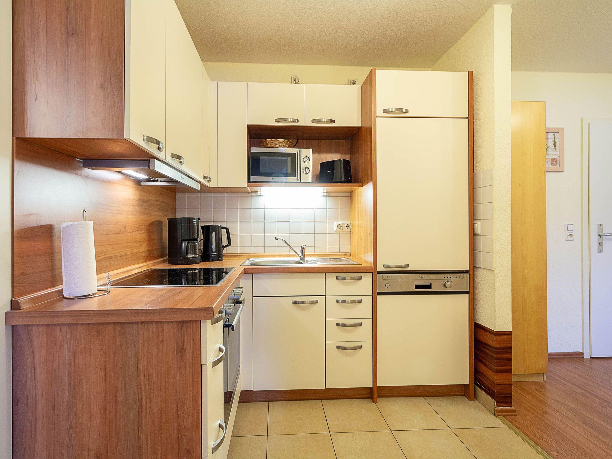 Die praktische Küchenzeile, die sich im Flur befindet, ist voll ausgestattet: Ein 4-Felder-Cerankochfeld, Backofen, Kühlschrank, Mikrowelle und Geschirrspüler lassen keine Wünsche offen und ermöglichen die Zubereitung leckerer Mahlzeiten während Ihres Urlaubs.