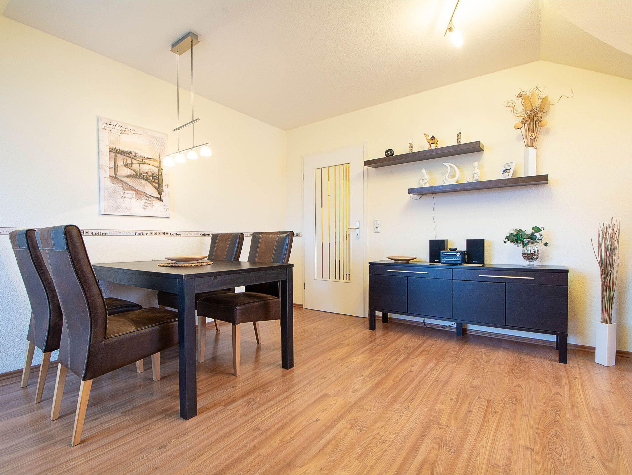 Der Wohnbereich lädt nach einem erlebnisreichen Tag am Meer zum Entspannen ein. Machen Sie es sich auf dem Sofa gemütlich oder genießen Sie gemeinsame Mahlzeiten am Esstisch, der für alle Gäste ausreichend Platz bietet.