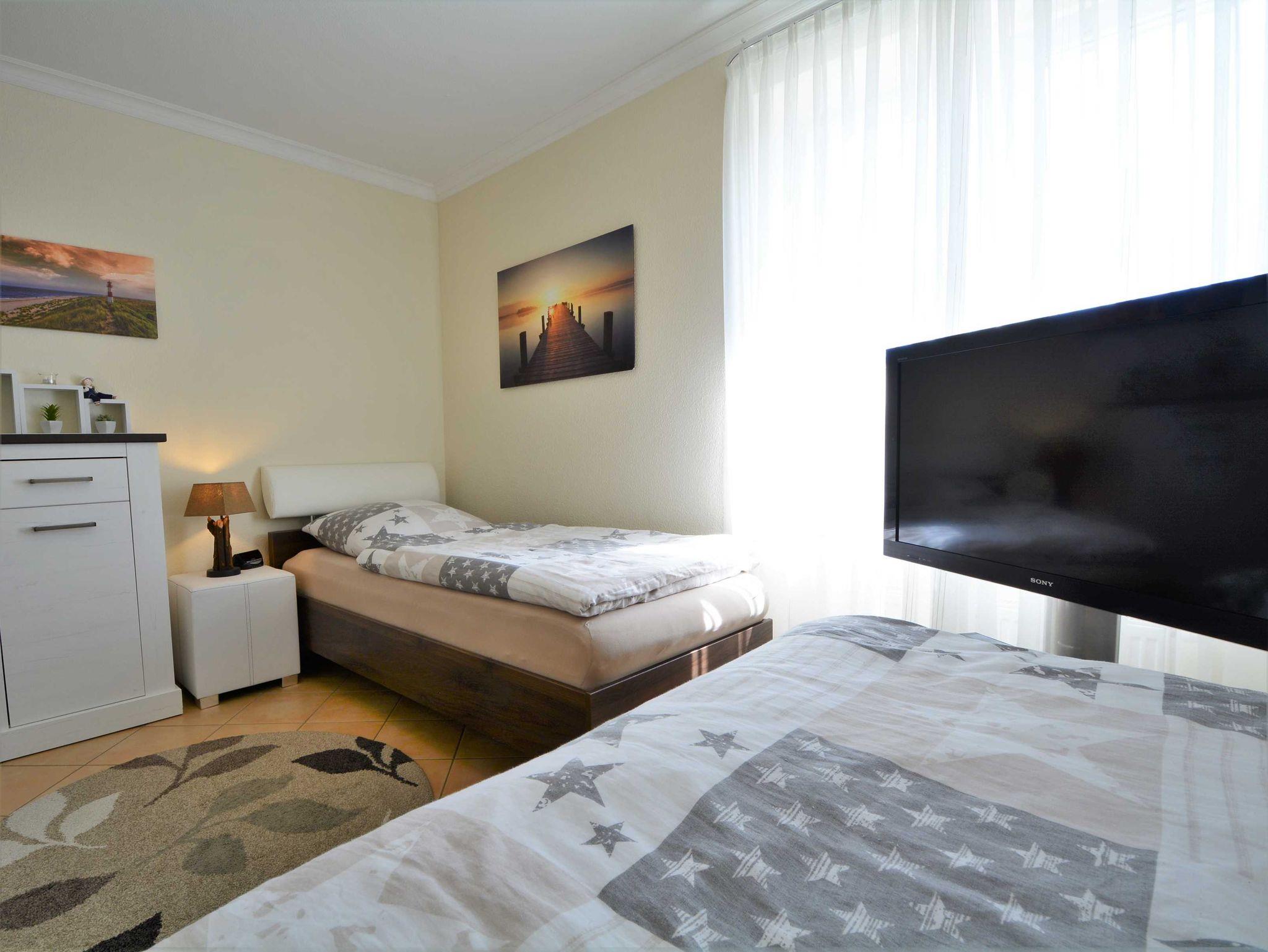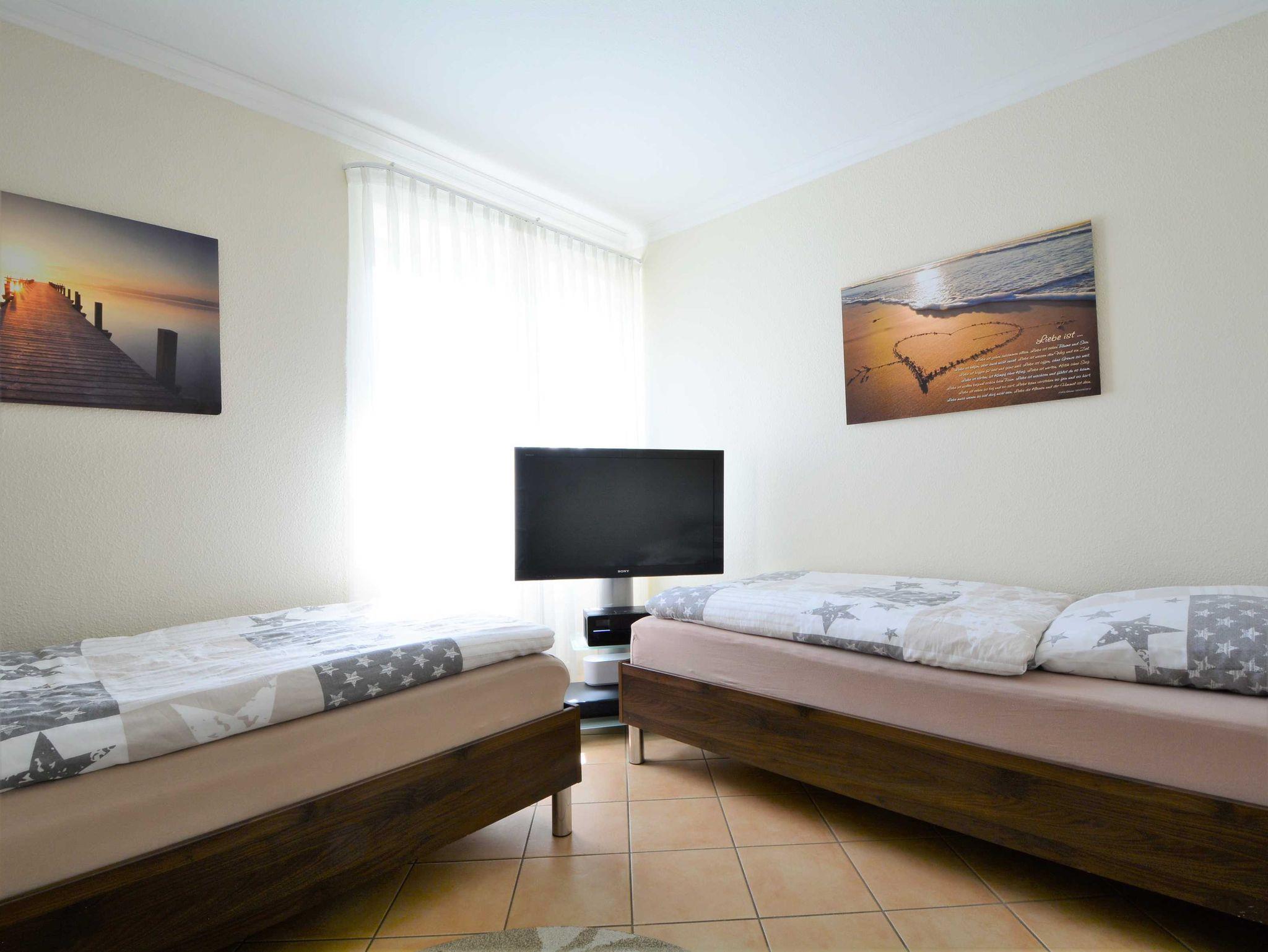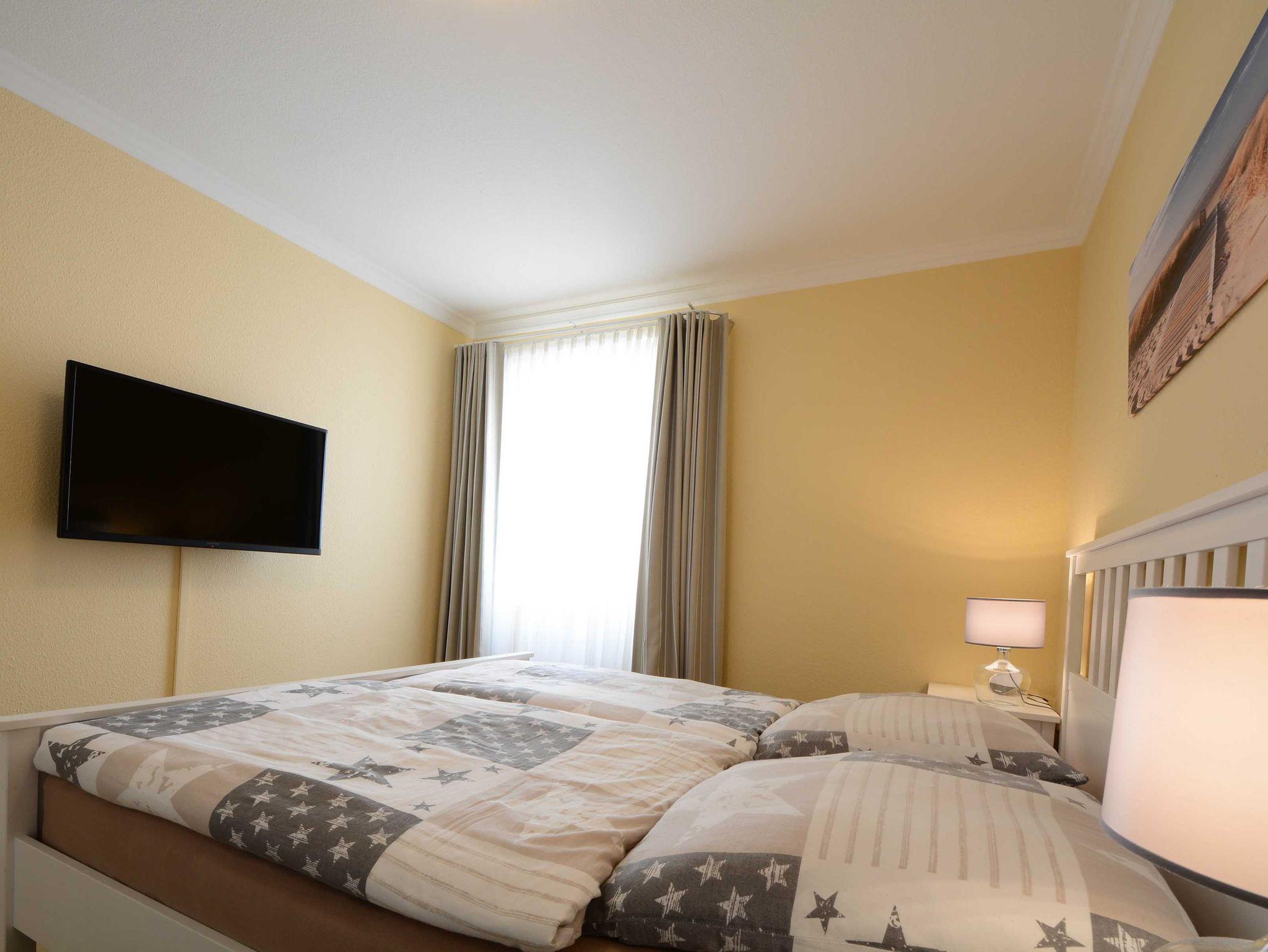Im ersten Schlafzimmer lädt Sie ein komfortables Doppelbett (2 x 90cm x 200 cm) zur Nachtruhe ein. Der großzügige Kleiderschrank bietet genügend Platz für Ihre Urlaubsgarderobe. Das zweite Schlafzimmer ist mit zwei Einzelbetten (jeweils 90cm x 200cm) ausgestattet. In beide Schlafzimmer sind 39-Zoll-TV-Geräte angebracht.