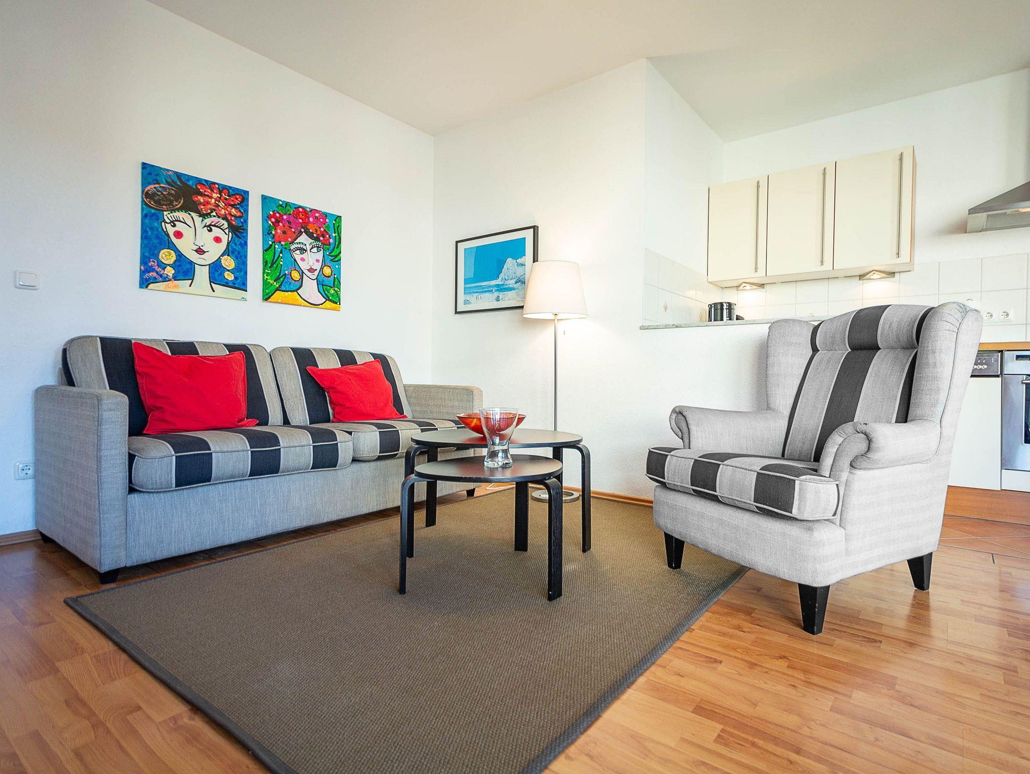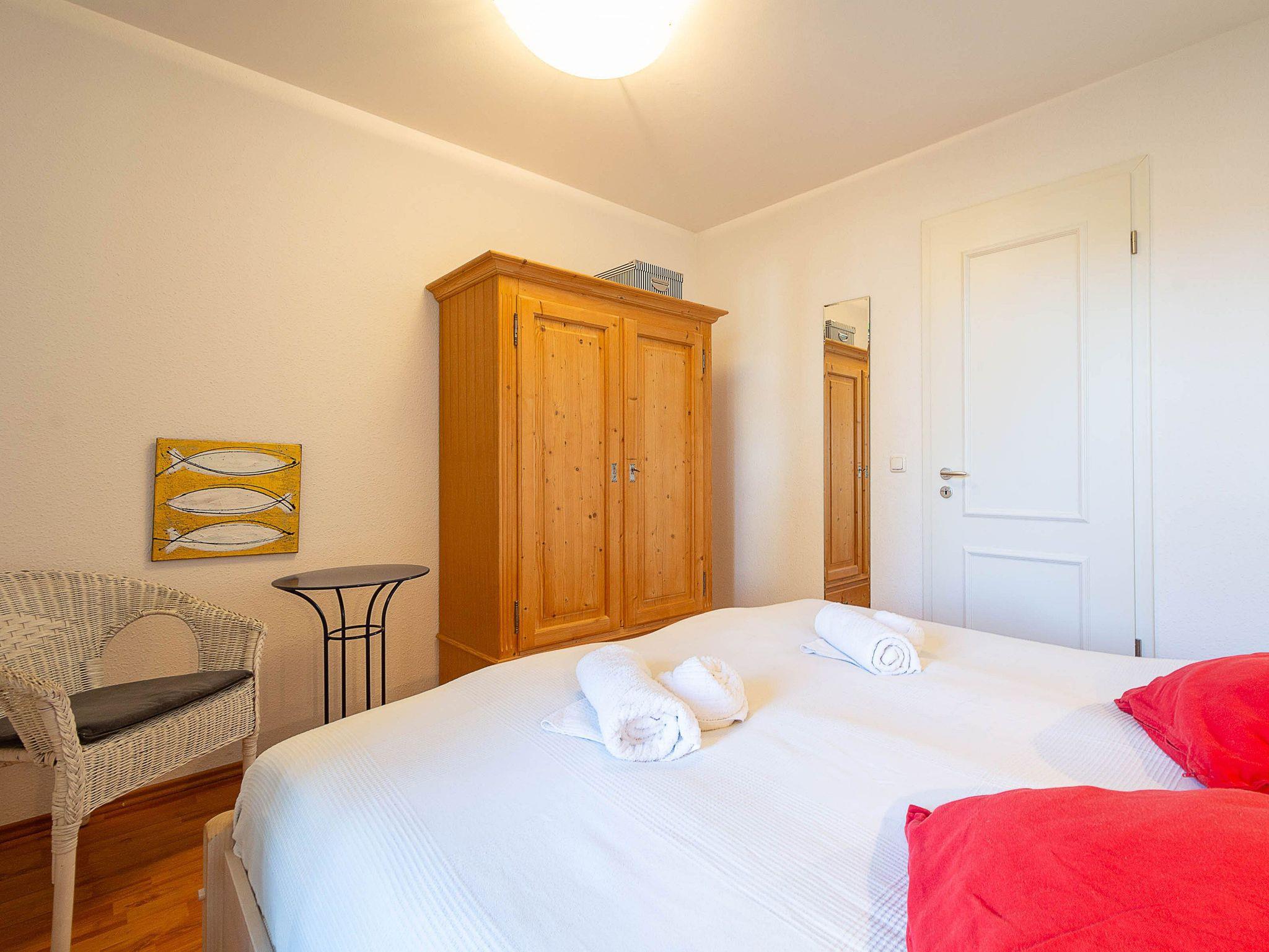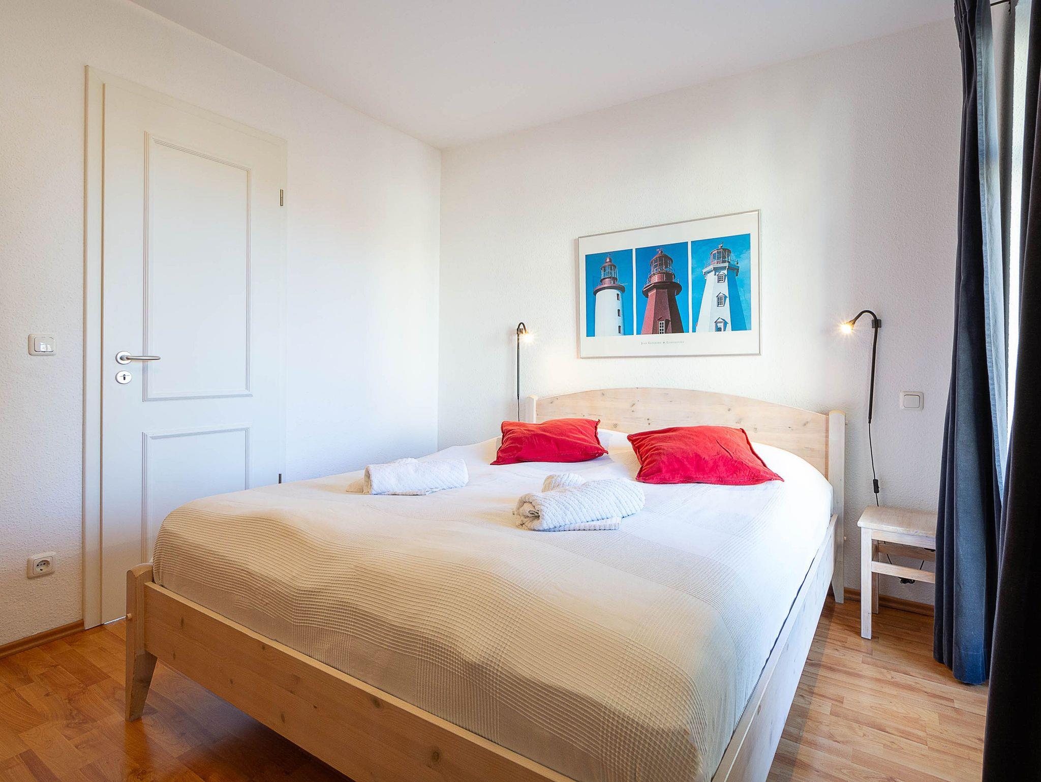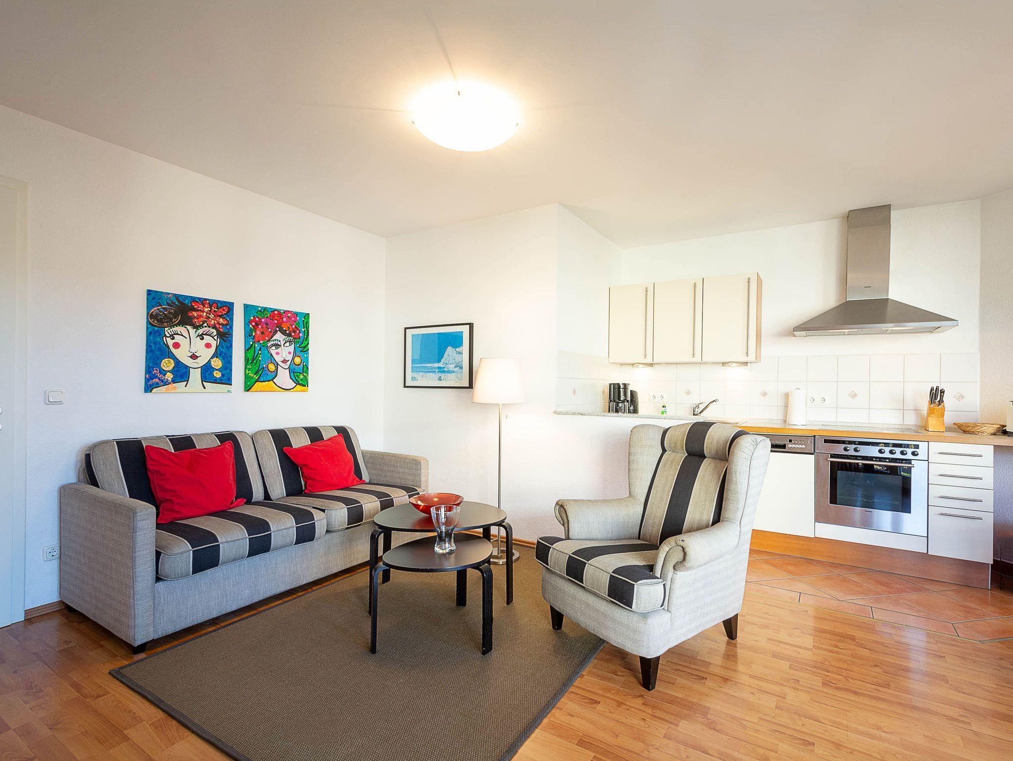 Sie wohnen in einer 65m² großen 3-Raum-Wohnung, die sich im 1. Obergeschoss der Villa Barbarossa befindet. Der helle freundliche Wohnraum ist ausgestattet mit Sitzecke, Essplatz sowie einem 38-Zoll-Flachbild-TV. Die anschließende offene Küchenzeile ist ausgestattet mit allen wichtigen Küchengeräten und -utensilien, die Sie für Ihr perfektes Dinner benötigen: Ein 4-Zonen-Ceranfeld, ein Backofen mit Dunstabzug sowie ein Geschirrspüler und ein Kühlschrank mit Gefrierfach befinden sich in der gut ausgestatteten Küche. Eine Kaffeemaschine, ein Toaster, ein Wasserkocher sowie ausreichend Geschirr vervollständigen die Kücheneinrichtung. Vom Wohnraum aus betreten Sie den möblierten Balkon, der nach Norden ausgerichtet ist. Ein Schlafzimmer mit Doppelbett 160 cm x 200 cm), ein Schlafraum mit Kojenbett (1,2m x 2,1m) und einem zweiten Balkon sowie das Bad mit Dusche und WC vervollständigen das Gesamtbild dieser Wohnung.