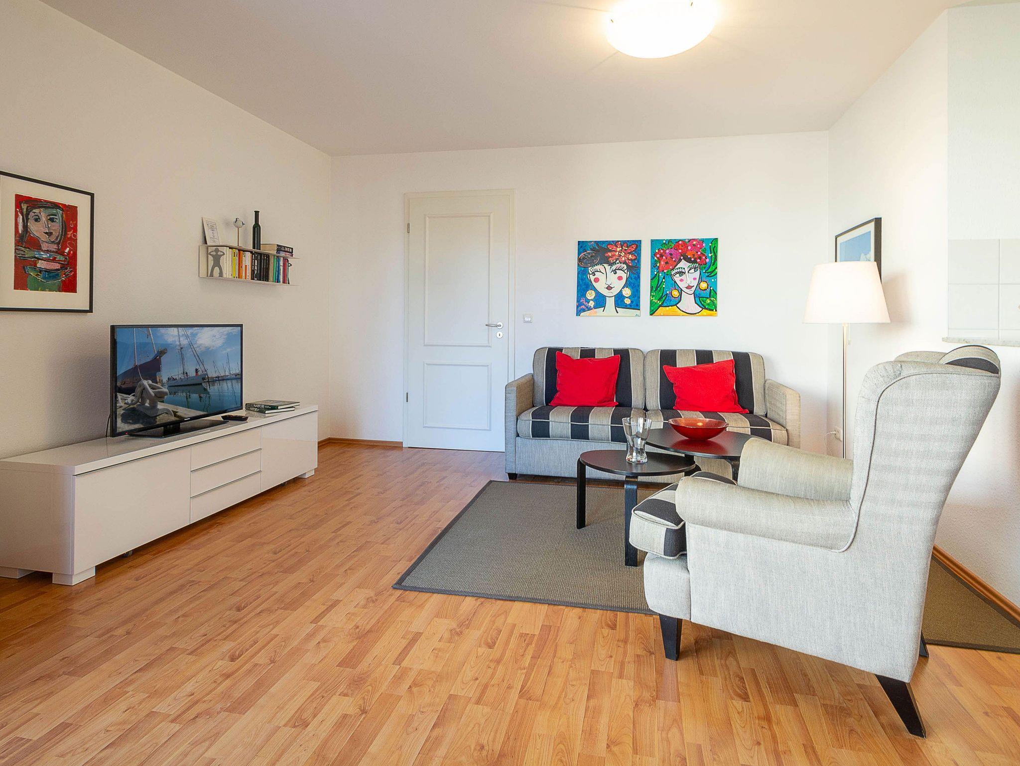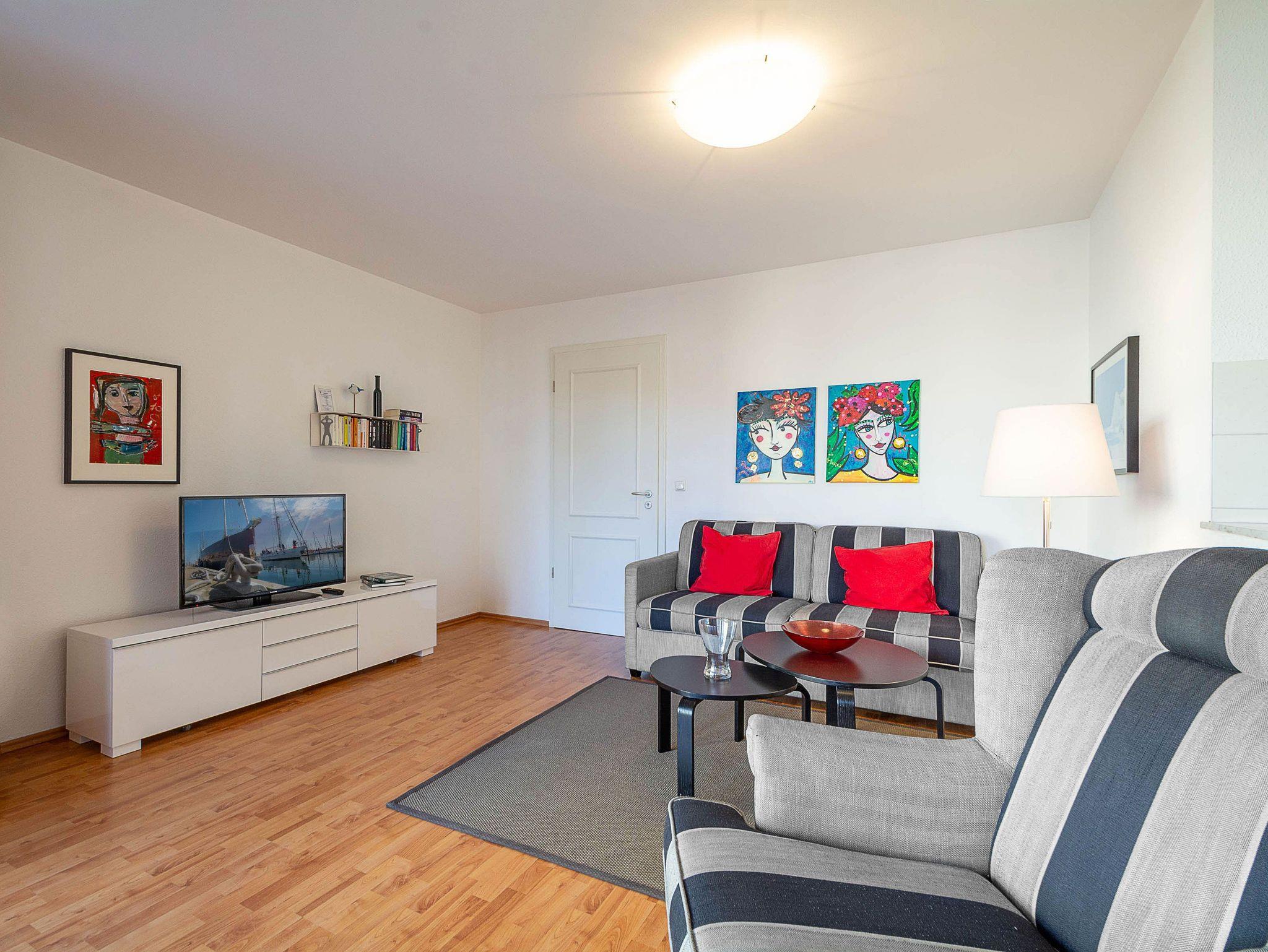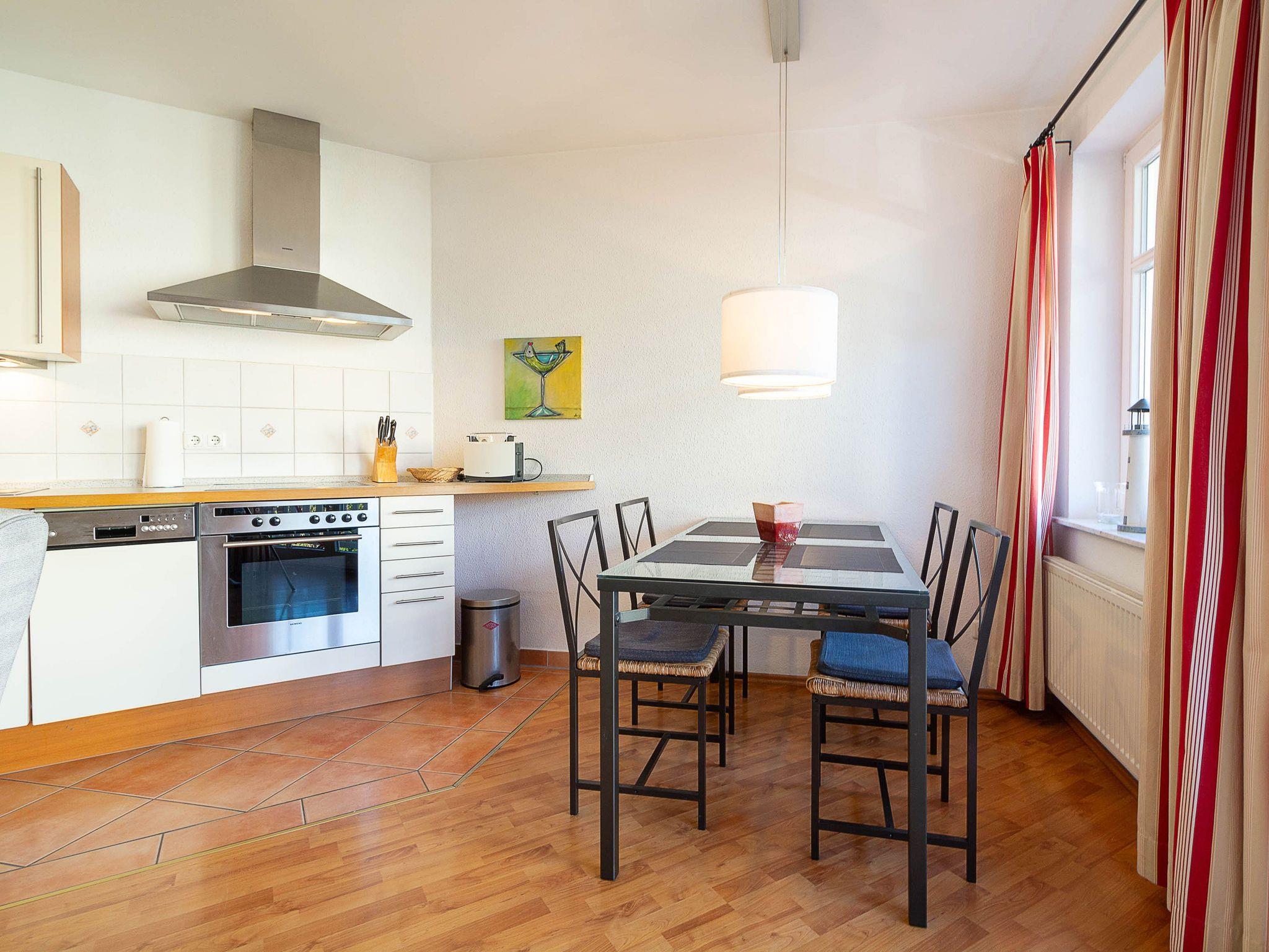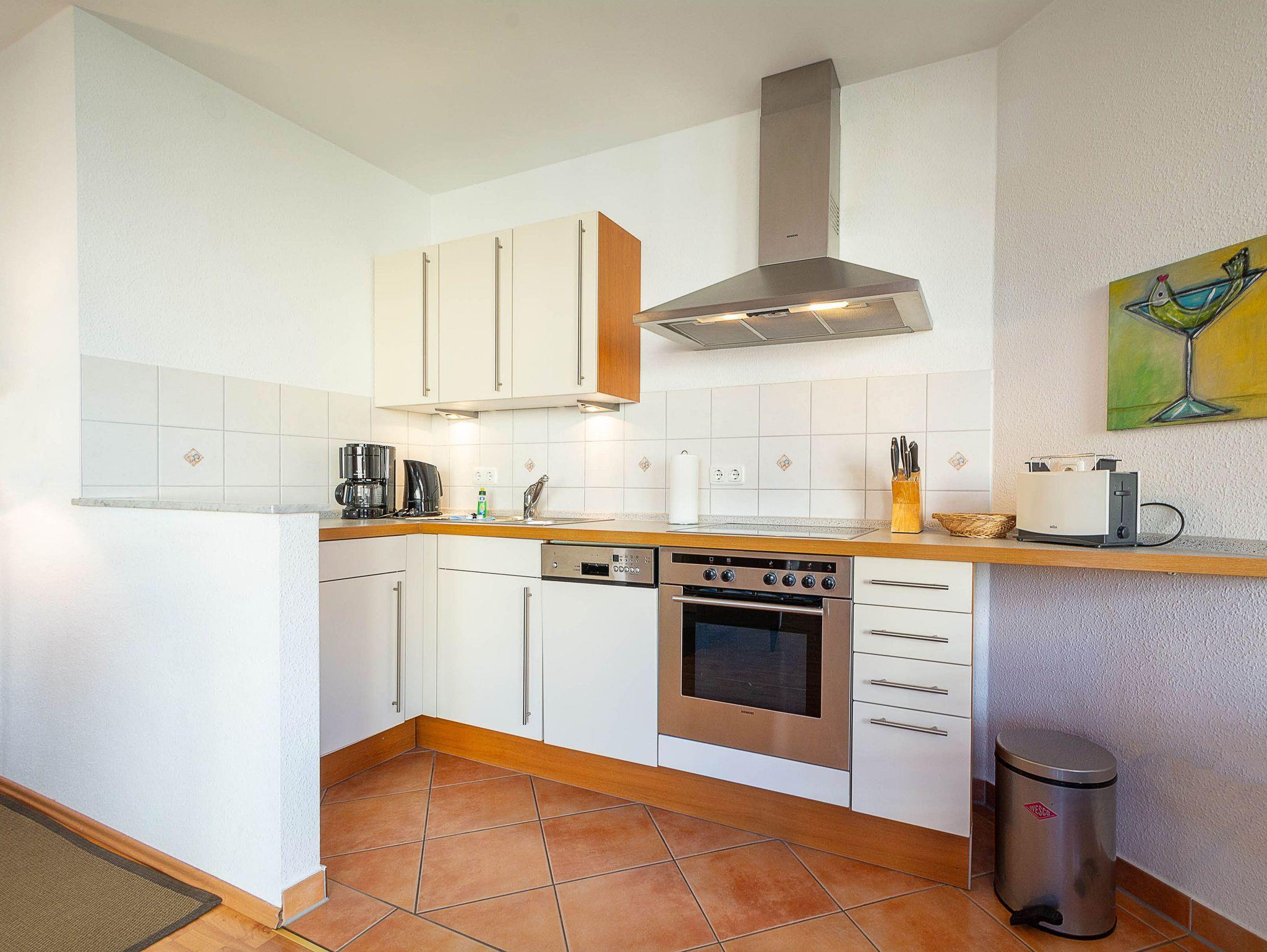 Sie wohnen in einer 65m² großen 3-Raum-Wohnung, die sich im 1. Obergeschoss der Villa Barbarossa befindet. Der helle freundliche Wohnraum ist ausgestattet mit Sitzecke, Essplatz sowie einem 38-Zoll-Flachbild-TV. Die anschließende offene Küchenzeile ist ausgestattet mit allen wichtigen Küchengeräten und -utensilien, die Sie für Ihr perfektes Dinner benötigen: Ein 4-Zonen-Ceranfeld, ein Backofen mit Dunstabzug sowie ein Geschirrspüler und ein Kühlschrank mit Gefrierfach befinden sich in der gut ausgestatteten Küche. Eine Kaffeemaschine, ein Toaster, ein Wasserkocher sowie ausreichend Geschirr vervollständigen die Kücheneinrichtung. Vom Wohnraum aus betreten Sie den möblierten Balkon, der nach Norden ausgerichtet ist. Ein Schlafzimmer mit Doppelbett 160 cm x 200 cm), ein Schlafraum mit Kojenbett (1,2m x 2,1m) und einem zweiten Balkon sowie das Bad mit Dusche und WC vervollständigen das Gesamtbild dieser Wohnung.