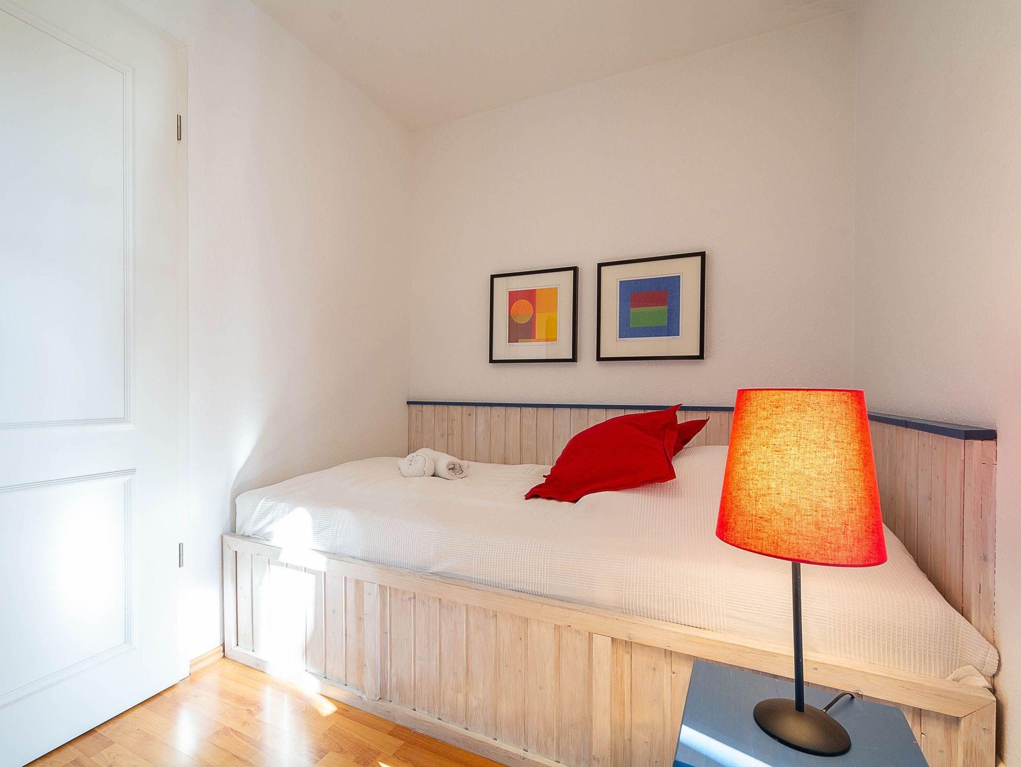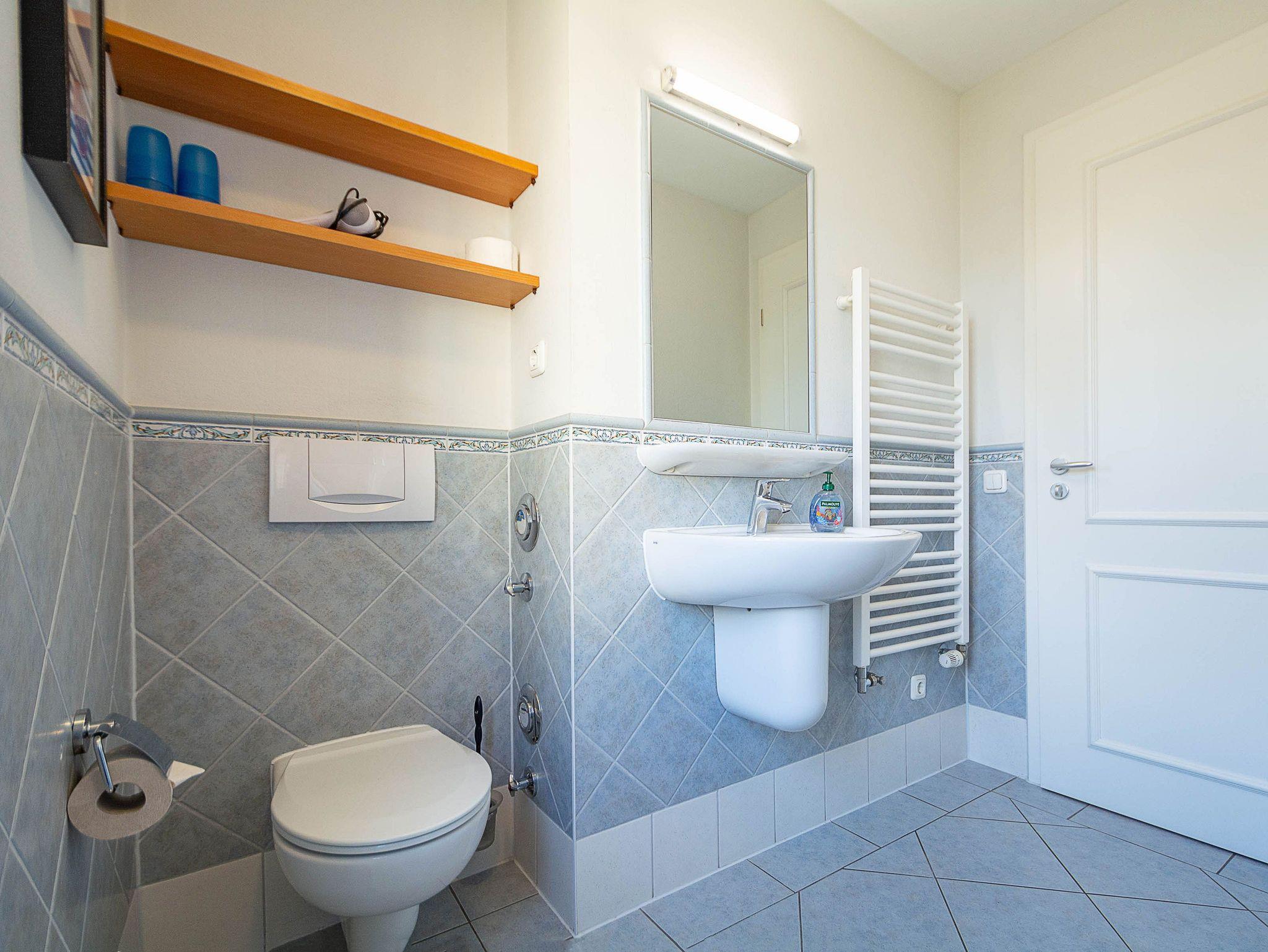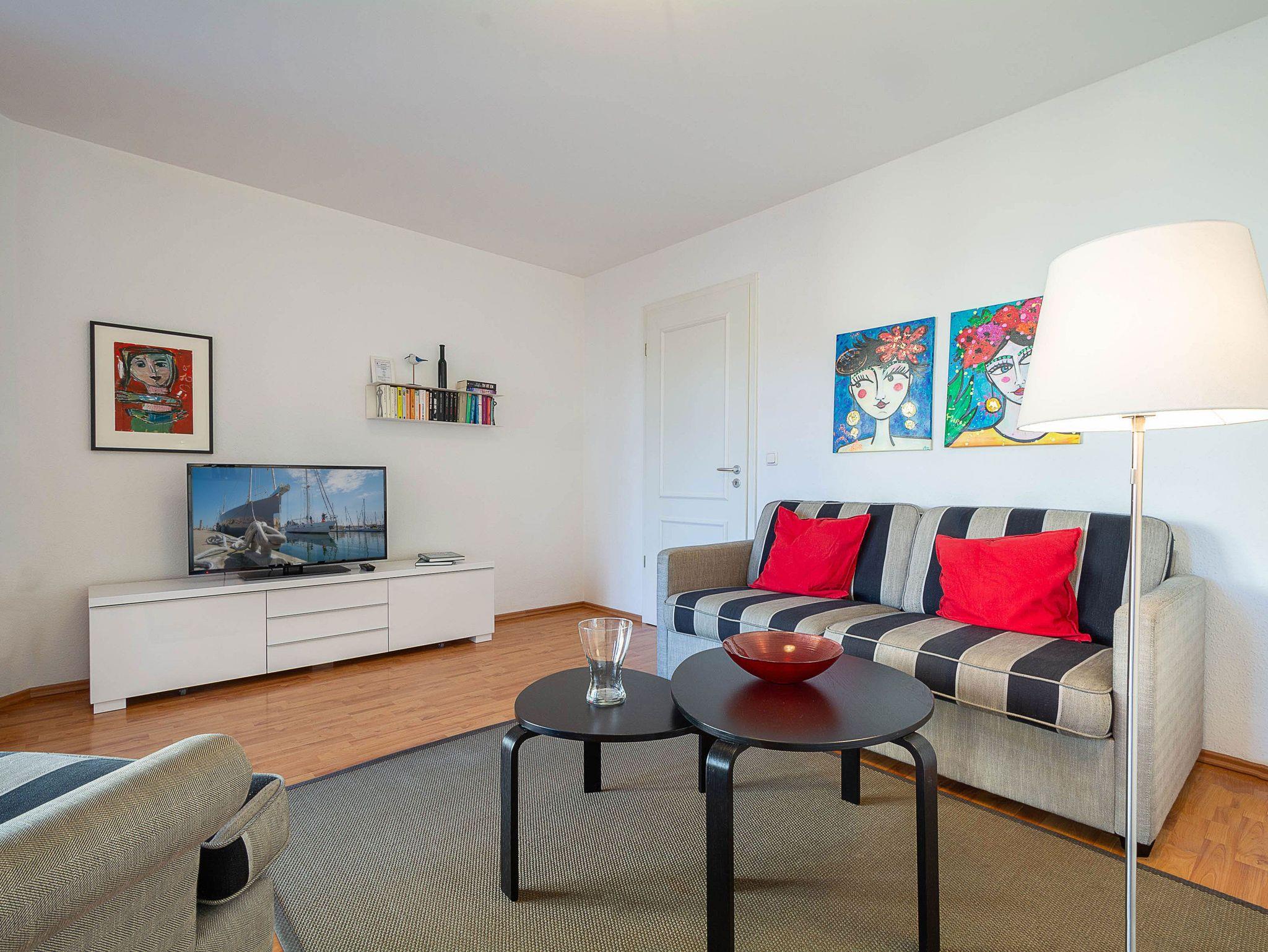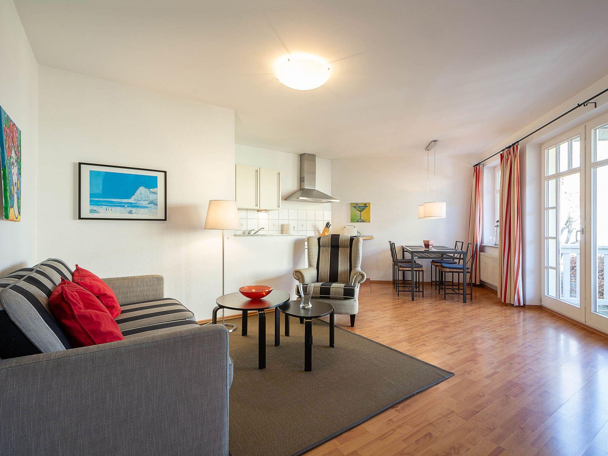Sie wohnen in einer 65m² großen 3-Raum-Wohnung, die sich im 1. Obergeschoss der Villa Barbarossa befindet. Der helle freundliche Wohnraum ist ausgestattet mit Sitzecke, Essplatz sowie einem 38-Zoll-Flachbild-TV. Die anschließende offene Küchenzeile ist ausgestattet mit allen wichtigen Küchengeräten und -utensilien, die Sie für Ihr perfektes Dinner benötigen: Ein 4-Zonen-Ceranfeld, ein Backofen mit Dunstabzug sowie ein Geschirrspüler und ein Kühlschrank mit Gefrierfach befinden sich in der gut ausgestatteten Küche. Eine Kaffeemaschine, ein Toaster, ein Wasserkocher sowie ausreichend Geschirr vervollständigen die Kücheneinrichtung. Vom Wohnraum aus betreten Sie den möblierten Balkon, der nach Norden ausgerichtet ist. Ein Schlafzimmer mit Doppelbett 160 cm x 200 cm), ein Schlafraum mit Kojenbett (1,2m x 2,1m) und einem zweiten Balkon sowie das Bad mit Dusche und WC vervollständigen das Gesamtbild dieser Wohnung.