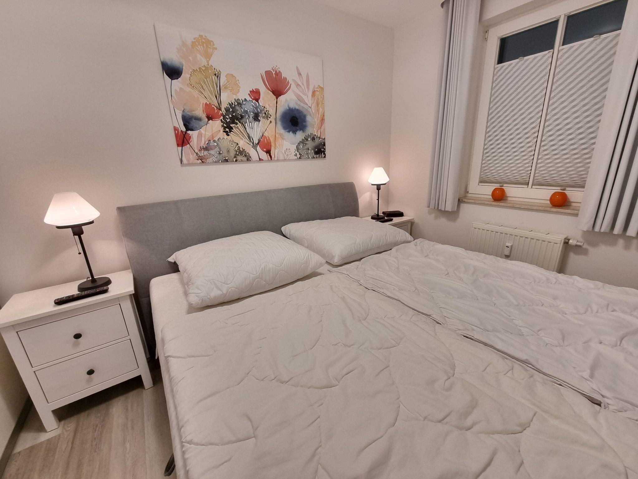 Das Schlafzimmer verfügt über ein Doppelbett und einen großen Kleiderschrank. Ein zweiter Flachbild-TV sorgt für zusätzlichen Komfort. Der Boden ist mit Laminat ausgelegt und Plissees und Vorhänge dienen zum Verdunkeln. Das Fenster des Schlafzimmers öffnet zum Atrium.