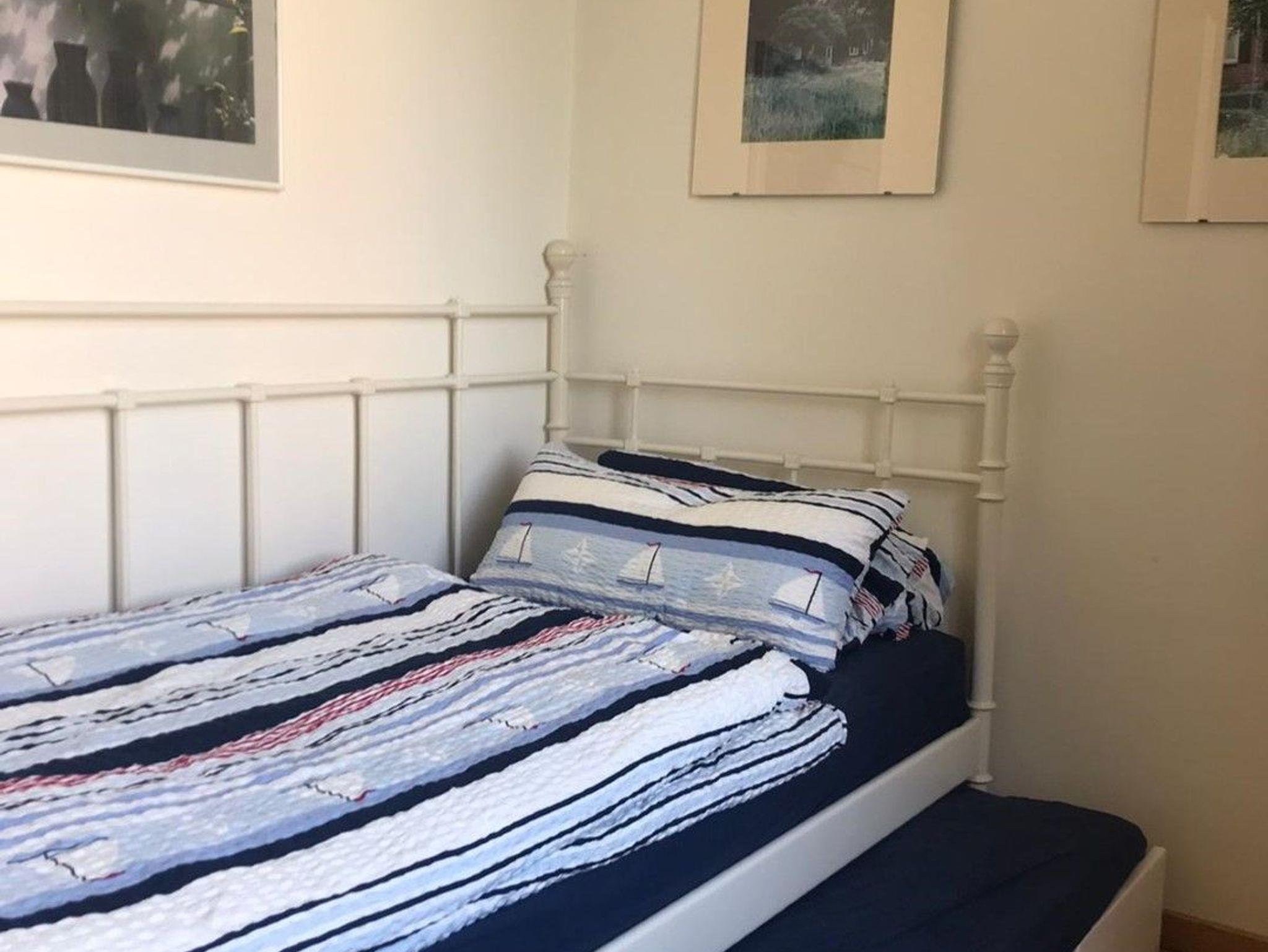 Das zweite Schlafzimmer beinhaltet ein Sandwichbett, dass sich tagsüber platzsparend zusammenschieben lässt.
