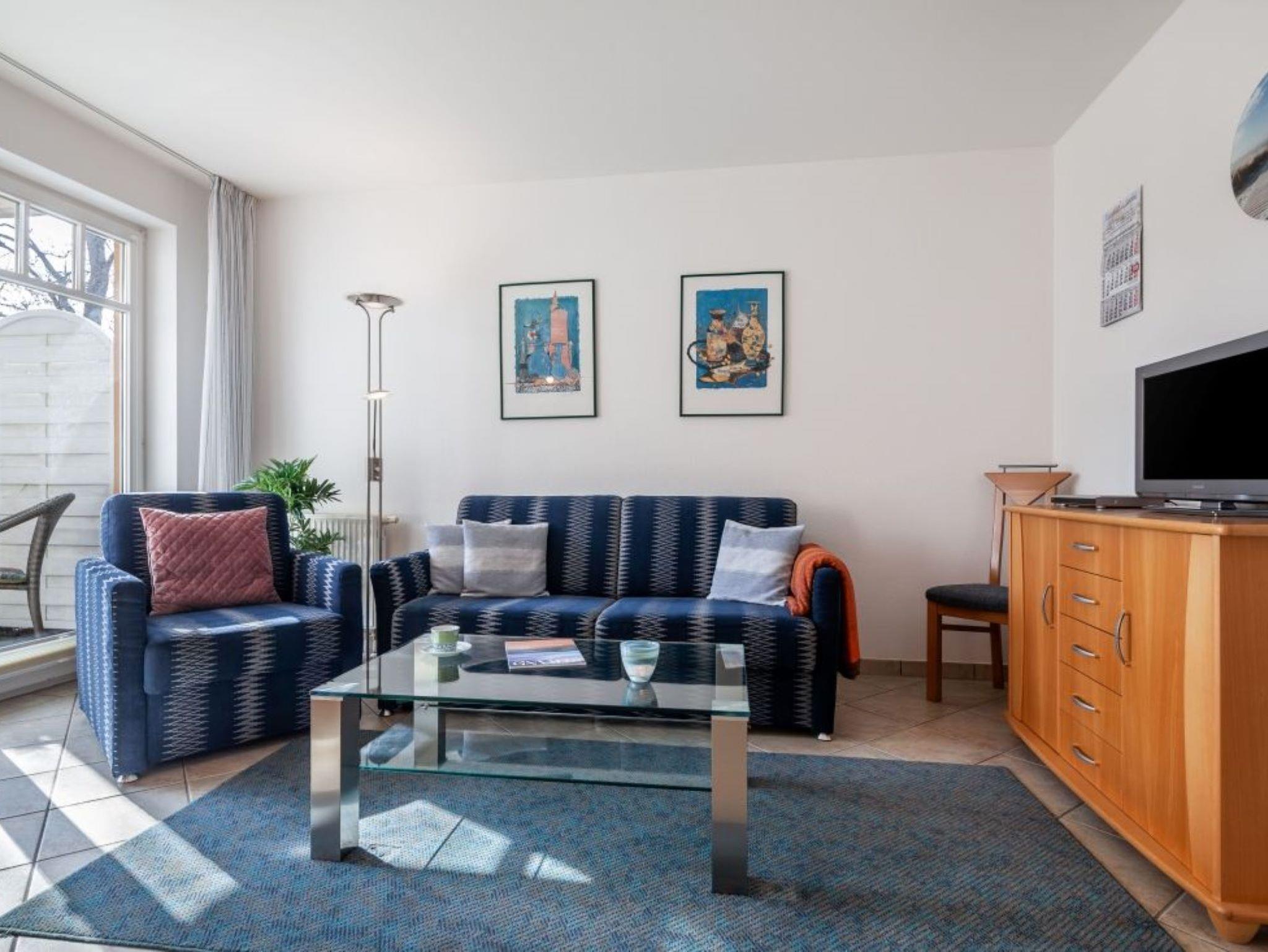 Nur 150 m vom Strand wohnen Sie in einer ca. 34 qm großen 2-Raum-Ferienwohnung.Das Wohnzimmer ist mit einer Couch, Couchtisch, Sessel, Anrichte, mit Kabel-TV (Flachbildschirm), Radio, Essbereich (Tisch und Stühle) und Küchenzeile ausgestattet. Die Terrasse mit Tisch und Stühle geht zur Südseite. Im Schlafzimmer stehen ein Doppelbett und eine kleine Anrichte. Die Küchenzeile wurde ausgestattet mit Mikrowelle, Kühlschrank, Kaffeemaschine, Geschirrspüler, Zwei-Platten-Kochfeld, Toaster und Wasserkocher. Das Bad mit Dusche und WC komplettiert die Wohnung.