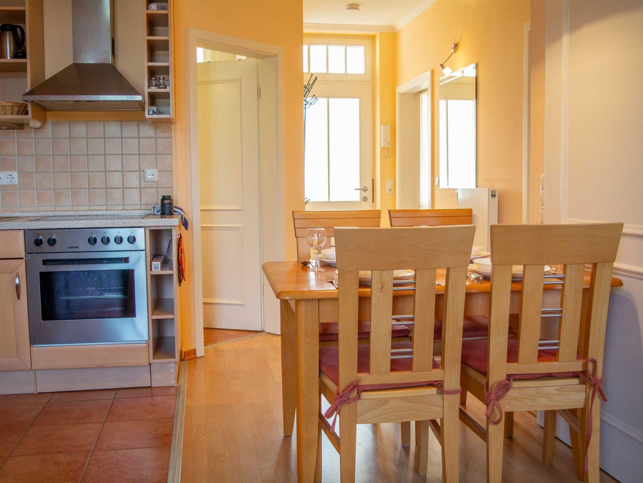 Das liebevoll eingerichtete 3-Raum-Appartement mit einer Gesamtfläche von 56 qm bietet Platz für 2 bis 4 Personen, befindet sich in der 3. Etage des Haupthauses und ist bequem über einen Fahrstuhl (Seiteneingang 1b) erreichbar. Es verfügt über einen Wohnbereich mit offener Küche (hier inklusive E-Herd mit Ceran-Kochfeld, Kühlschrank, Geschirrspüler, Dunstabzugshaube u.a.), ein Schlafzimmer mit Doppelbett, ein Schlafzimmer mit Tandembett, Sanitärbereich mit Badewanne und Duschmöglichkeit sowie je ein Balkon zur Ost- und Westseite. Zur Ausstattung gehört ein Flachbild-TV mit Radioempfangsteil. In den Allgemeinräumen des Hauses stehen Fahrradkeller, Münzwaschmaschine und -trockner zur Verfügung. Ein PKW-Stellplatz ist kostenfrei auf dem umzäunten Grundstück vorhanden. Die Benutzung des Schwimmbades sowie der beiden Saunen und der anderen Sport- und Fitnessräume ist inklusive!