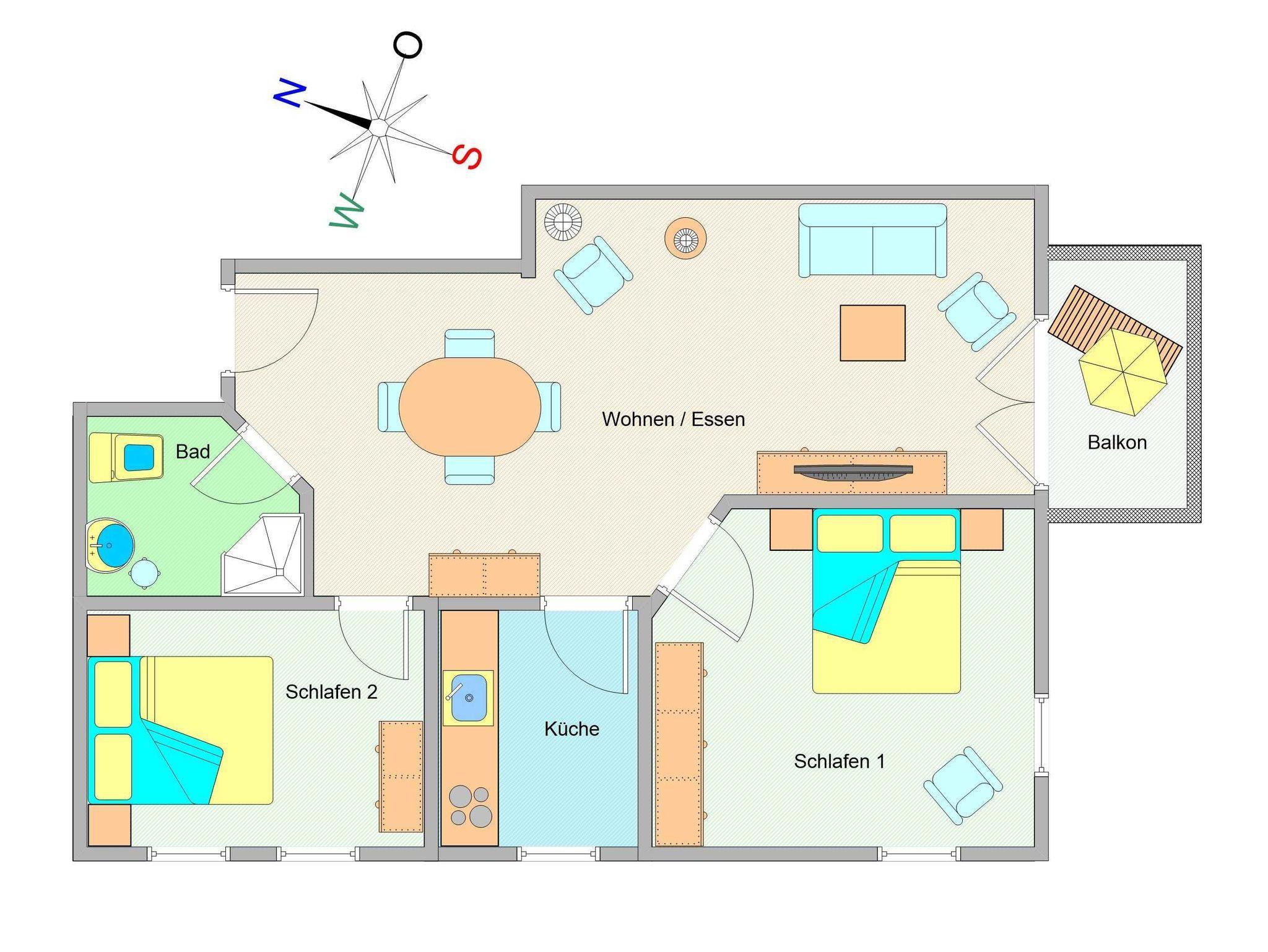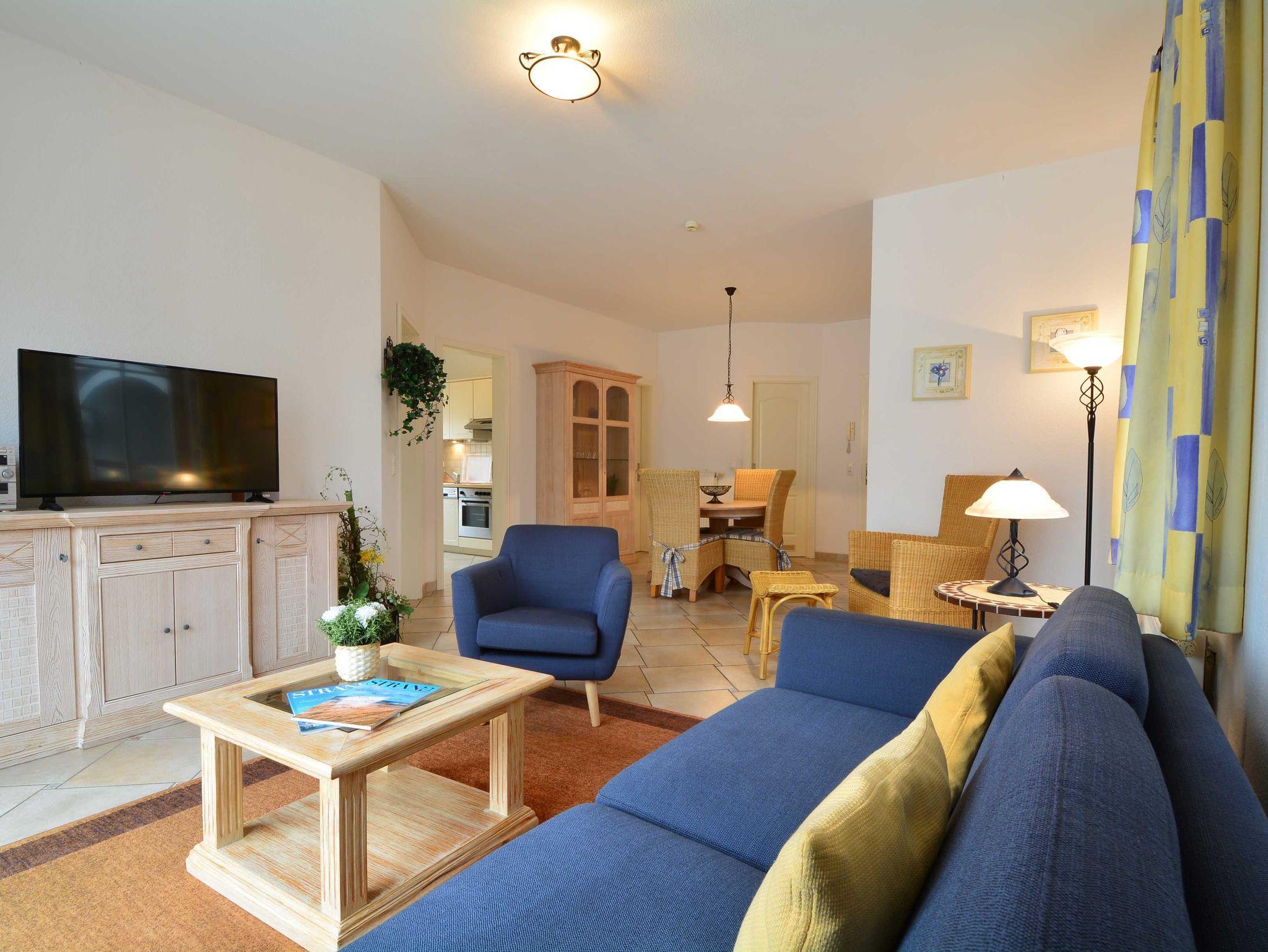 Sie wohnen in einer komfortabel eingerichteten 3-Raum-Wohnung von ca. 74 qm Größe, die im ersten Obergeschoss liegt und die über einen Tiefgaragenstellplatz (maximale Autohöhe 1,80 m) verfügt. Im Wohnzimer befinden sich neben einer bequemen Sitzgruppe und dem Essplatz Stereoanlage und das TV-Gerät. Die separate Küche verfügt über Herd mit Backofen, Geschirrspüler, Mikrowelle usw. Vom Wohnraum aus betreten Sie den Balkon, wo Sie den Tag ausklingen lassen können. Zwei Schlafzimmer jeweils mit Doppelbett sowie das Bad mit Dusche und WC vervollständigen das Gesamtbild dieser Wohnung.